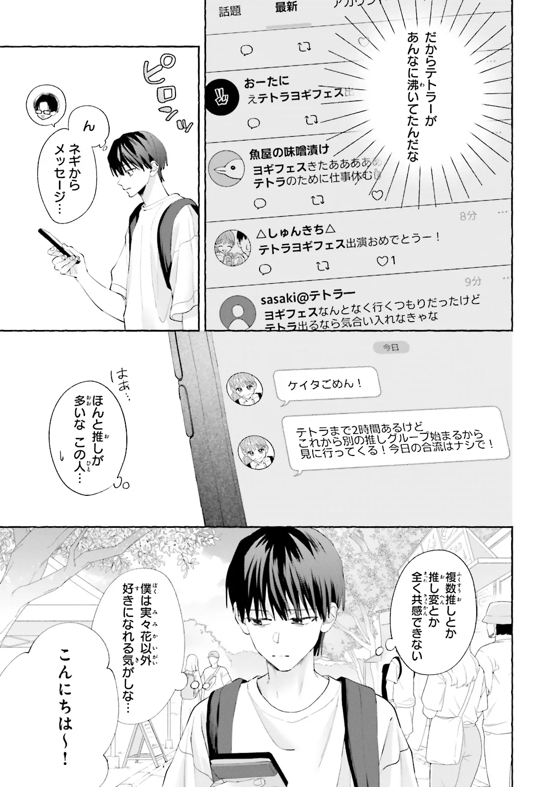 冴えない大学生のケイタは、アイドルグループ「テトラ」のセンター・実々花の“ガチ恋”オタク。叶わぬ恋だとわかりながらも、彼女を心の支えとして推し続けている。
