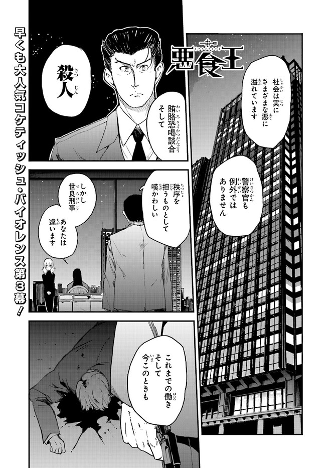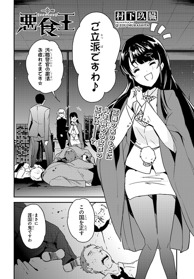気弱な高校生・小松ユーリは、異形の殺人鬼“傘立て”に襲われているところ、この世のすべての悪を食らうという“悪食王”と名乗る女性に命を助けられた。なんと悪食王は、傘立てに殺された姉・カレンにそっくりで――? 闇の住人たちが繰り広げるコケティッシュバイオレンス!