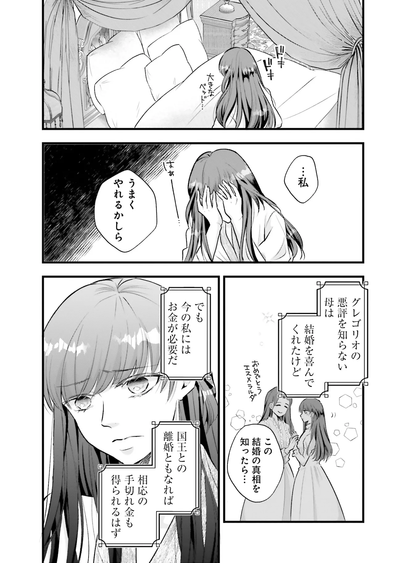 義理の姉の悪行をすべて押し付けられ「悪女」の噂が流れてしまっている公爵令嬢・エスメラルダは、義理の姉の身代わりとして近隣国の国王・グレゴリオのもとに嫁ぐことになる。「血染めの獅子王」と称されるグレゴリオとの縁談を恐れていたエスメラルダだったが、「3年間、子をなさなければ離縁ができる」との決まりを知り、白い結婚を貫き通すことを決意する。しかし、エスメラルダの計画は結婚初夜から大ピンチで……!?「今宵、私の子を孕んでもらおう」素直になれない悪女(冤罪)令嬢と、冷酷無慈悲な国王の、濃厚えっちな閨の攻防戦、開幕!!