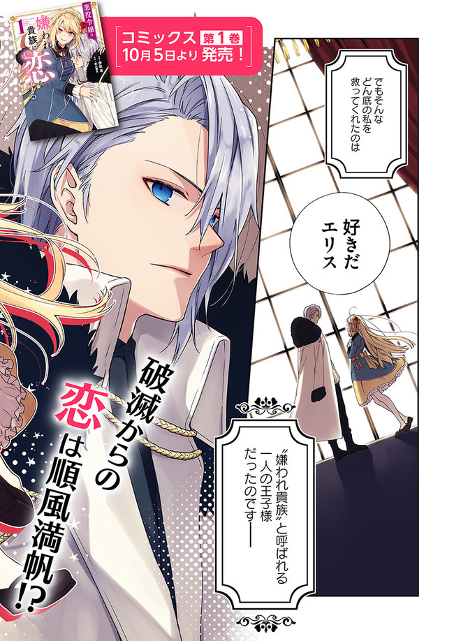 乙女ゲームの徹夜プレイ明けに交通事故に遭い、異世界に、しかもゲーム内の悪役令嬢エリスとして転生してしまった愛川絵里。 BAD ENDを回避すべく「誰からも好かれる」エリスになろうと奔走した彼女だったが、やはり運命を変えることは出来ず……。 王子に捨てられ、さらに暴漢に襲われ人生が終わろうとしたとき、一人の青年が現れ――。 破滅へ向かう運命を変えるのは、日陰者の王子様? 転生悪役令嬢の復活恋愛ファンタジー!