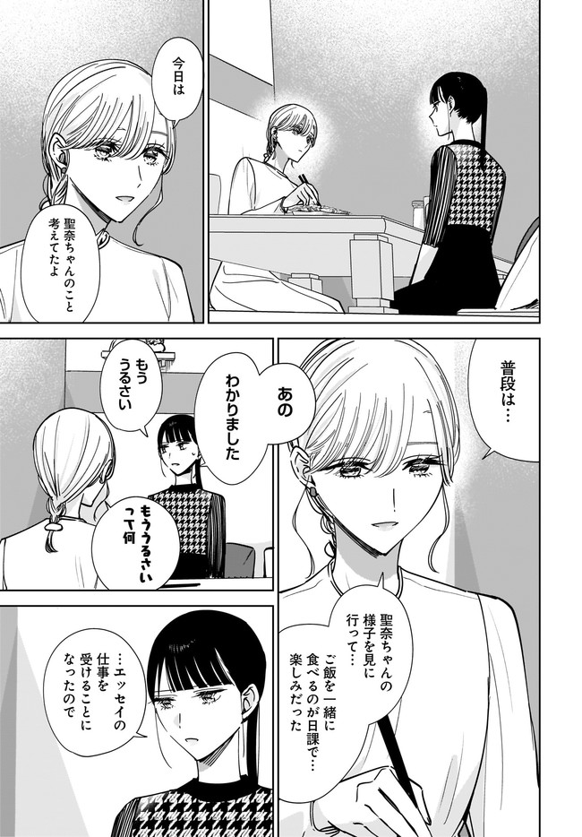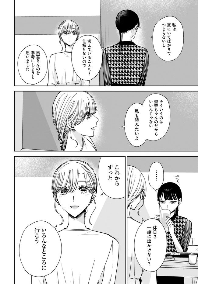 小説家である聖奈は、実の姉である優奈に恋愛感情のようなものを抱えていた。 姉が離れて「喪失感」に耐え切れなくなったことにより、小説が書けなくなった。 姉からのメッセージすら応えられずにいた。 まともな生活すらままならない聖奈を、姉の親友である菊がしつこく世話を焼きに訪ねてくる。 聖奈は、菊のことを苦手だと思いながらも、つい流されてしまう。 そんな菊にも、抱える感情があった――。 二人の成人女性が抱える恋のお話。 コミックス1巻12月25日発売!
