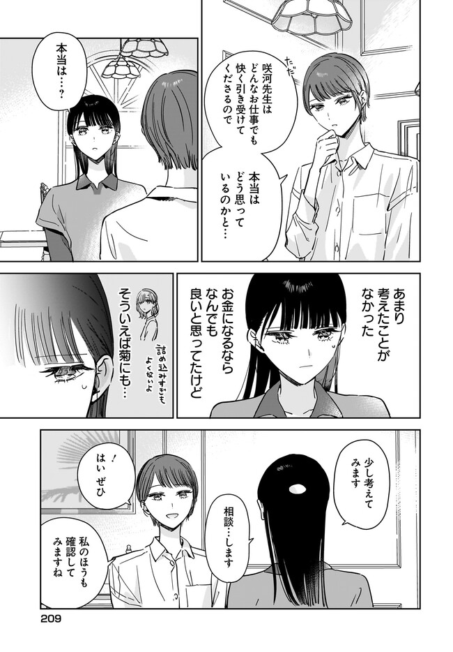 小説家である聖奈は、実の姉である優奈に恋愛感情のようなものを抱えていた。 姉が離れて「喪失感」に耐え切れなくなったことにより、小説が書けなくなった。 姉からのメッセージすら応えられずにいた。 まともな生活すらままならない聖奈を、姉の親友である菊がしつこく世話を焼きに訪ねてくる。 聖奈は、菊のことを苦手だと思いながらも、つい流されてしまう。 そんな菊にも、抱える感情があった――。 二人の成人女性が抱える恋のお話。 コミックス1巻12月25日発売!