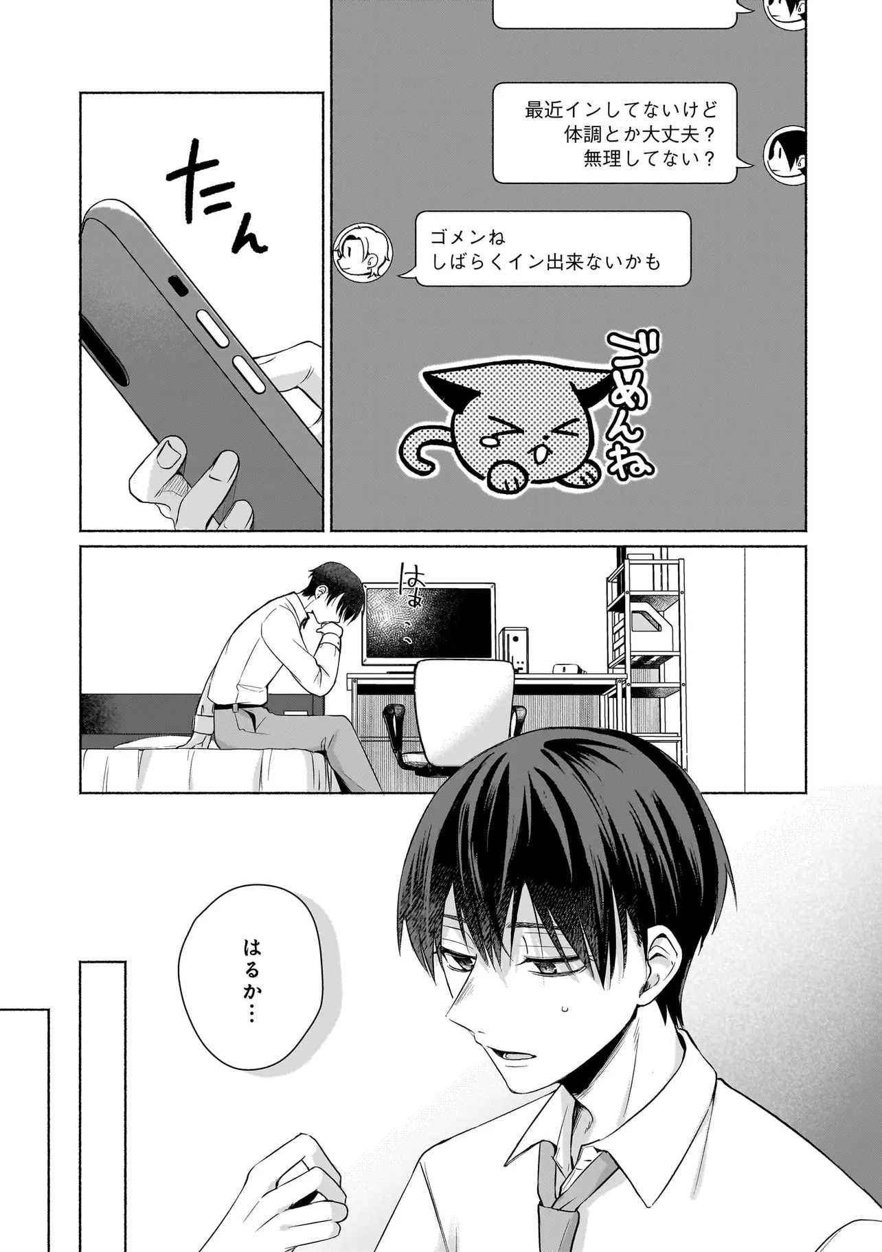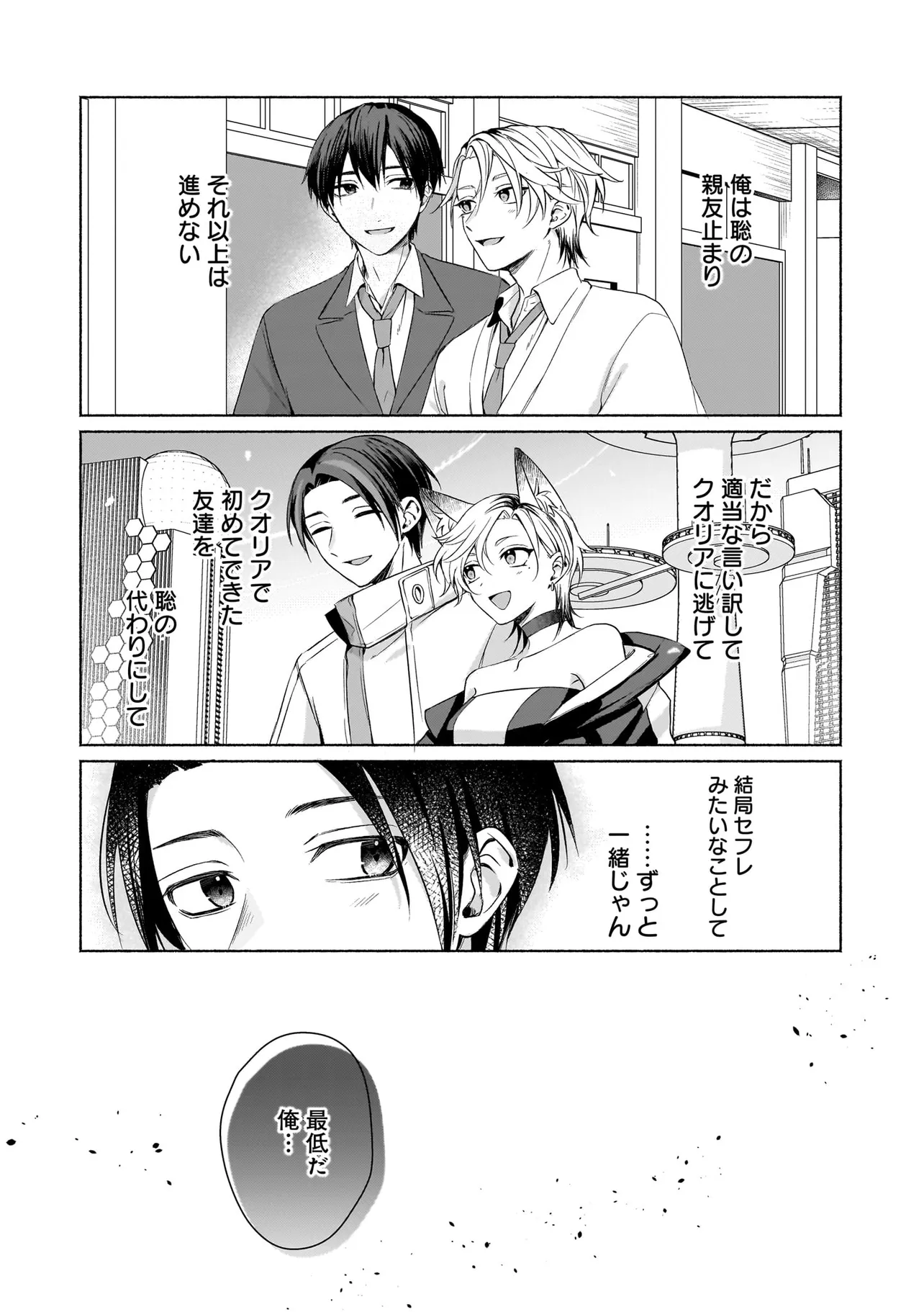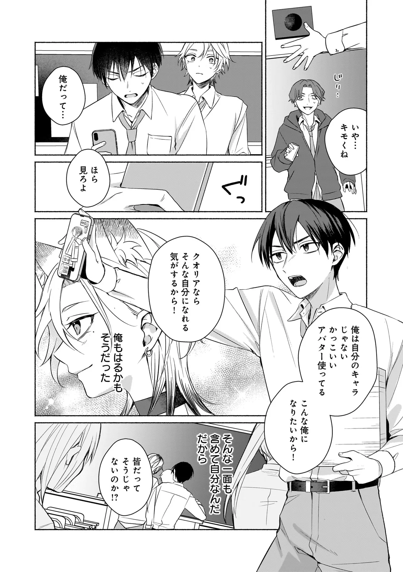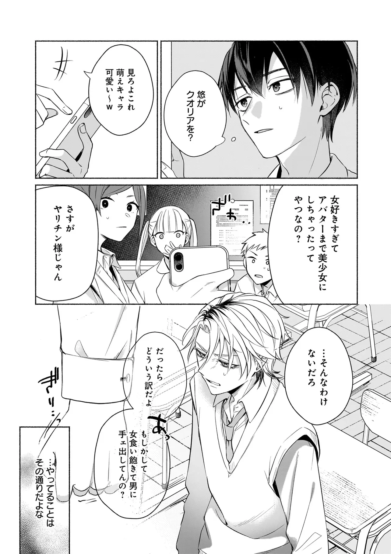 幼馴染の悠はモテ男として有名だったが、聡は童貞。なんとなく悔しい思いをクオリア仲間の「はるか」(女アバターで中身は男)に打ち明けたところ、「男同士だしお試しで付き合ってみる?」と持ち掛けられる。しかし実は「はるか」の正体は幼馴染の悠で…。