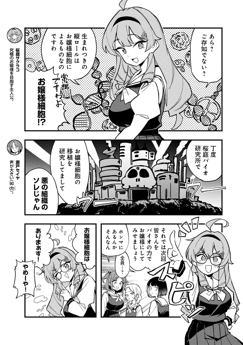 お嬢様養成学校・ネオ茂木鳥学園の入学式を迎えた桜庭サクラコ。犬を仲間にして校内に入ろうとするが、先生に呼び止められて犬と戦うことになる。辛くも勝利し、サクラコはともに究極のお嬢様を目指して励むことになる少年少女たちと出会う。
