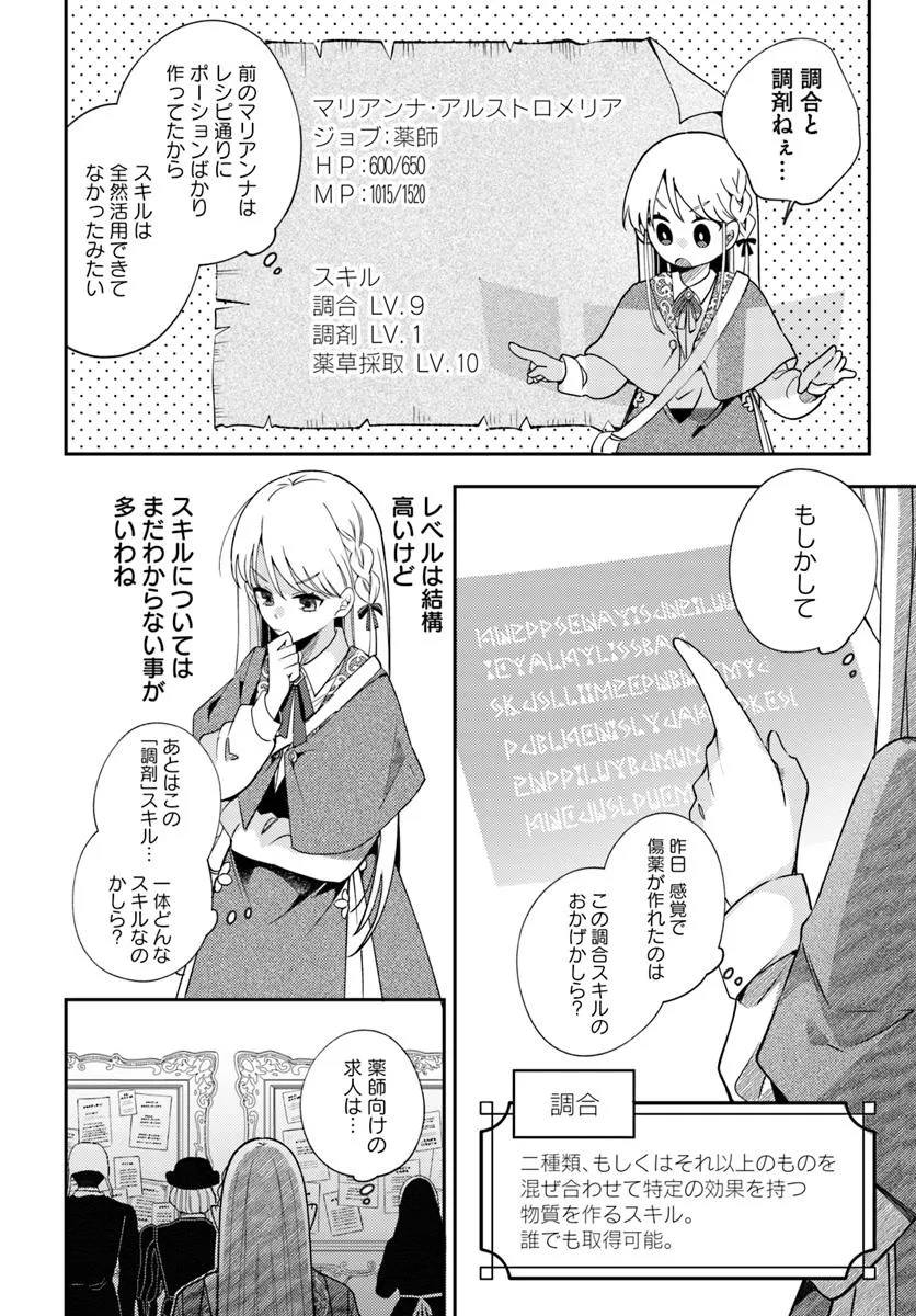 日本で薬剤師として働いていた主人公は、異世界で王宮専属薬師・マリアンナに転生する。