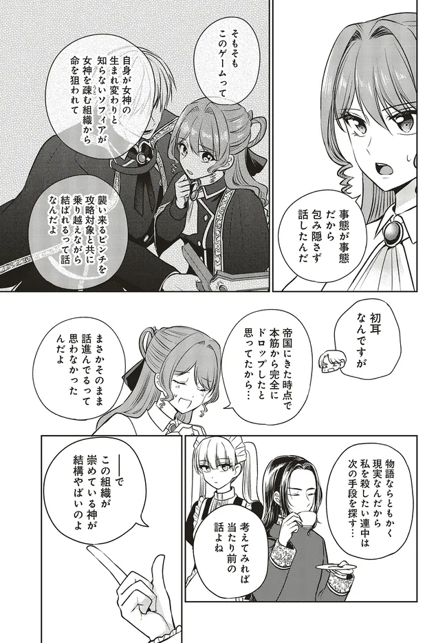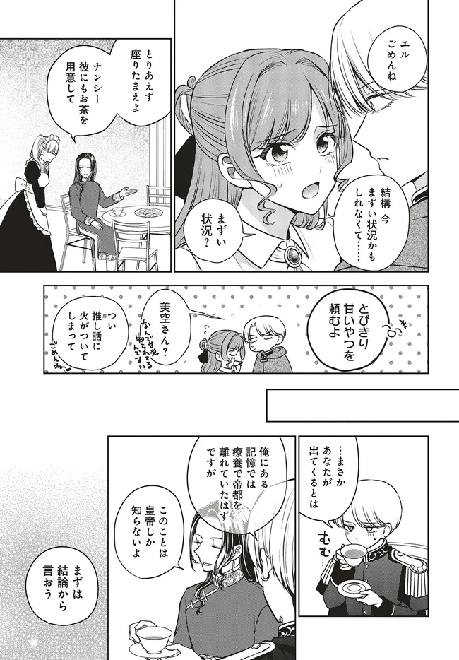 ゲーム会社に勤務する菊名美空は、30歳にして乙女ゲーム「七色の月」のプロデューサーを務める敏腕社員。 だがある日、メンズアイドル「Polaris7」のメンバーを乗せた車が自身のせいで事故に巻き込まれたことにショックを受け、階段から足を踏み外してしまう。 ――そして気が付けば「七色の月」主人公のソフィアに転生していた! さらに「Polaris7」所属の最推しアイドル・妙蓮寺エル(18)が転生した皇子と婚約者になってしまい……!? これはファンとして大人として、推しアイドルを守護らなきゃ!! 乙女ゲー転生&(精神的)年の差ラブコメファンタジー、開演!!