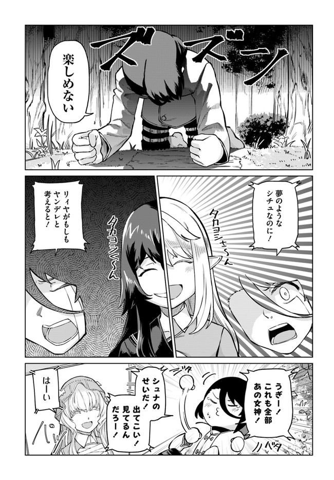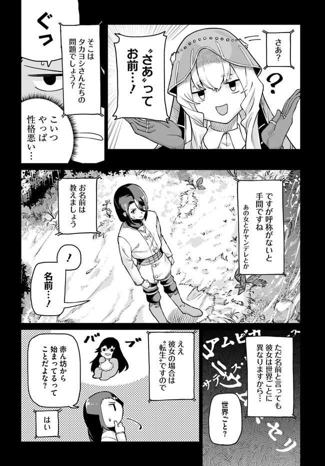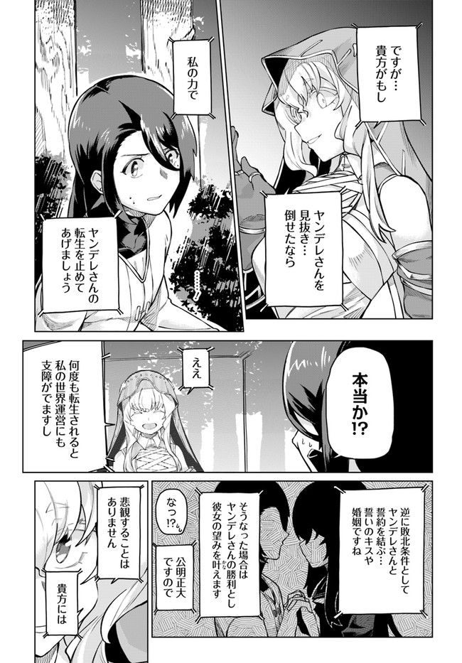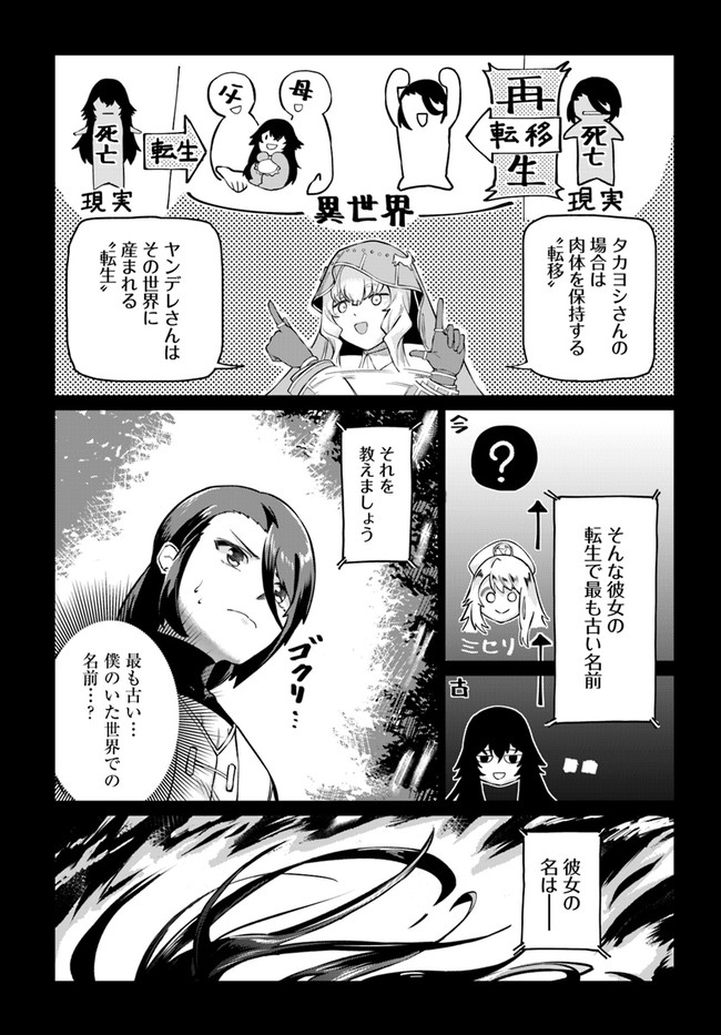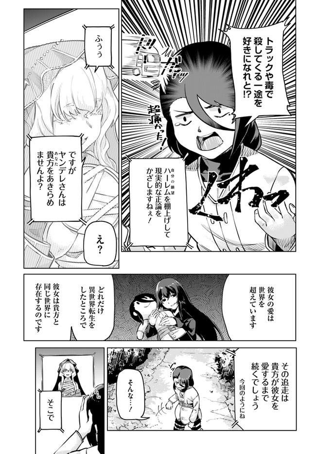 トラック事故により異世界転移したタカヨシは、いつの間にか身につけていたチート能力で人々を苦しめる邪竜を討伐。世界を救った英雄として大勢の女の子に言い寄られるという期待通りの展開を向かえつつあった。さらに仲間の美少女神官からも呼び出され、これはもうハーレムルート突入間違いなし……のはずがなにやら不穏な雰囲気になってきて――。 世界線を超える愛と運命に翻弄される、異世界ヤ○デレファンタジー!