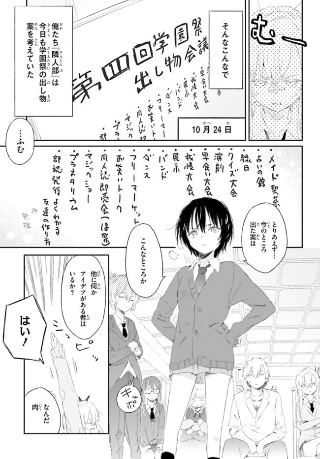 僕は友達が少ない 活動記録46 第三回学園祭出し物会議 僕は友達が少ない 投稿者 admin - 3年 前に 幸せな読書漫画 僕は友達が少ない 活動記録46 第三回学園祭出し物会議 , いいねと共有ボタンをクリックすることを忘れないでください. Manga 僕は友達が少ない 常に更新されます 無料コミック Comic Top. 他のマンガの更新を読むことを忘れないでください。 マンガコレクションのリスト 無料コミック Comic Top マンガリストメニューにあります. お友達と共有しましょう! Facebook Twitter Pinterest Whatsapp 前のエピソード すべての章 次のエピソード リスト ページング Loading.. 前のエピソード すべての章 次のエピソード リスト ページング お友達と共有しましょう! Facebook Twitter Pinterest Whatsapp お気に入りに追加に続く 1 人 僕は友達が少ない 友達の少ない羽瀬川小鷹は、ある時、美少女だがいつも不機嫌そうにしているクラスメイトの三日月夜空が一人で楽しげに喋っているのを目撃する。「もしかして幽霊とか見えたりするのか?」「友達と話していただけだ。エア友達と!」「(駄目だこいつ……)」夜空の無駄な行動力で友達を作るための部まで作ってしまうが、集まってくるのは残念な美少女ばかりで!? 二度にわたりTVアニメ化された大人気ライトノベルをコミカライズ! いたち(著者)ブリキ(キャラクター原案)平坂読(原作) アニメ化ラノベ原作ラブコメ男性向け