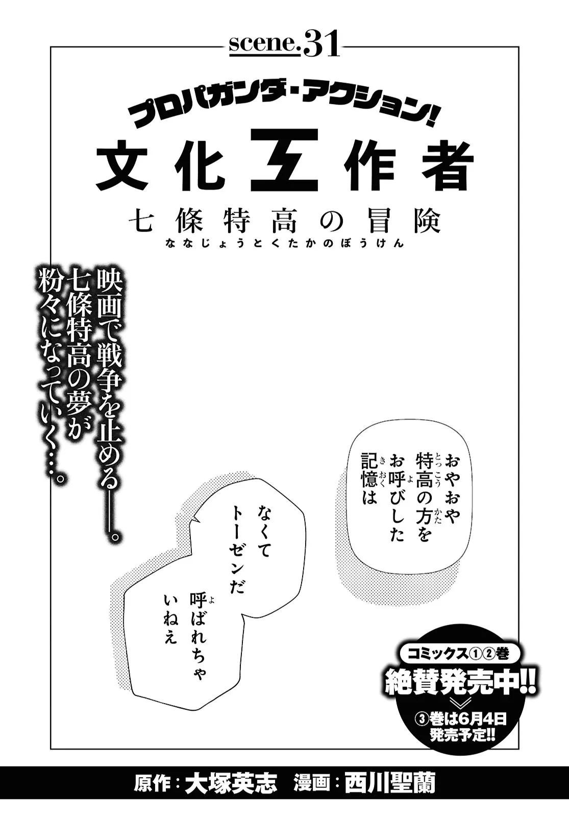 “文化工作者 七條特高の冒険” scene.31 文化工作者 七條特高の冒険 投稿者 admin - 7か月 前に 幸せな読書漫画 “文化工作者 七條特高の冒険” scene.31 , いいねと共有ボタンをクリックすることを忘れないでください. Manga 文化工作者 七條特高の冒険 常に更新されます 無料コミック Comic Top. 他のマンガの更新を読むことを忘れないでください。 マンガコレクションのリスト 無料コミック Comic Top マンガリストメニューにあります. お友達と共有しましょう! Facebook Twitter Pinterest Whatsapp 前のエピソード すべての章 次のエピソード リスト ページング Loading.. 前のエピソード すべての章 次のエピソード リスト ページング お友達と共有しましょう! Facebook Twitter Pinterest Whatsapp お気に入りに追加に続く 0 人 文化工作者 七條特高の冒険 「映画で戦争を止める!」戦時下の魔都・上海で、偽装映画工作は始まった!大塚英志+西川聖蘭コンビが贈る、プロパガンダ・アクション・コメディ! ヤングエースで好評連載中!! 大塚英志(原作)西川聖蘭(漫画) アクションコメディサブカルヤングエース問題作