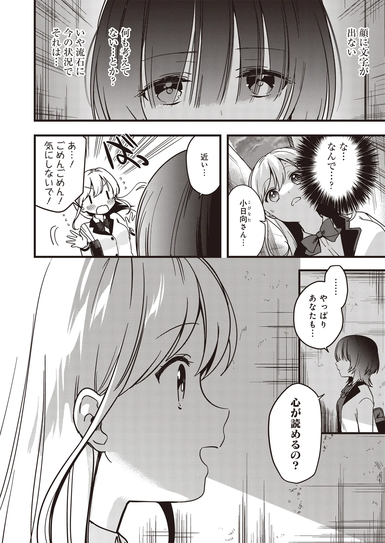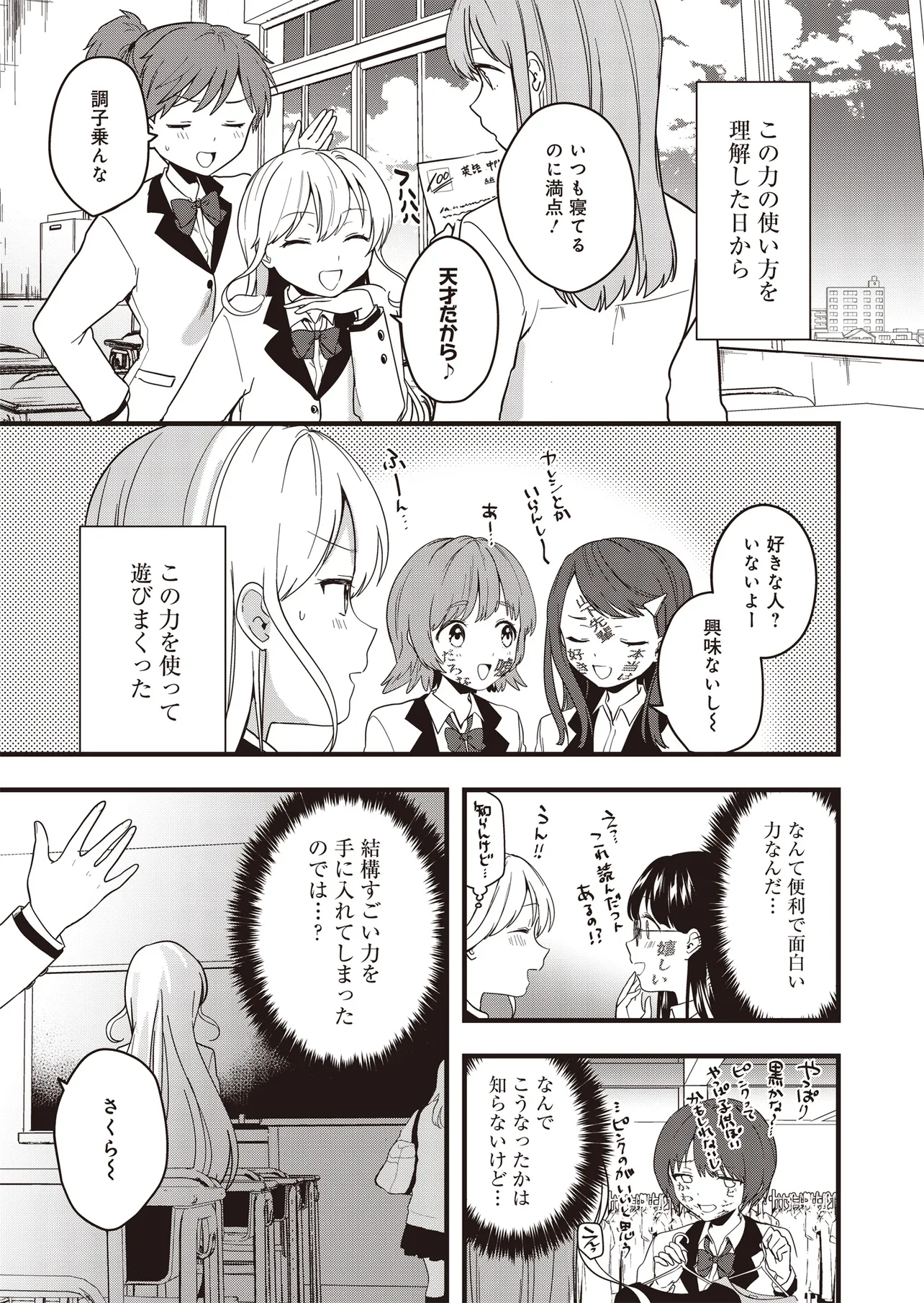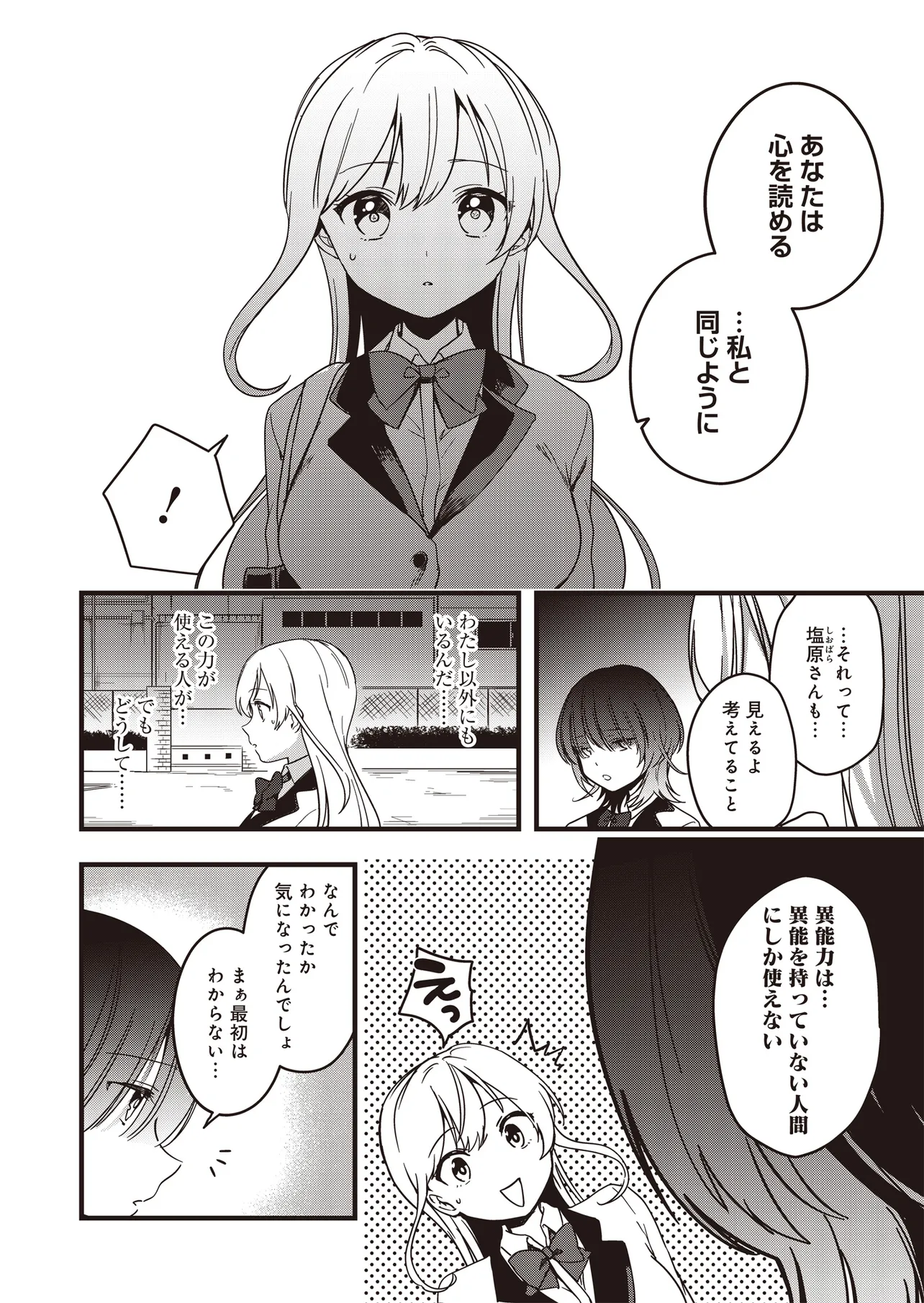 高校入学初日に突然、「人の考えが読める」異能力に目覚めた小日向さくらは、この能力を使い悠々自適な学生生活を送っていた。そんなある日、クラスメイト・塩原咲も同じ能力をもっていること告げられる。彼女との出会いをきっかけに、さくらの日常は姿を変えていく――。