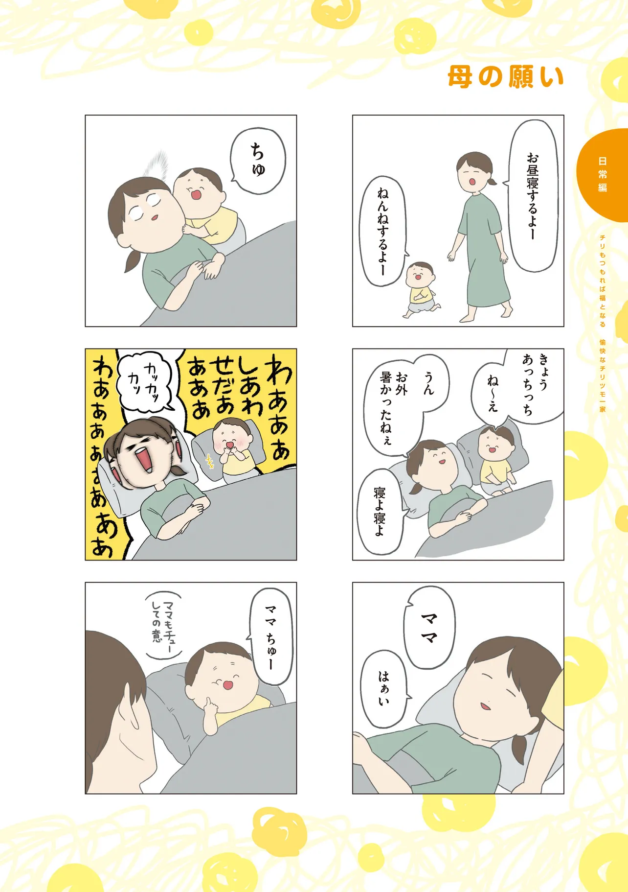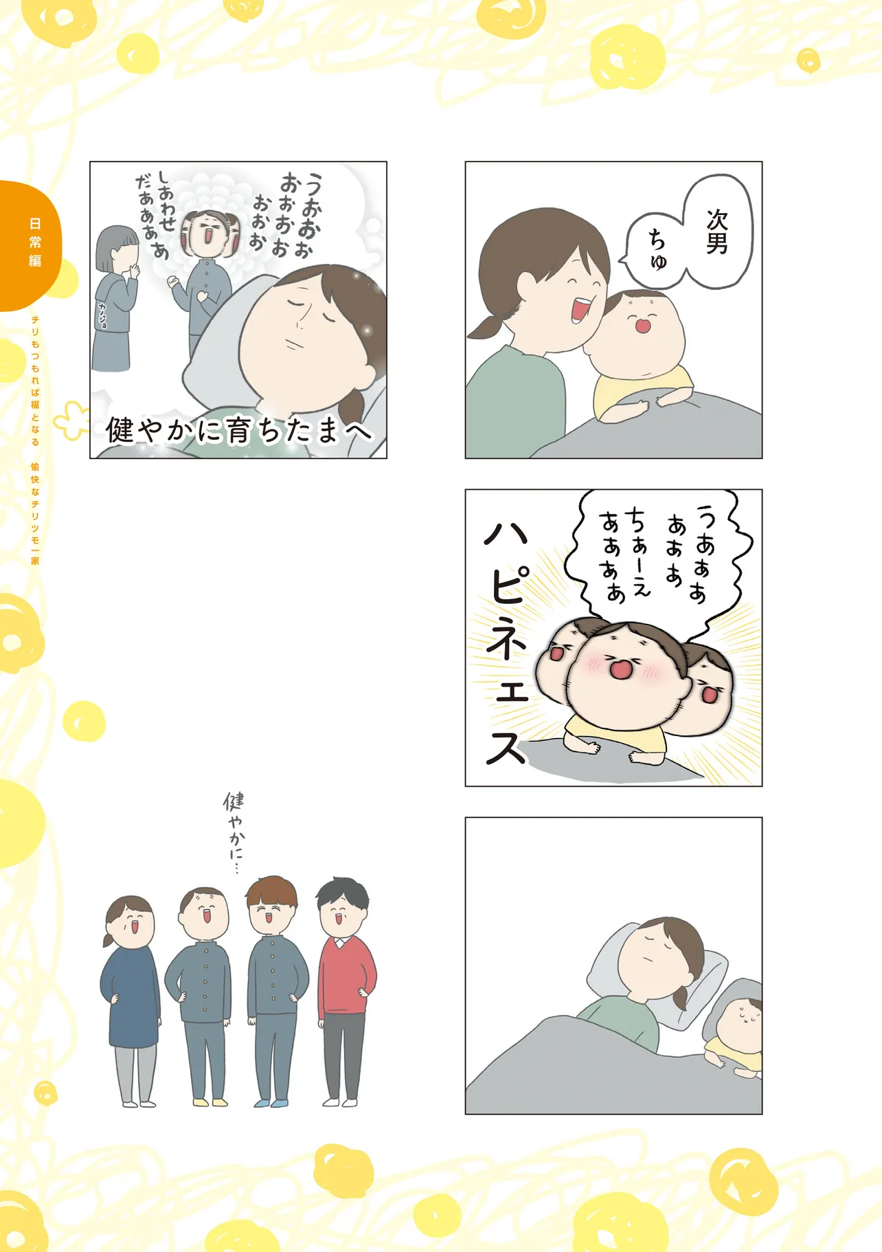 2児の母である、著者・チリツモルをとりまく、個性的な家族の面白エピソードを盛りだくさんに詰めこみました! どんなに雑に扱われてもめげない家族想いの夫、クールだけど優しい長男くん、可愛くて一番変人の次男くん、そして幸せすぎると変顔になってしまう母。 そんな面白い一家の日常を覗いてみませんか?