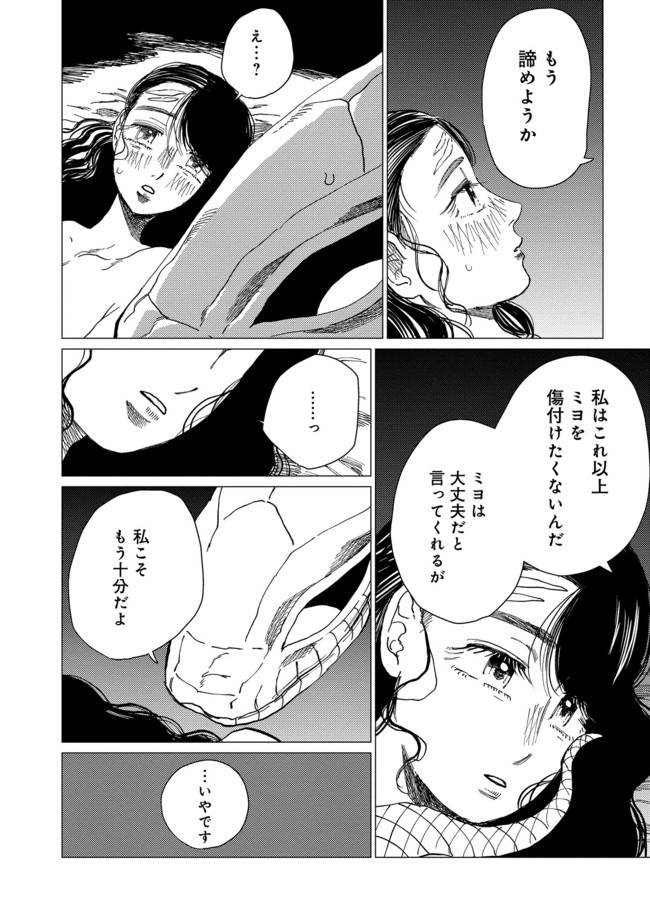 恐ろしい大蛇を前に怯えるミヨだったが、生活をともにしていくうちに気持ちに変化が。