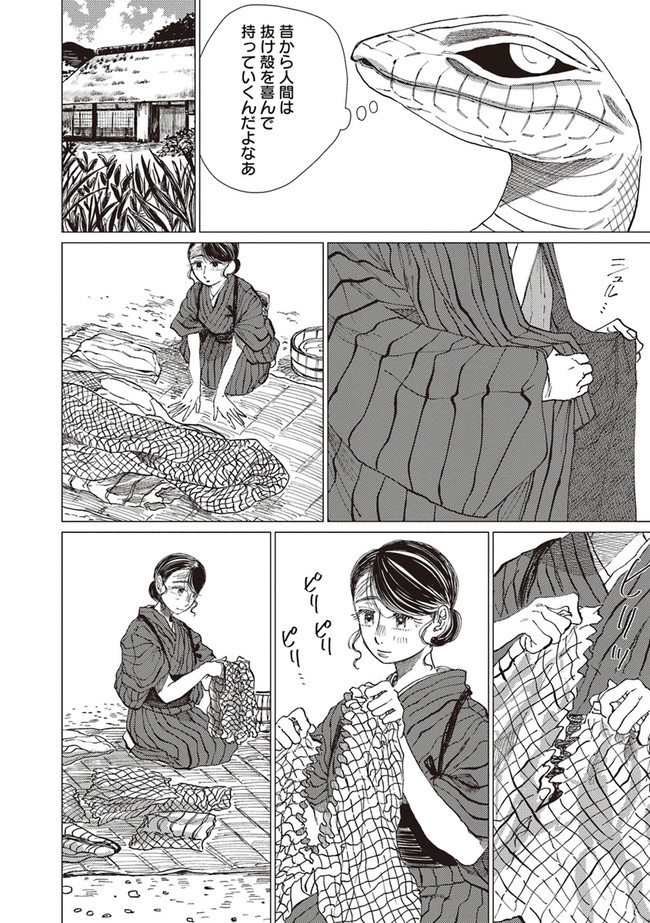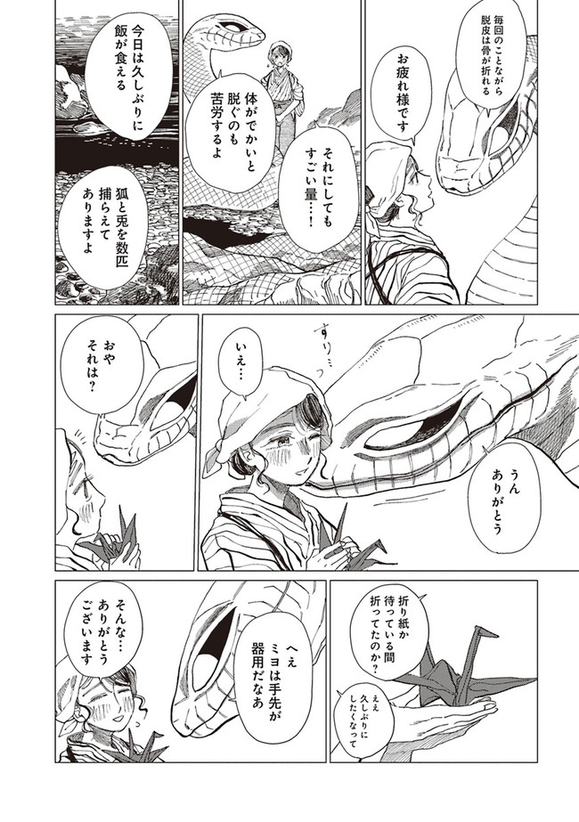 恐ろしい大蛇を前に怯えるミヨだったが、生活をともにしていくうちに気持ちに変化が。