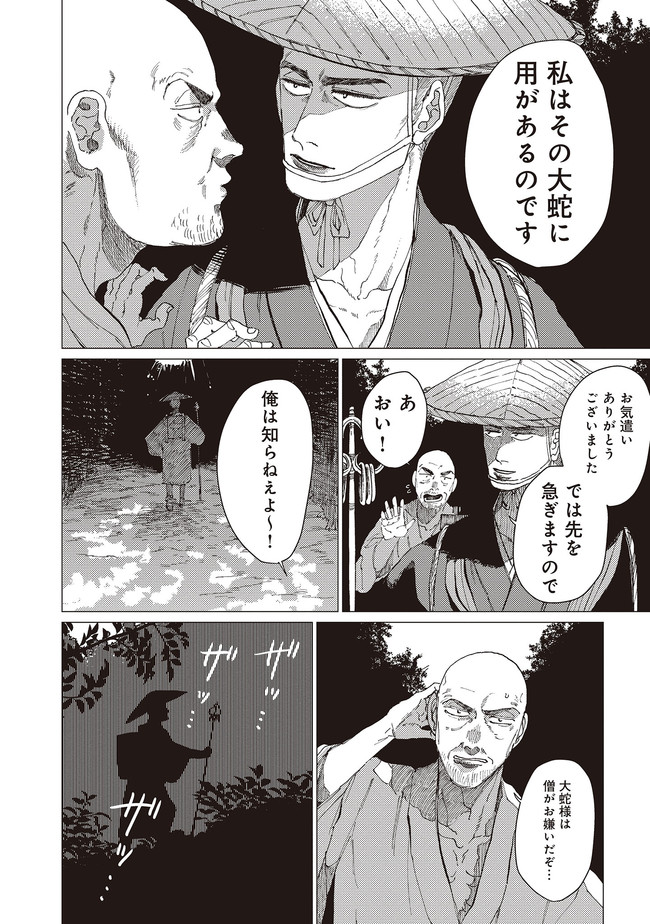 「傷モノの娘だ。ちょうどよい」そう言われ、山の主である大蛇に供物として嫁ぐことになったミヨ。
