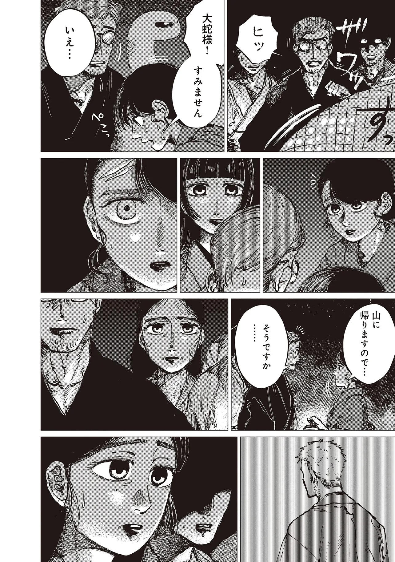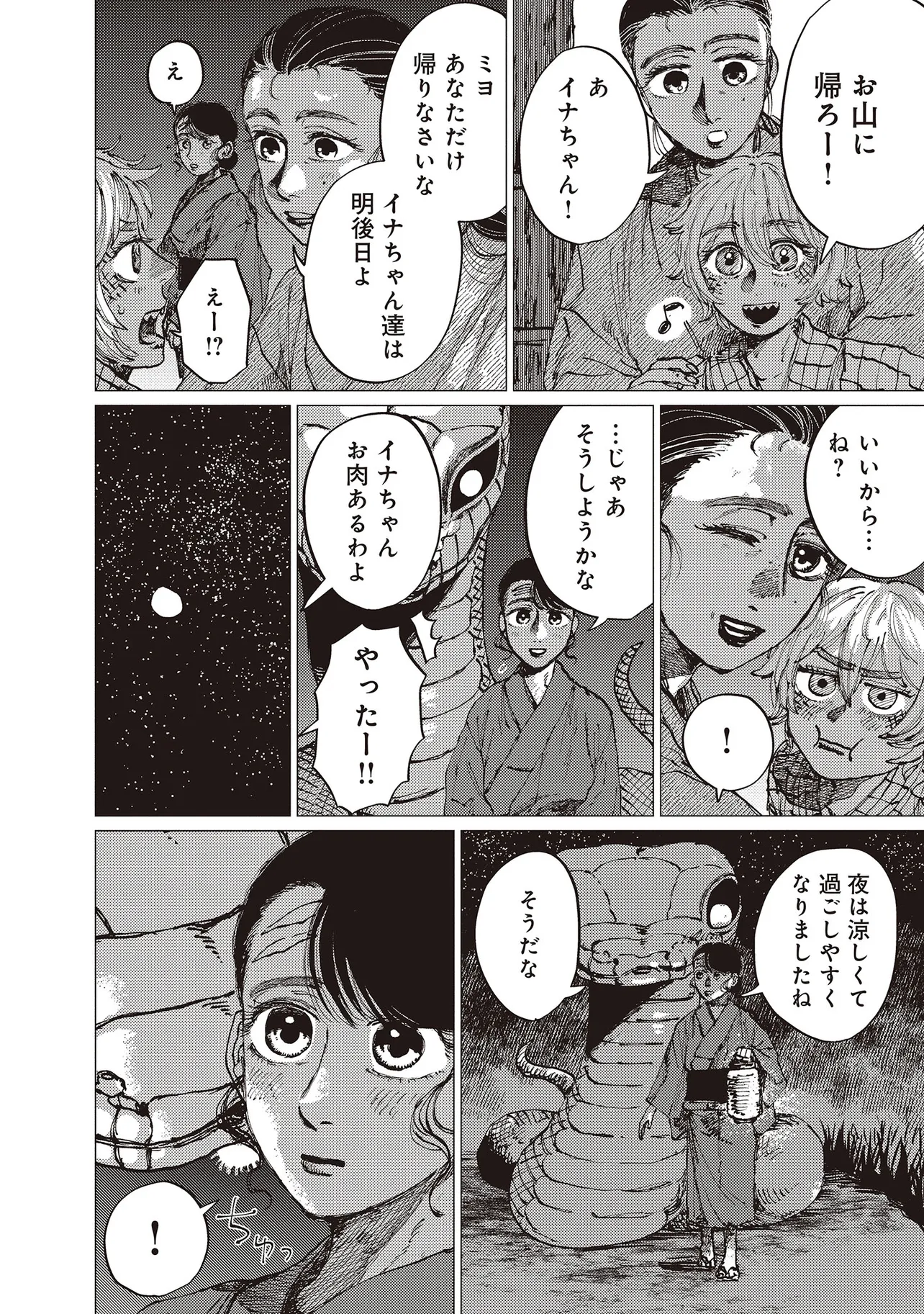 恐ろしい大蛇を前に怯えるミヨだったが、生活をともにしていくうちに気持ちに変化が。
