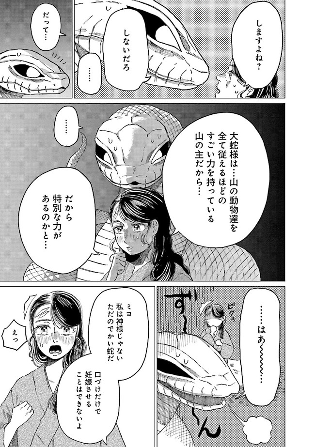 「傷モノの娘だ。ちょうどよい」そう言われ、山の主である大蛇に供物として嫁ぐことになったミヨ。