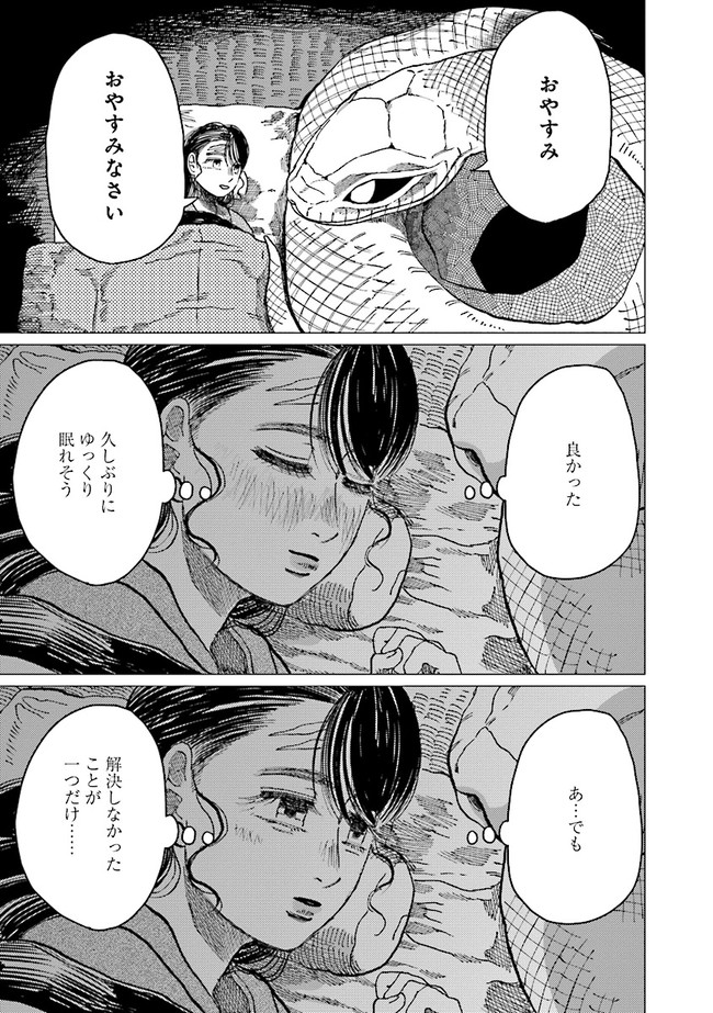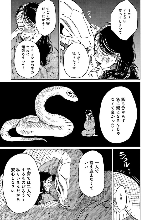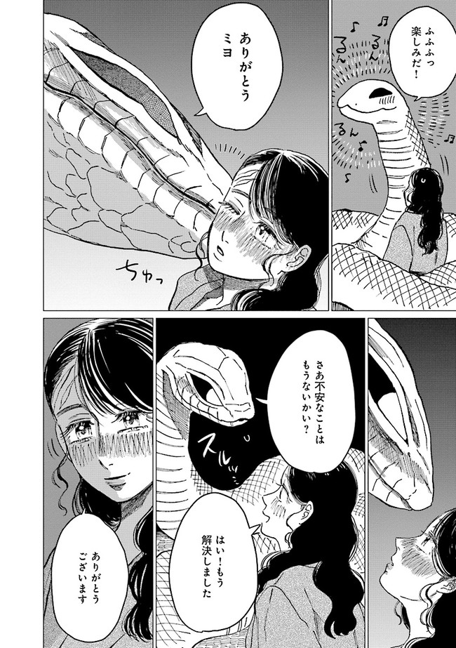 恐ろしい大蛇を前に怯えるミヨだったが、生活をともにしていくうちに気持ちに変化が。