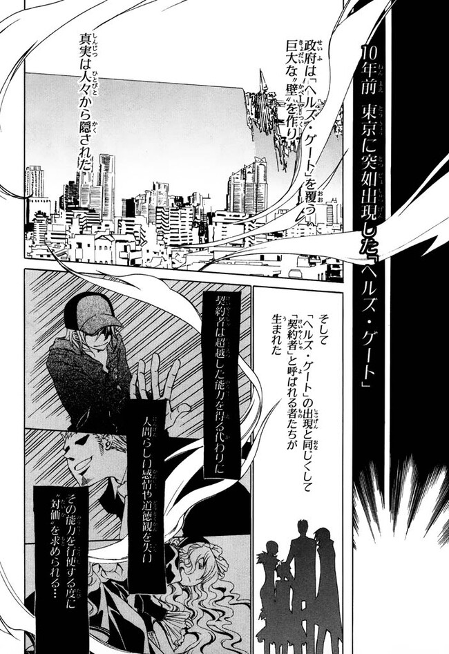 10年前、突如東京に出現した異常領域『地獄門(ヘルズ・ゲート)』。その出現と時を同じくして、『契約者』と呼ばれる異能力者が現れた。驚異的な能力を持つ契約者・黒(ヘイ)は消えた妹の謎を握る人物を捜す途中、死んだはずの父親を追いかける女子高生・奏に接触するが――。