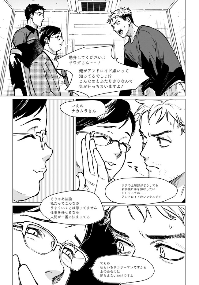 しかしその裏に、人間の怒り、嫉妬、狂気、金欲……など感情も便利道具のアンドロイドにぶつけられ、アンドロイドに職業を奪われた人間の不満も浮上していく。