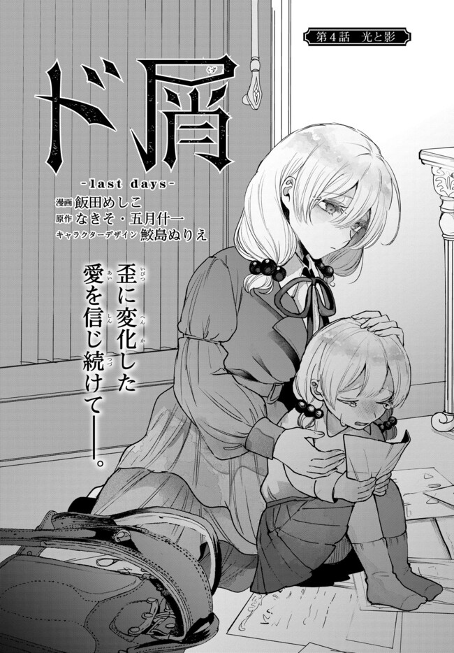 “ド屑-last days-” 第4話-① ド屑-last days- 投稿者 admin - 2年 前に 幸せな読書漫画 “ド屑-last days-” 第4話-① , いいねと共有ボタンをクリックすることを忘れないでください. Manga ド屑-last days- 常に更新されます 無料コミック Comic Top. 他のマンガの更新を読むことを忘れないでください。 マンガコレクションのリスト 無料コミック Comic Top マンガリストメニューにあります. お友達と共有しましょう! Facebook Twitter Pinterest Whatsapp 前のエピソード すべての章 次のエピソード リスト ページング Loading.. 前のエピソード すべての章 次のエピソード リスト ページング お友達と共有しましょう! Facebook Twitter Pinterest Whatsapp お気に入りに追加に続く 3 人 ド屑-last days- MF文庫Jより発売中の、大人気ボカロ小説がコミカライズ!! 恵まれた容姿ゆえ、「遊び相手」に困らない大学生活を過ごす霞は、 高校時代のクラスメイト・雲母と再会し、彼女から想いを寄せられるようになるが、 だんだん疎ましく感じてしまい…? 誰も知らない雲母の本当の姿とは。 心を抉るダーク・ラブ・ファンタジー! なきそ・五月什一(原作)飯田めしこ(漫画)鮫島ぬりえ(キャラクター原案) クズコミカライズファンタジーボーカロイドボカロ人外恋愛異能力超能力