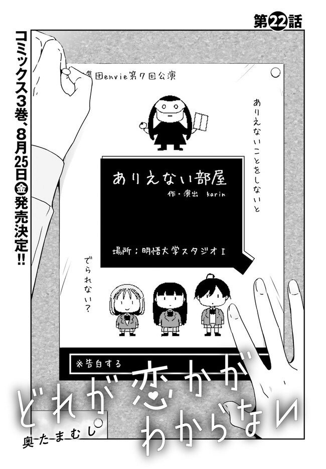 どれが恋かがわからない 第22話 どれが恋かがわからない 投稿者 admin - 2年 前に 幸せな読書漫画 どれが恋かがわからない 第22話 , いいねと共有ボタンをクリックすることを忘れないでください. Manga どれが恋かがわからない 常に更新されます 無料コミック Comic Top. 他のマンガの更新を読むことを忘れないでください。 マンガコレクションのリスト 無料コミック Comic Top マンガリストメニューにあります. お友達と共有しましょう! Facebook Twitter Pinterest Whatsapp 前のエピソード すべての章 次のエピソード リスト ページング Loading.. 前のエピソード すべての章 次のエピソード リスト ページング お友達と共有しましょう! Facebook Twitter Pinterest Whatsapp お気に入りに追加に続く 2 人 どれが恋かがわからない 主人公・空池メイは高校の卒業式に片想いしていた友人に告白…… しようとするも失敗してしまう。 そのため「大学でぜったい彼女をつくる!」と意気込んで入学するのだが、 なぜか次々とメイのもとに女の子たちがやってきて……!? 待望のコミックス第①巻、4月27日(水)発売決定!! 奥たまむし(著者) 百合漫画
