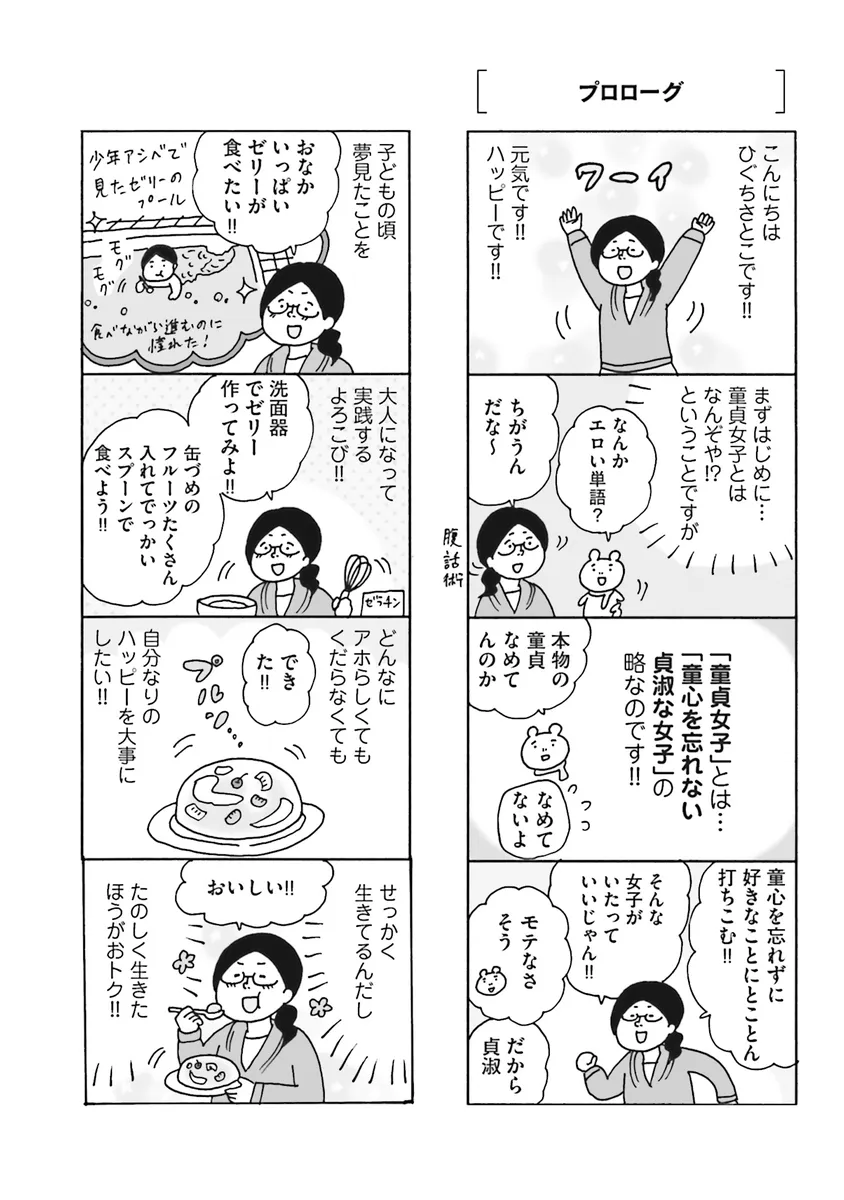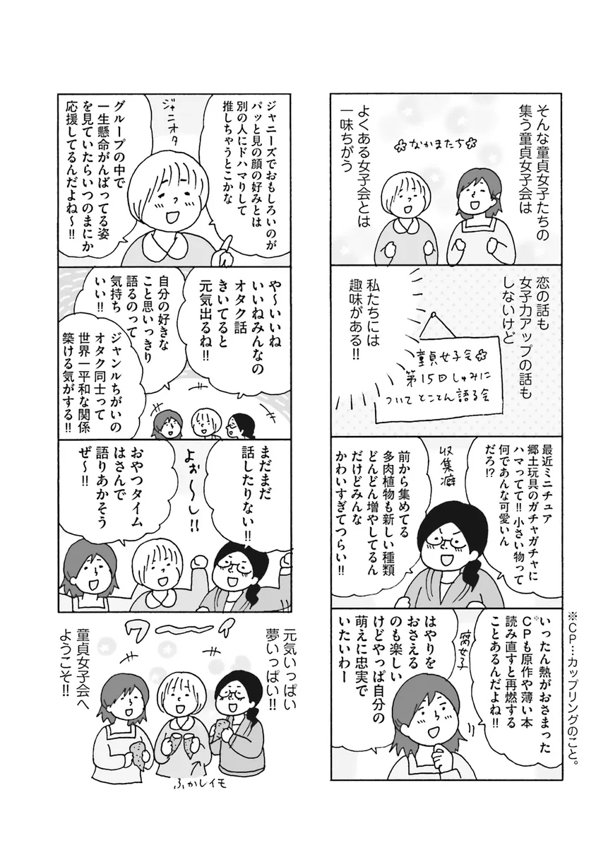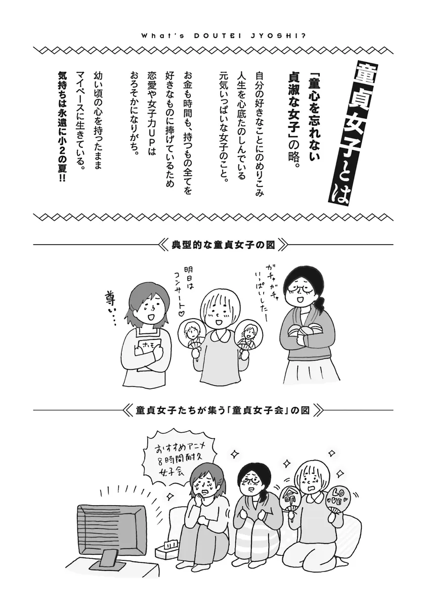 twitterで累計10000RT! 話題騒然のニュータイプ女子「童貞女子=童心を忘れない貞淑な女子」たちのハッピーな日常ギャグマンガが、新しい童貞女子たちを加え、さらにパワーアップして2015年5月23日(土)に新発売!! 新刊発売を記念して、本編の中身を大公開いたします! コスプレ、フィギュア、BL、ジャニーズ……好きなものが多すぎて、人生の時間がいくらあってもたりません! そんな童心を忘れない「童貞女子」たちが集う新しき女子会・「童貞女子会」では、8時間耐久アニメ女子会から化石堀り、鉱石フェス、段ボールそりまでたのしいことが目白押し!! ウルトラハッピーな童貞女子会へようこそ!!