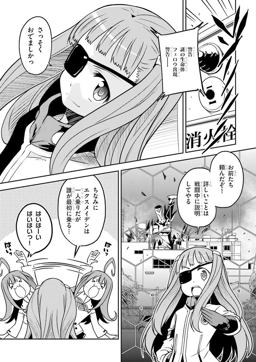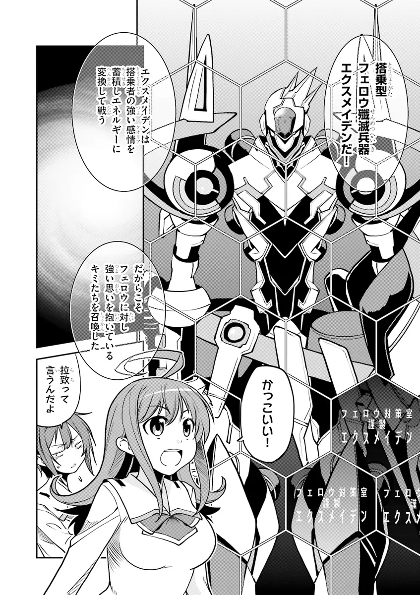 ニコニコ動画で話題を呼んだ異色ロボットアニメがコミカライズ!! 近未来の日本に現れた侵略者「フェロウ」から街を救うため、搭乗者の感情が昂ることで真の力を発揮する搭乗型フェロウ殲滅兵器「エクスメイデン」と、その搭乗者の戦いが幕を開ける!!