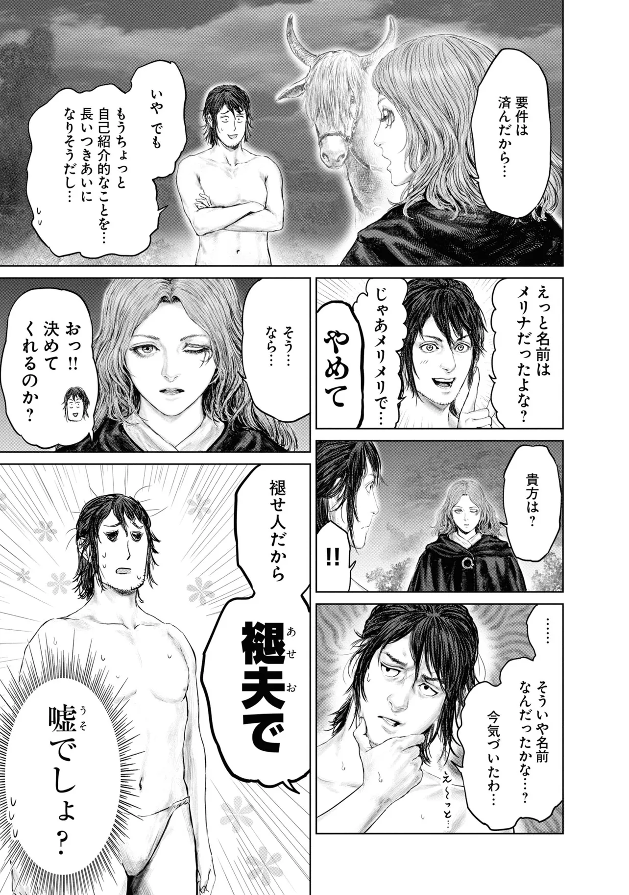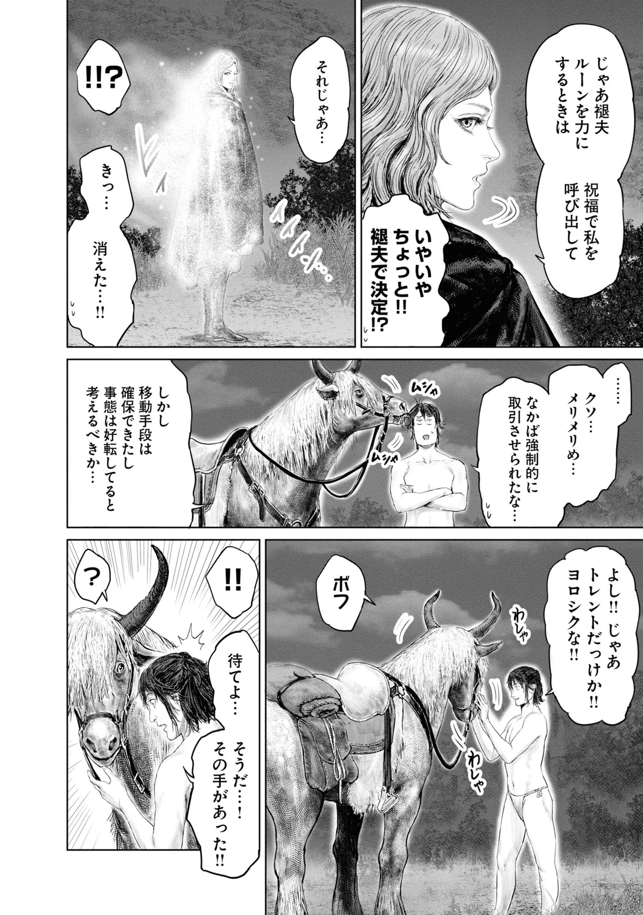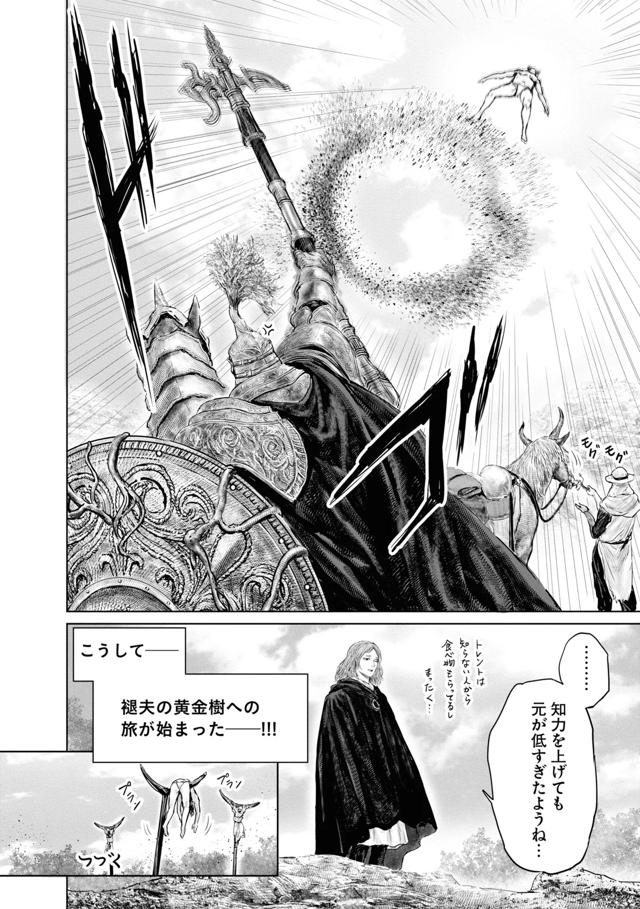 素寒貧で狭間の地・リムグレイブへ放り出された褪せ人・褪夫(あせお)。狭間の地の過酷さに心が折れかけた褪夫は、謎の少女・メリナに取引を持ちかけられ、祝福の導きに従って黄金樹を目指すことに。褪夫の行く手には次々に個性豊かすぎる人物たちが待ち受ける。フーテンのパッチ、半狼のブライブ、忌み鬼マルギット、接ぎ木のゴドリック、そして魔女ラニ……。命からがらリムグレイブを旅する褪夫は、当面の目的地・ストームヴィル城にたどり着けるのか--!?