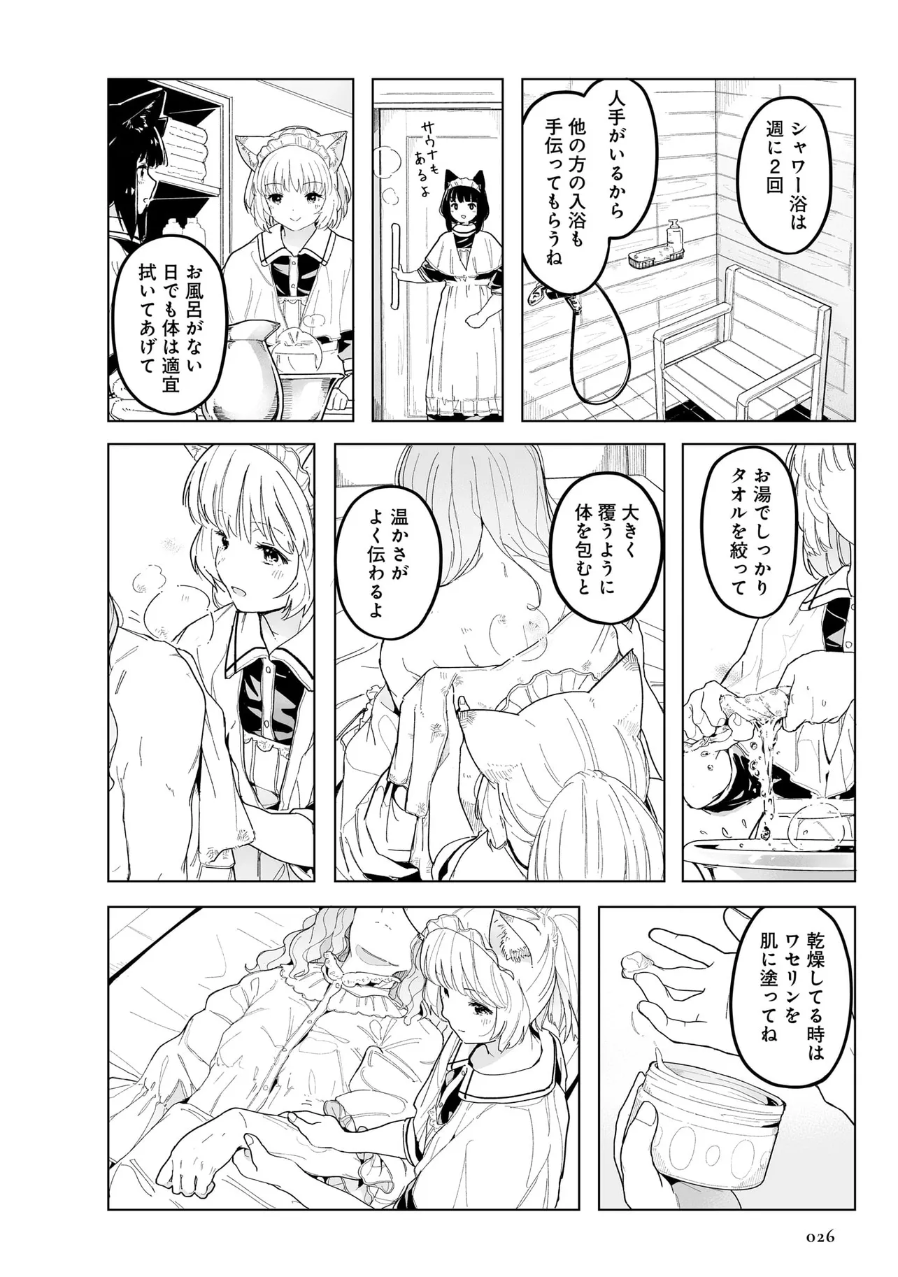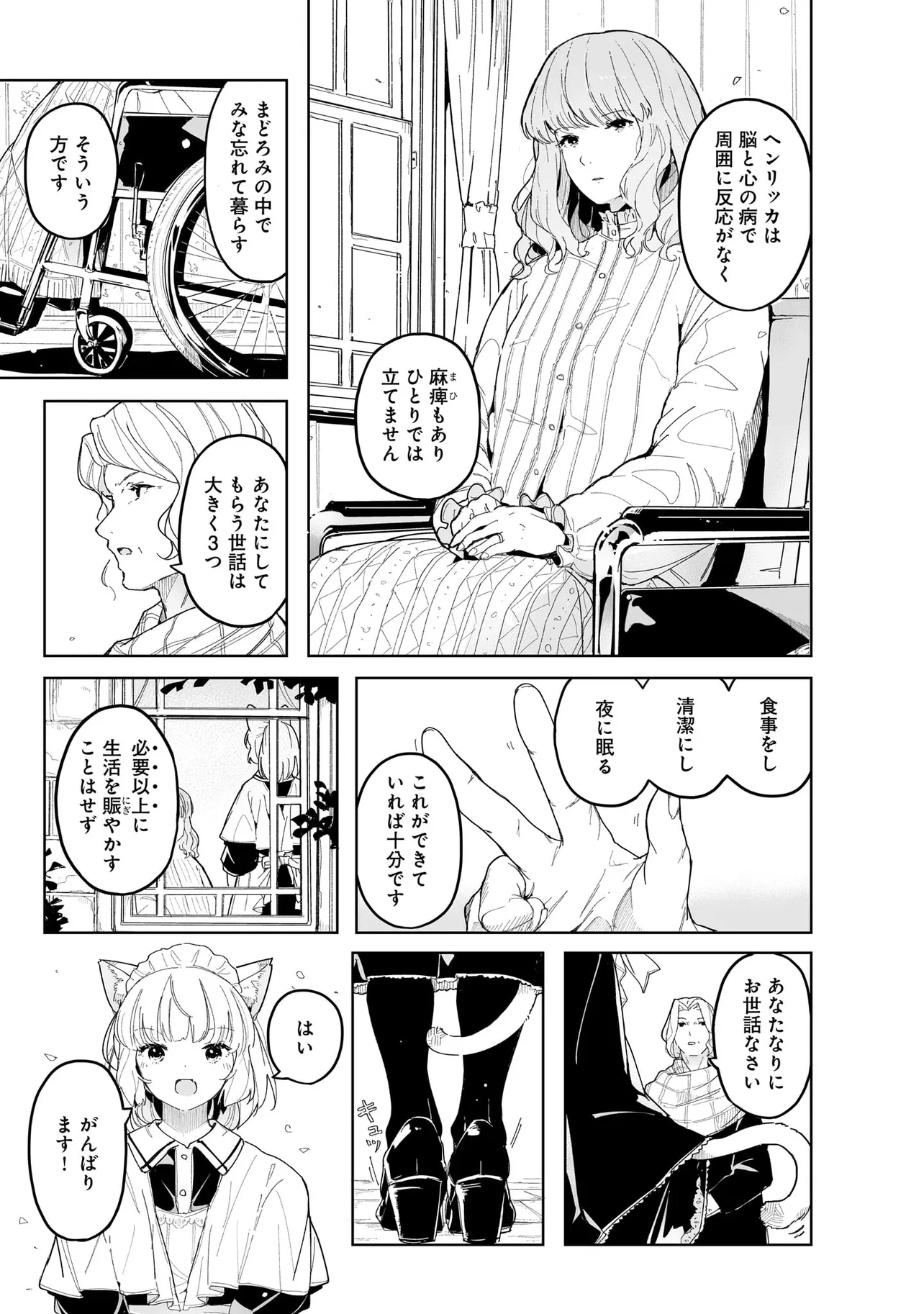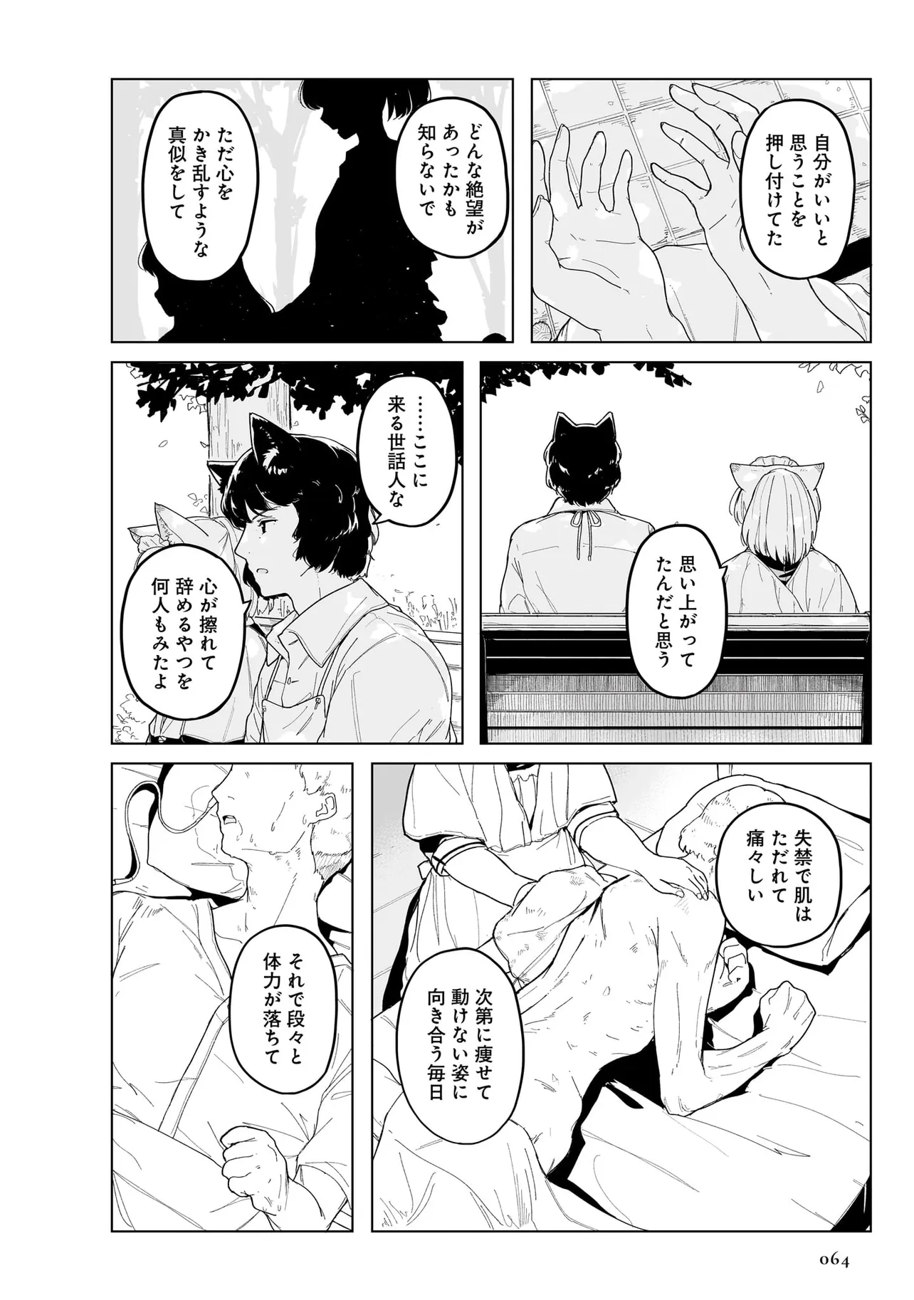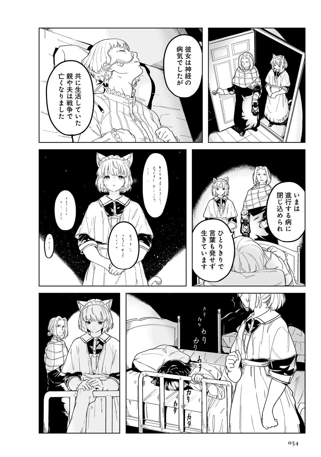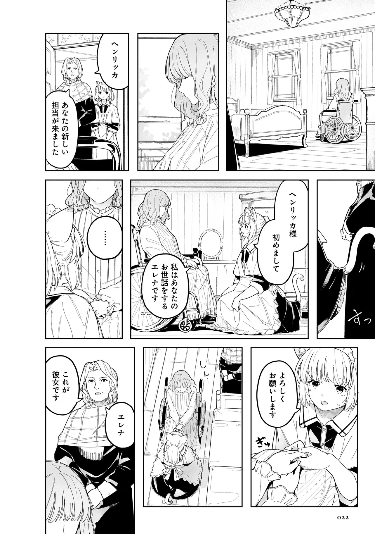 体を動かせない重病人やけが人が最終的に集められるお屋敷で働き始めることになった猫耳少女・エレナ。