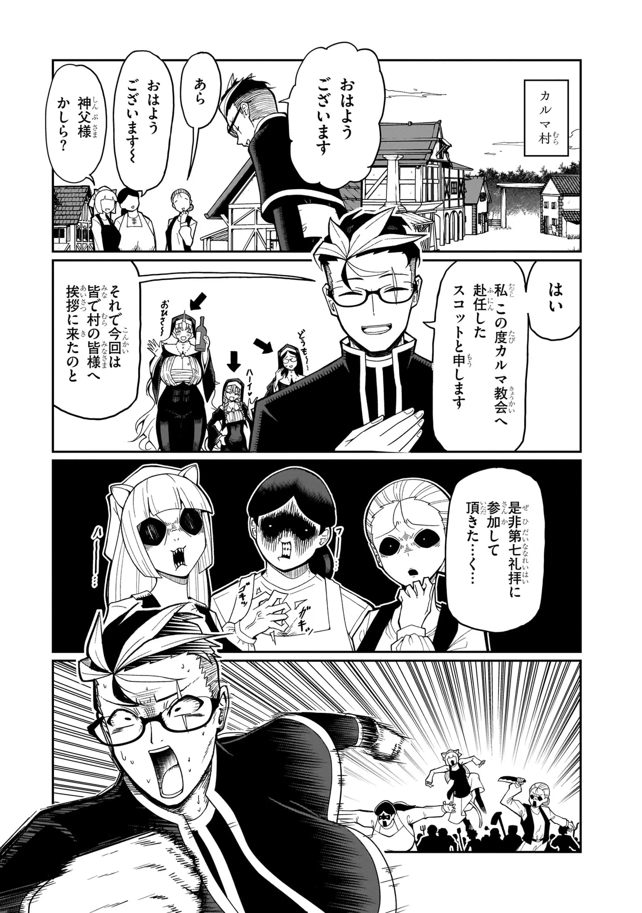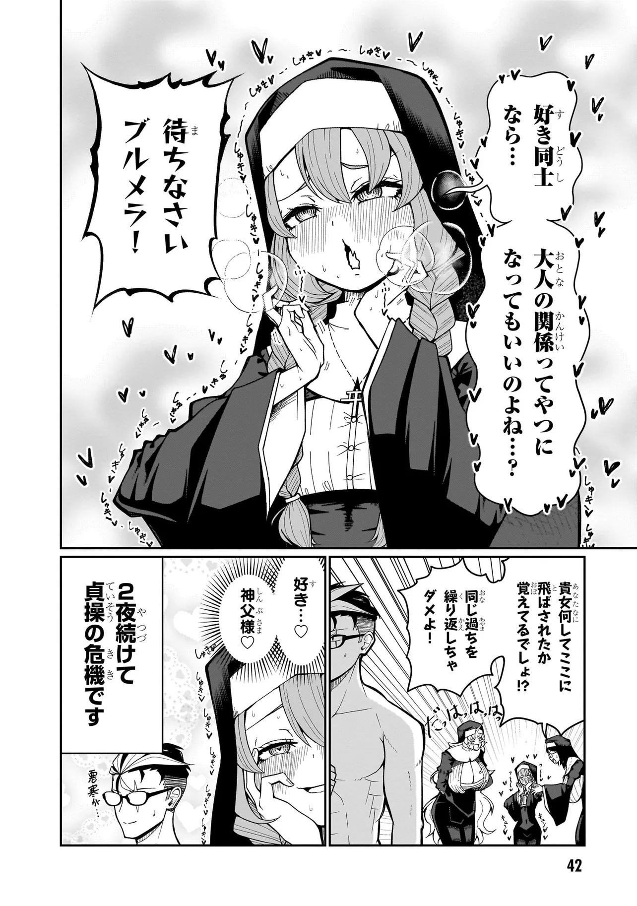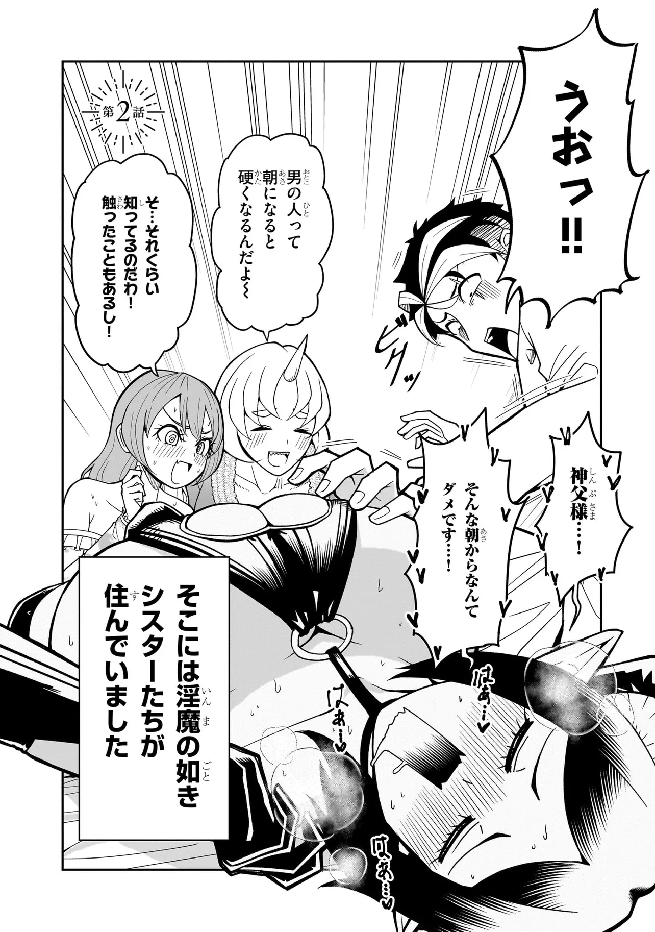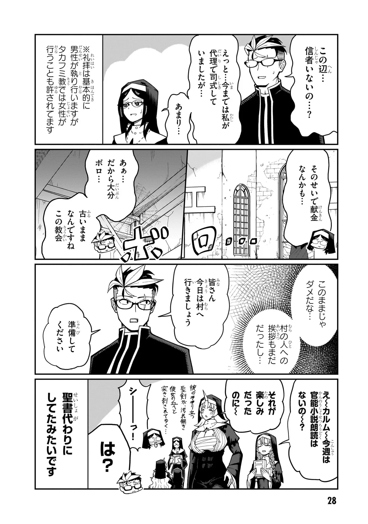 性職者(ケモノ)が貴方の色んな悩み、お聞きします♥ 魔王を倒した勇者・タカフミが神として崇められている異世界で、青年司祭のスコットはタカフミ教を広めるべく、カルマ教会に赴任することに!! しかし、この教会にはある問題があった。それはここのシスターたちが全員…超・超・超!!!!! がつくほどの淫●で問題児だったのだ!!!!!! あるシスターは酒に溺れてゲ⚫︎を撒き散らし、あるシスターは酒池肉林を作り出し住民を暴走させ、あるシスターは妄想癖が激しすぎて常に脳内が桃色ピンク!!! 変●シスターたちのせいで人が寄り付かなくなった教会を、果たしてスコットは建て直すことができるのか!!!!! それとも、スコットの性欲と理性がシスターたちによって崩壊させられるのが先か!!!!? こんな教会になら毎日通っちゃう!!? 欲望渦巻く教会勃(た)て直しエロ・ファンタジー!!!