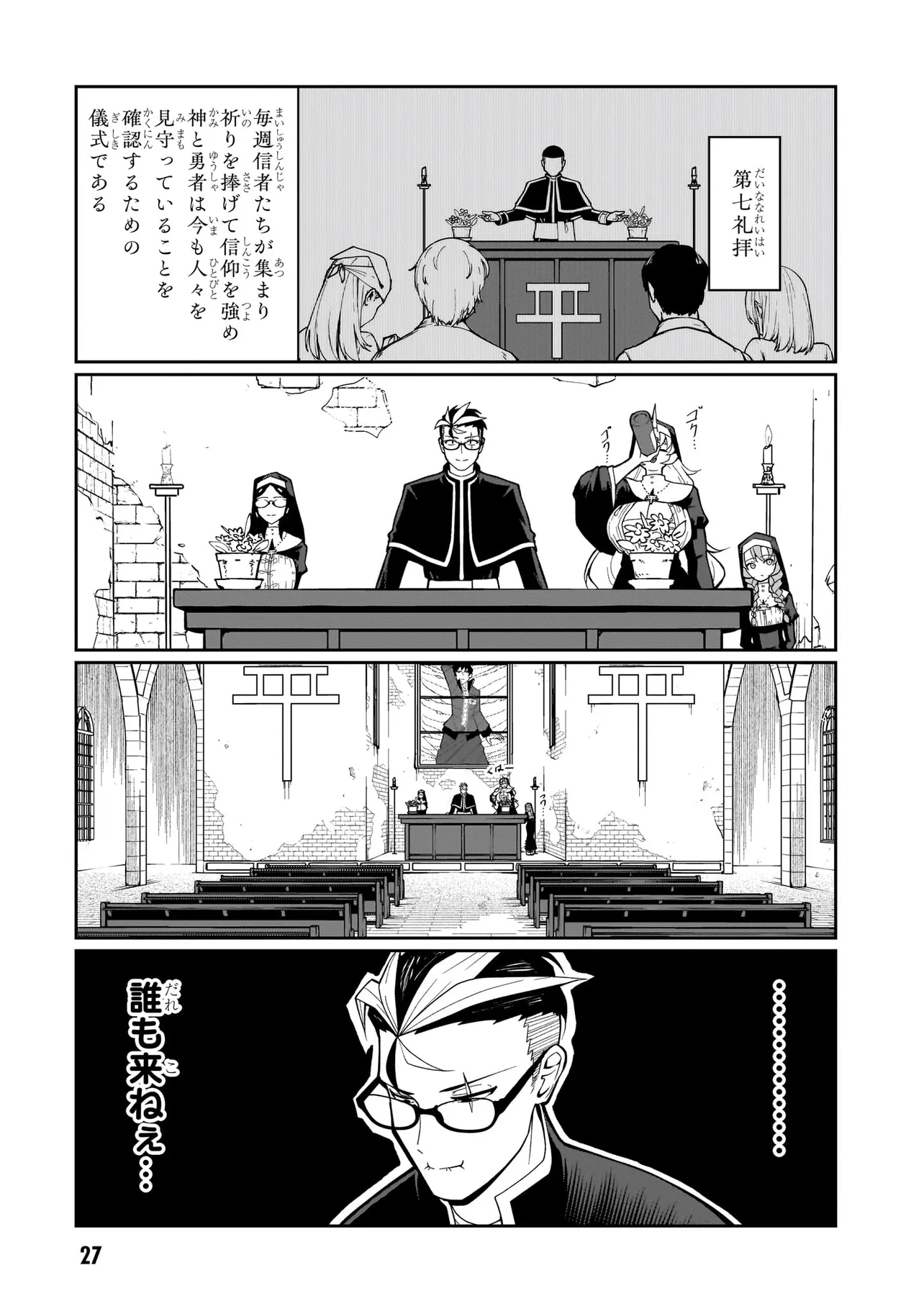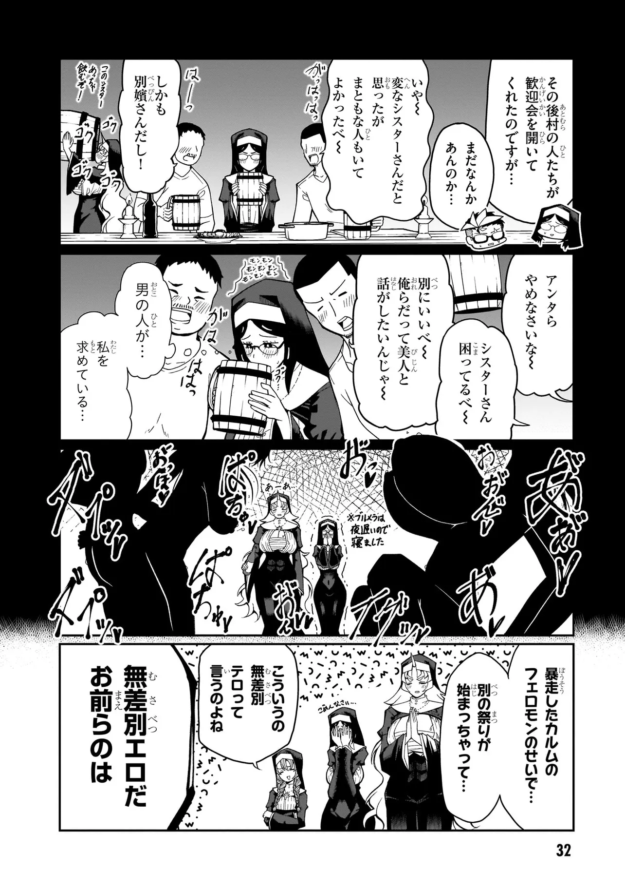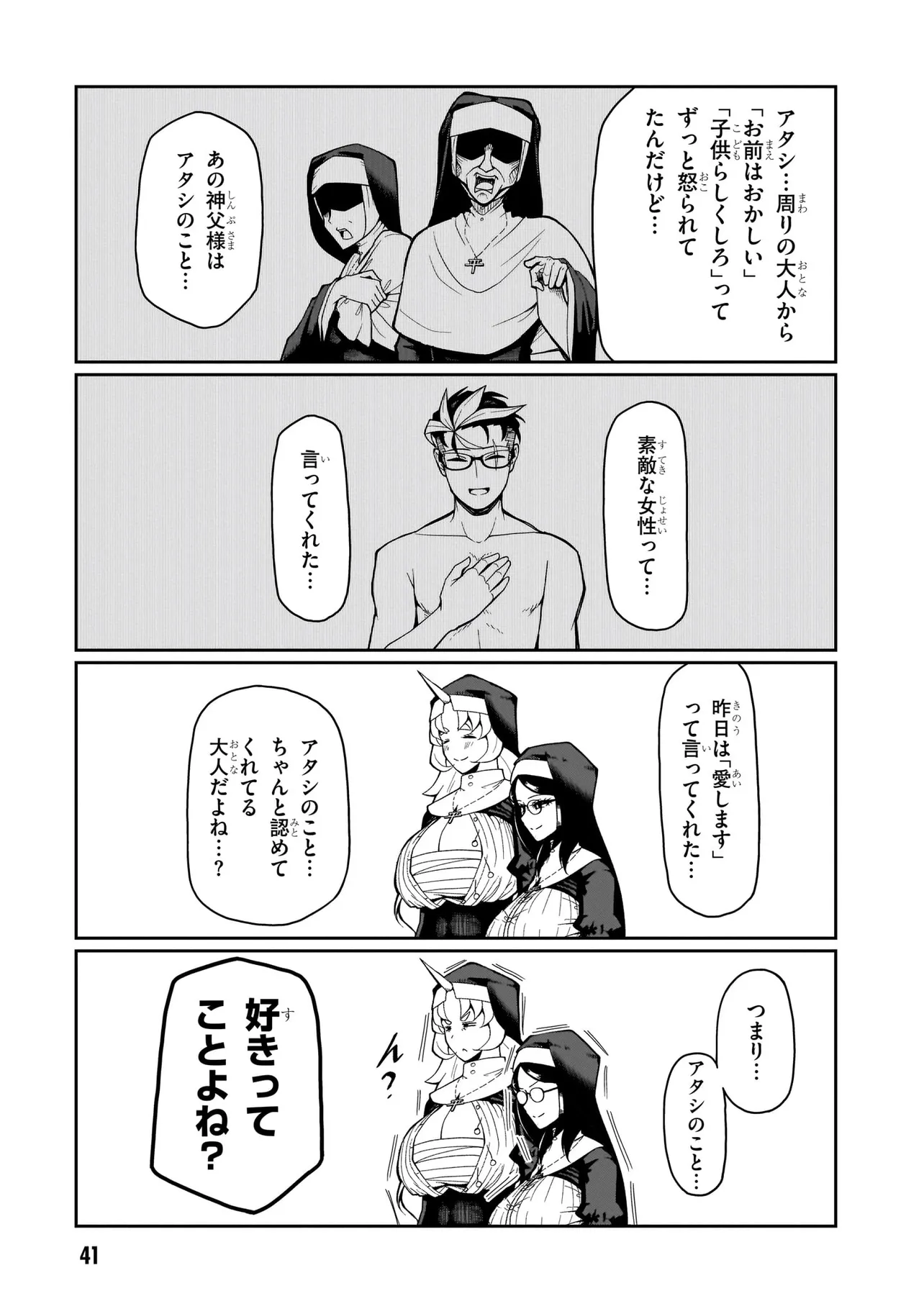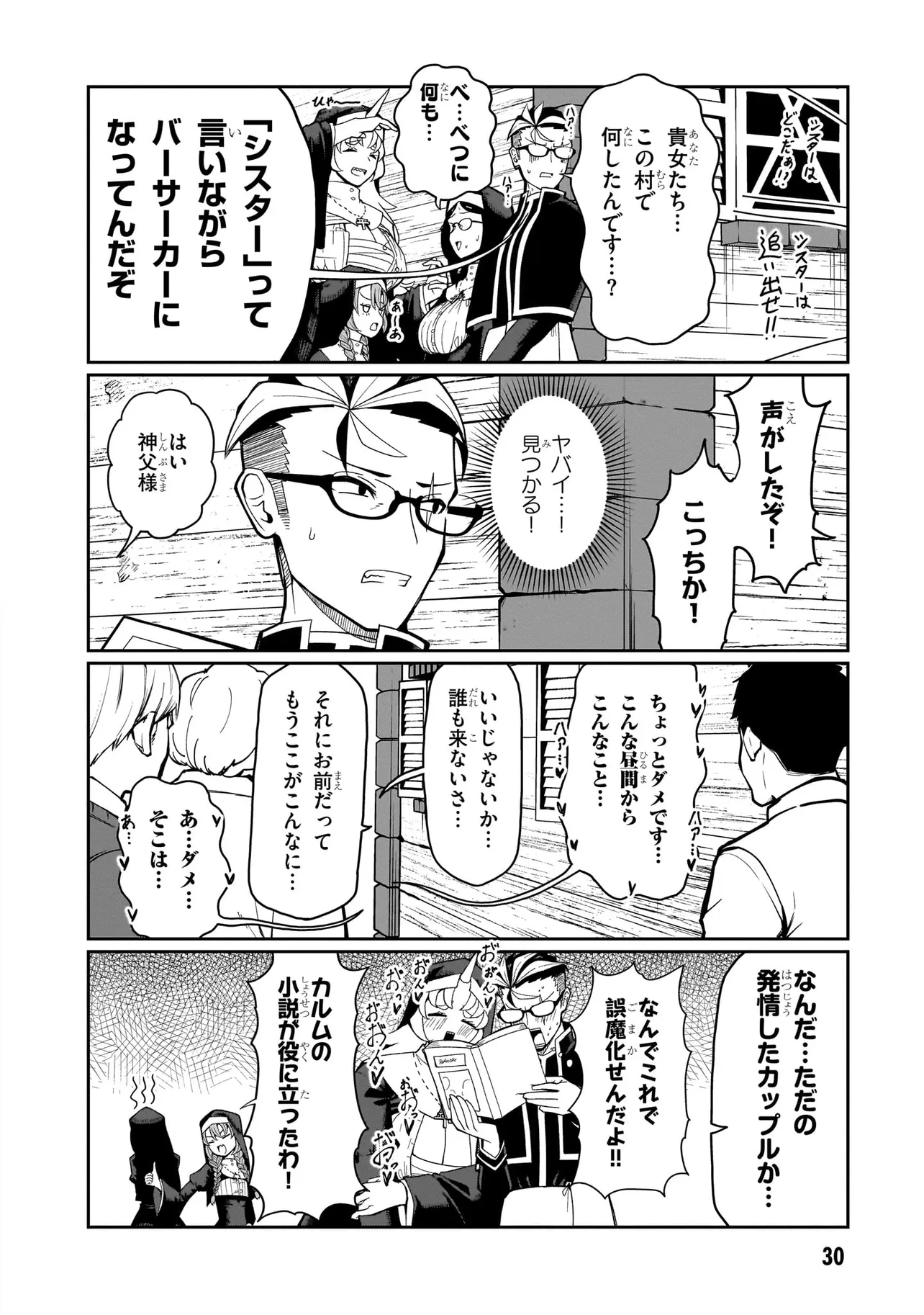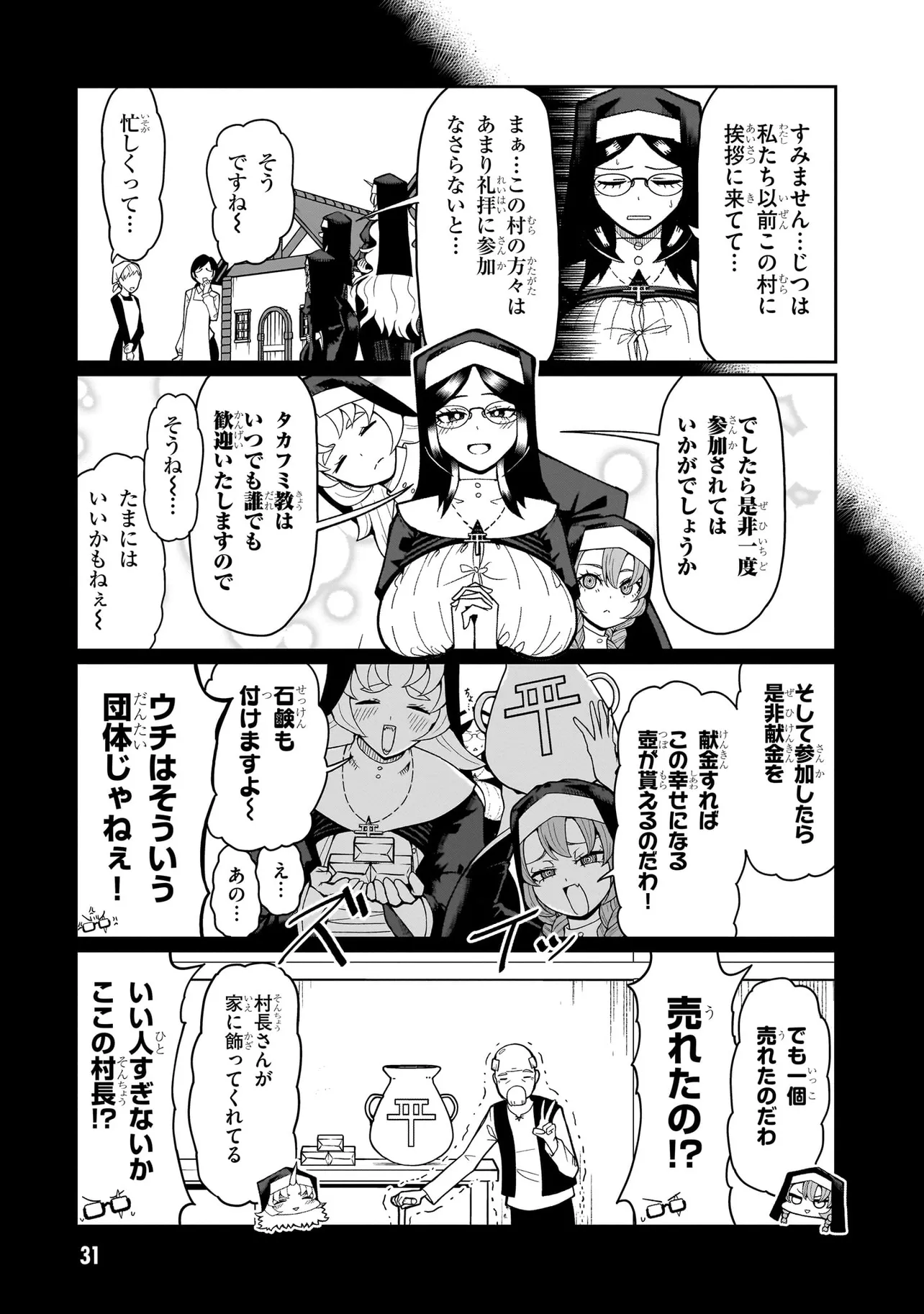 性職者(ケモノ)が貴方の色んな悩み、お聞きします♥ 魔王を倒した勇者・タカフミが神として崇められている異世界で、青年司祭のスコットはタカフミ教を広めるべく、カルマ教会に赴任することに!! しかし、この教会にはある問題があった。それはここのシスターたちが全員…超・超・超!!!!! がつくほどの淫●で問題児だったのだ!!!!!! あるシスターは酒に溺れてゲ⚫︎を撒き散らし、あるシスターは酒池肉林を作り出し住民を暴走させ、あるシスターは妄想癖が激しすぎて常に脳内が桃色ピンク!!! 変●シスターたちのせいで人が寄り付かなくなった教会を、果たしてスコットは建て直すことができるのか!!!!! それとも、スコットの性欲と理性がシスターたちによって崩壊させられるのが先か!!!!? こんな教会になら毎日通っちゃう!!? 欲望渦巻く教会勃(た)て直しエロ・ファンタジー!!!