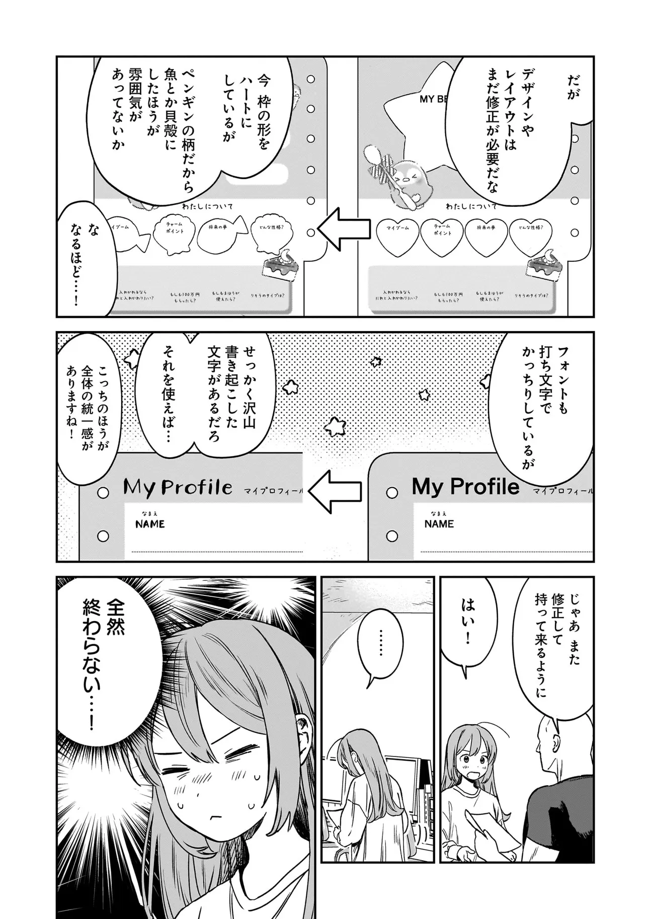 ファンシー革命 第7話 仲良しプロフィール帳 ファンシー革命 投稿者 admin - 2か月 前に 幸せな読書漫画 ファンシー革命 第7話 仲良しプロフィール帳 , いいねと共有ボタンをクリックすることを忘れないでください. Manga ファンシー革命 常に更新されます 無料コミック Comic Top. 他のマンガの更新を読むことを忘れないでください。 マンガコレクションのリスト 無料コミック Comic Top マンガリストメニューにあります. お友達と共有しましょう! Facebook Twitter Pinterest Whatsapp 前のエピソード すべての章 次のエピソード リスト ページング Loading.. 前のエピソード すべての章 次のエピソード リスト ページング お友達と共有しましょう! Facebook Twitter Pinterest Whatsapp お気に入りに追加に続く 0 人 ファンシー革命 いざ、「かわいい」を創る業界へ! ファンシーキャラクターや雑貨を制作する会社に入社した河合ユメ。目標は、世界一の「かわいい」を生み出すこと! 同期社員の4人と一緒に、業界の基本技術を叩き込まれながら一歩一歩進んでいきます。 犬島ななこ ドラマ働く女子現代百合社会人