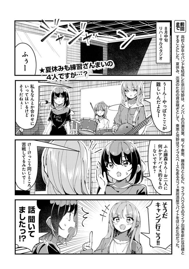 幼い頃に観たロックバンドのライブに心をつかまれた少女・奈川芳野。 だが彼女は高校生になっても治らない極度のコミュ症&あがり症が災いし、高校入学直後から大きくつまずいてしまい……? 青春と友情のJKロック4コマ、開演!!