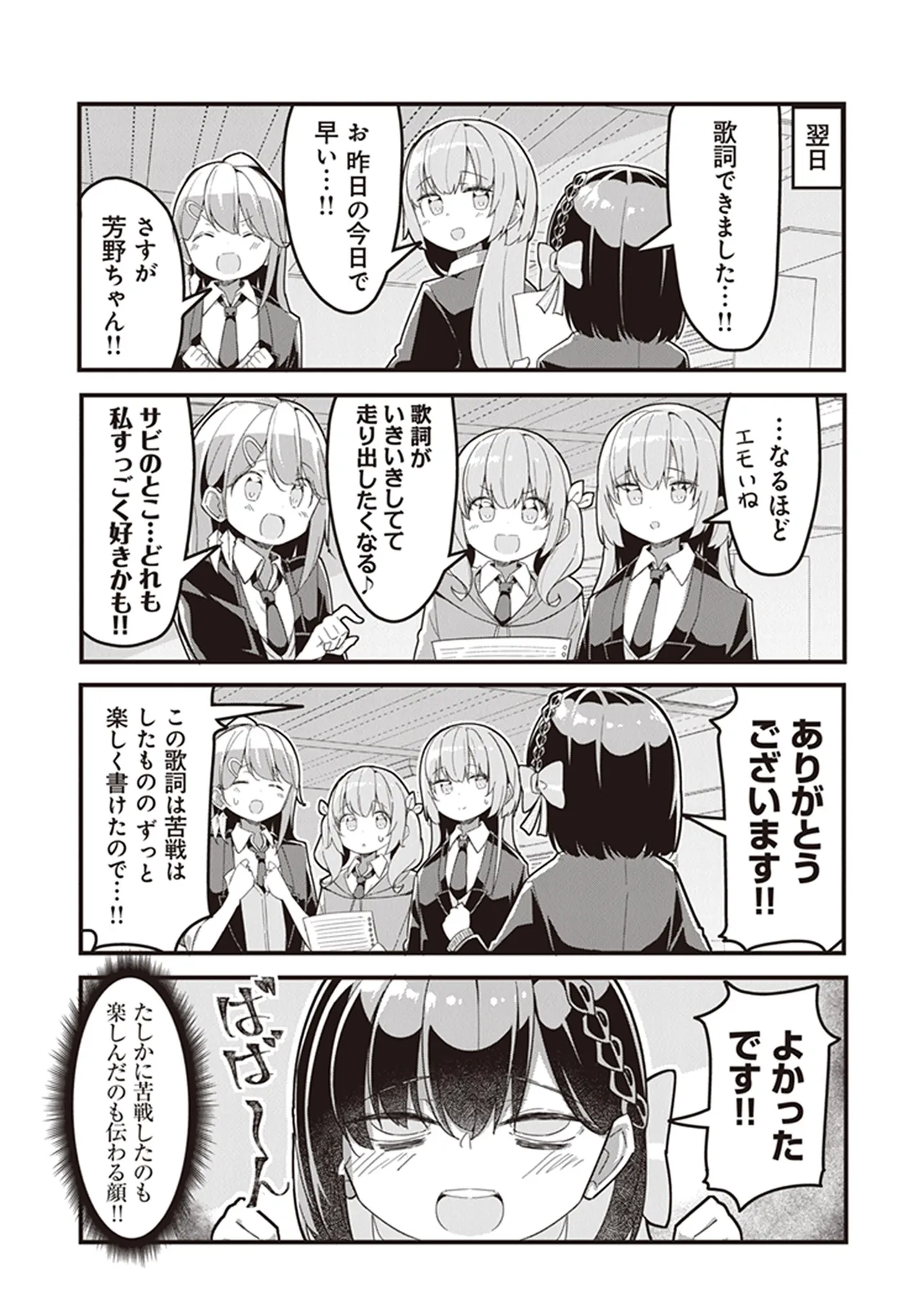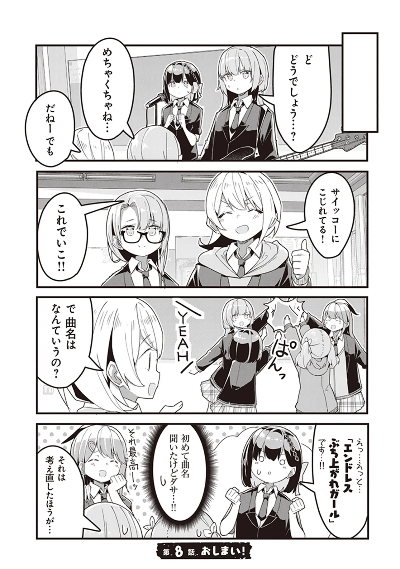 幼い頃に観たロックバンドのライブに心をつかまれた少女・奈川芳野。 だが彼女は高校生になっても治らない極度のコミュ症&あがり症が災いし、高校入学直後から大きくつまずいてしまい……? 青春と友情のJKロック4コマ、開演!!