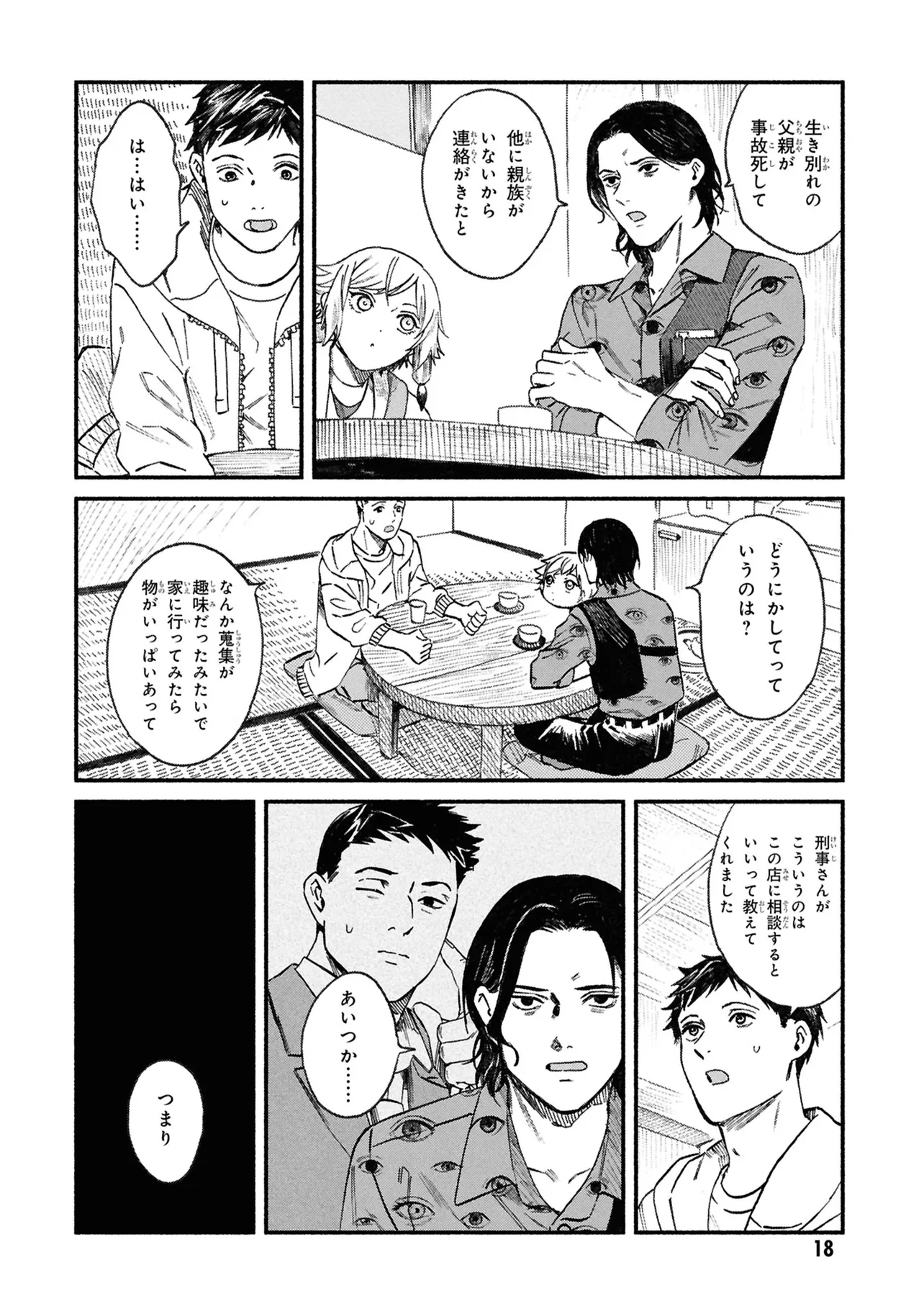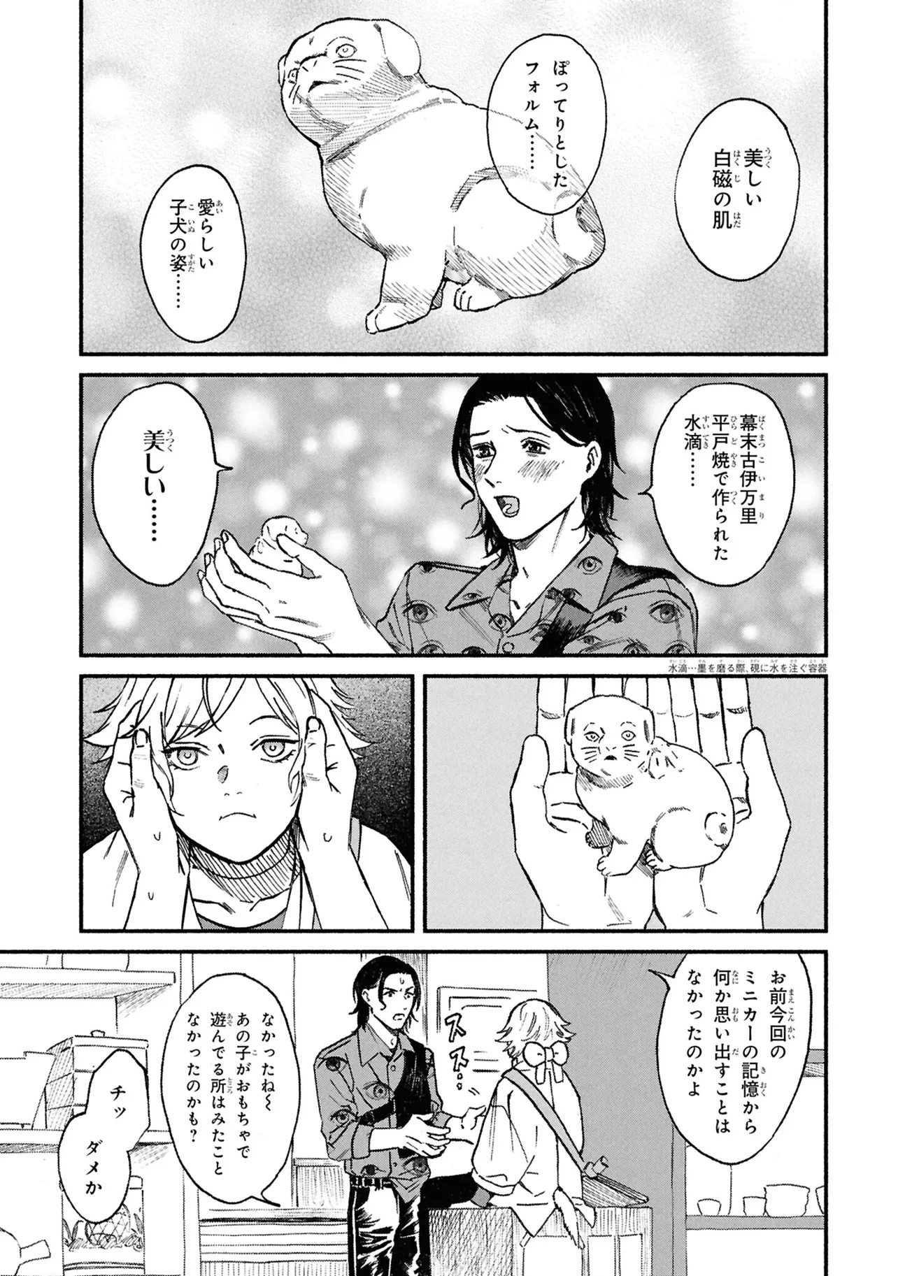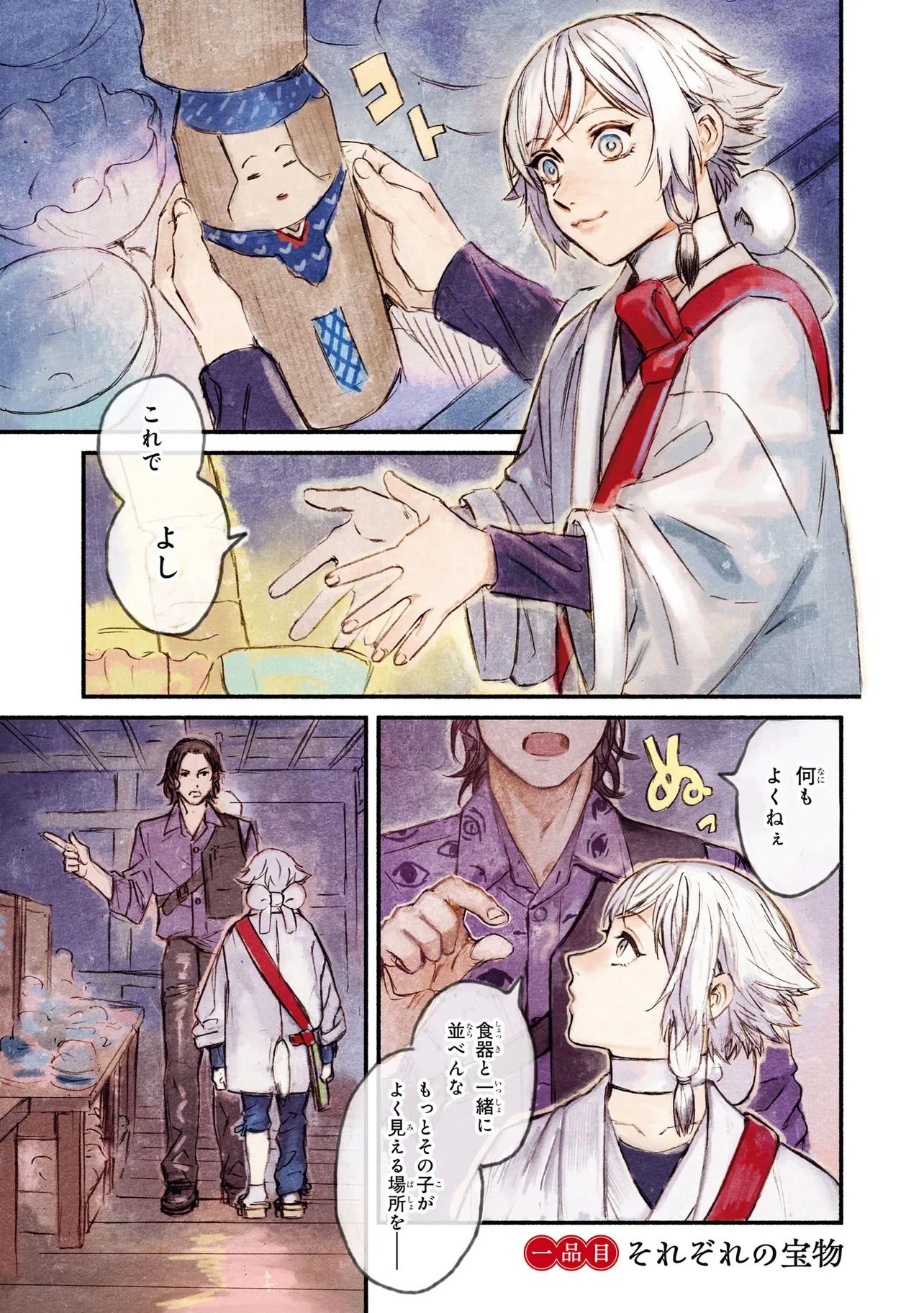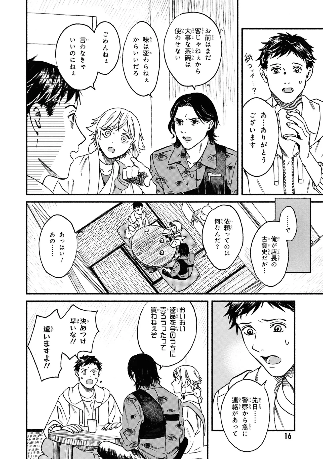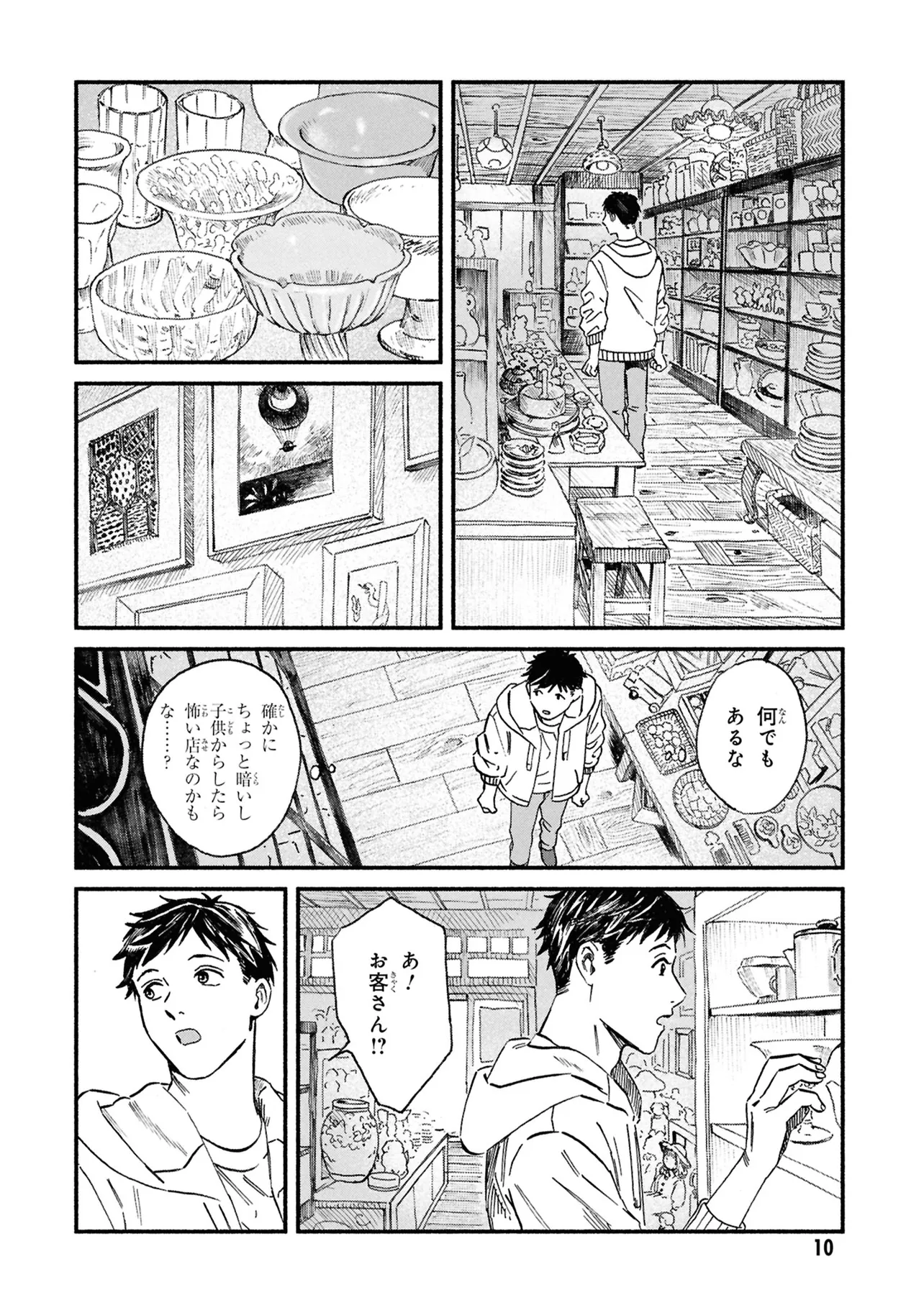 がらくたから 一品目 それぞれの宝物 がらくたから 投稿者 admin - 4か月 前に 幸せな読書漫画 がらくたから 一品目 それぞれの宝物 , いいねと共有ボタンをクリックすることを忘れないでください. Manga がらくたから 常に更新されます 無料コミック Comic Top. 他のマンガの更新を読むことを忘れないでください。 マンガコレクションのリスト 無料コミック Comic Top マンガリストメニューにあります. お友達と共有しましょう! Facebook Twitter Pinterest Whatsapp 前のエピソード すべての章 次のエピソード リスト ページング Loading.. 前のエピソード すべての章 次のエピソード リスト ページング お友達と共有しましょう! Facebook Twitter Pinterest Whatsapp お気に入りに追加に続く 0 人 がらくたから 西荻窪にある骨董品店「九十九商店」。そこでは、かつて人に裏切られた経験から誰も信用できなくなった男・史と、謎の少年・ましろが暮らしている。 ましろの正体は文房具「水滴」の付喪神であり、彼の「骨董品の“記憶”を視る能力」で二人は来店する人々の悩みを解決するのだった――。 今日も店には“曰く付き”の品が持ち込まれる。 少し不思議で、心あたたまるアンティークの世界へようこそ。 pikomaro クセになるシリアススカッとするドラマハッピーほのぼの人外切ない動物友情・仲間妖怪日常系泣ける現代生活・ライフスタイル癒やされる社会人笑える群像劇