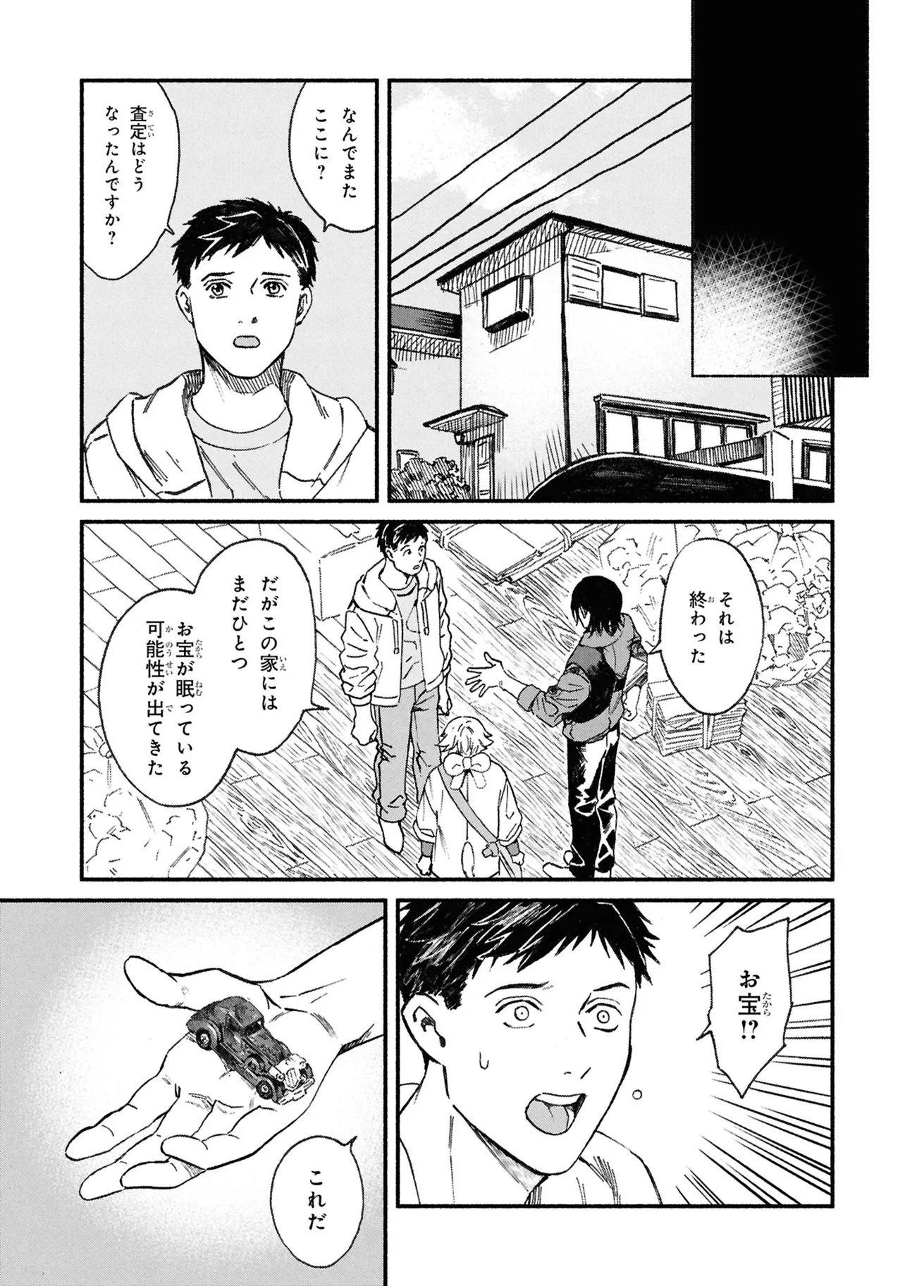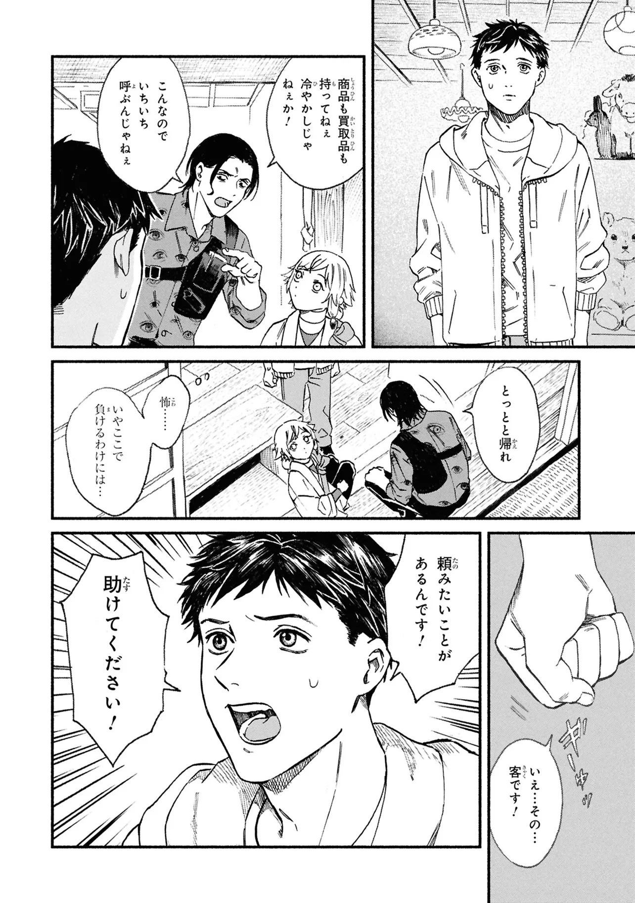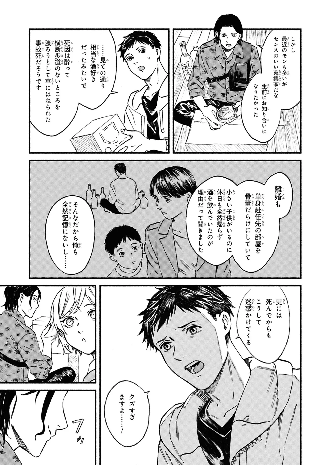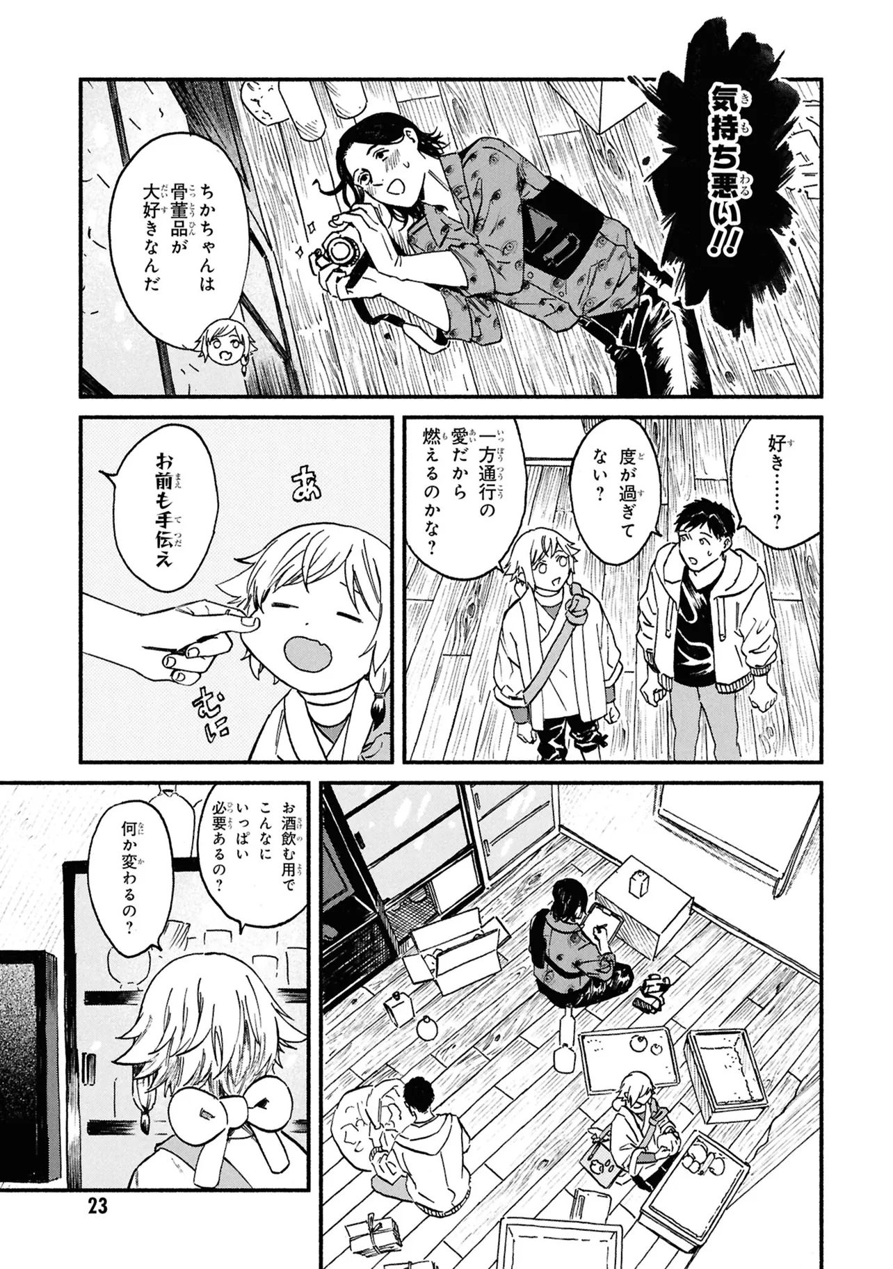 がらくたから 一品目 それぞれの宝物 がらくたから 投稿者 admin - 4か月 前に 幸せな読書漫画 がらくたから 一品目 それぞれの宝物 , いいねと共有ボタンをクリックすることを忘れないでください. Manga がらくたから 常に更新されます 無料コミック Comic Top. 他のマンガの更新を読むことを忘れないでください。 マンガコレクションのリスト 無料コミック Comic Top マンガリストメニューにあります. お友達と共有しましょう! Facebook Twitter Pinterest Whatsapp 前のエピソード すべての章 次のエピソード リスト ページング Loading.. 前のエピソード すべての章 次のエピソード リスト ページング お友達と共有しましょう! Facebook Twitter Pinterest Whatsapp お気に入りに追加に続く 0 人 がらくたから 西荻窪にある骨董品店「九十九商店」。そこでは、かつて人に裏切られた経験から誰も信用できなくなった男・史と、謎の少年・ましろが暮らしている。 ましろの正体は文房具「水滴」の付喪神であり、彼の「骨董品の“記憶”を視る能力」で二人は来店する人々の悩みを解決するのだった――。 今日も店には“曰く付き”の品が持ち込まれる。 少し不思議で、心あたたまるアンティークの世界へようこそ。 pikomaro クセになるシリアススカッとするドラマハッピーほのぼの人外切ない動物友情・仲間妖怪日常系泣ける現代生活・ライフスタイル癒やされる社会人笑える群像劇