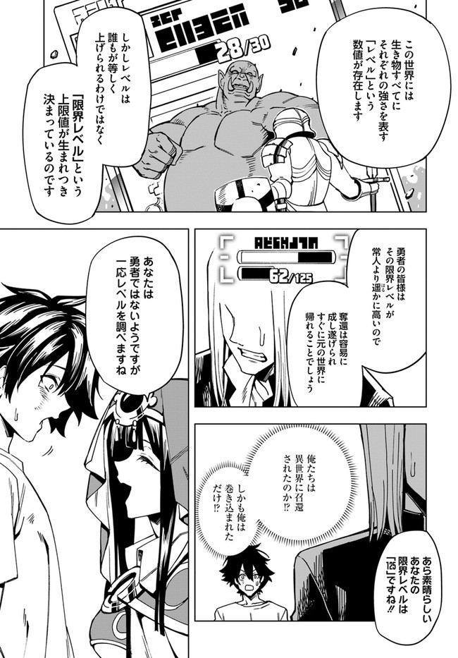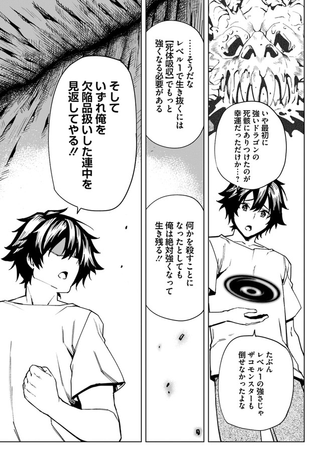 ブラック企業に勤める高橋哲也(タカハシ テツヤ)はある日の仕事帰り、異世界の勇者を召喚する大秘術に巻き込まれてしまう。 勇者ではなく一般人として異世界に召喚されたテツヤに待っていたのは、「限界レベル」というこの世界における成長限界が最弱の1であること、そして限界レベルが低い者は生きる価値がないという理不尽な定めであった。 “欠陥品”として魔物が生息する谷底に捨てられたテツヤだったが、死の間際にユニークスキル【死体吸収】が発動し……!? 死体の能力を吸収して最強へと成り上がれ、レベル1の男の異世界ファンタジーが開幕!