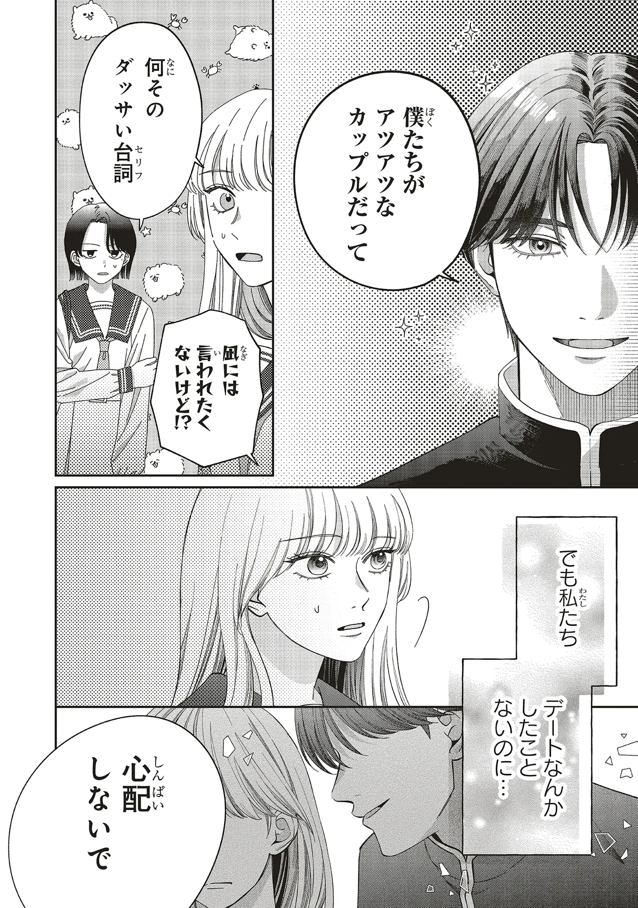 周囲に狙われることがないよう、学校では二人で仲睦まじい「恋人同士」のフリをすることに!