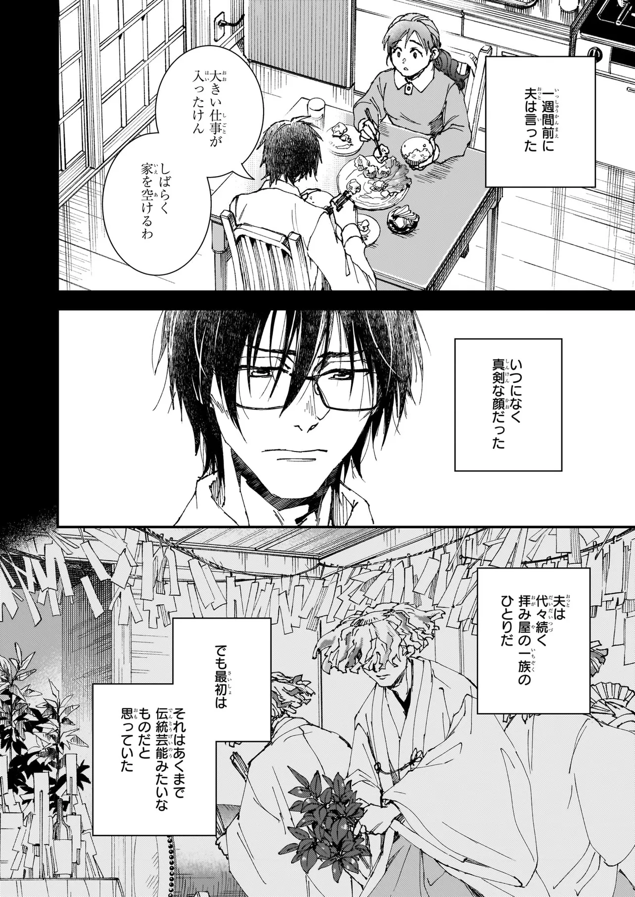 四国の山奥にある小さな村。そこには奇妙な仏像があり、大切に祀られていた。 友人・匠の帰省に付き添い、東京から村へ訪れた隼人は、村人たちの異様に冷たい空気に違和感を抱く…。 匠の祖母に優しく迎えられ、和やかな夕食の最中、「仏を近づけた」という祖母の言葉を聞いた瞬間、匠が顔色を変え、家を飛び出し――その夜、失踪。 隼人はそこから立て続けに起きる奇妙なことに巻き込まれていく。 恐ろしい土地の因縁と、怪異。 匠の祖母の言った「仏」とは何なのか、その正体が顔を出す第一章「頷き仏」の開幕