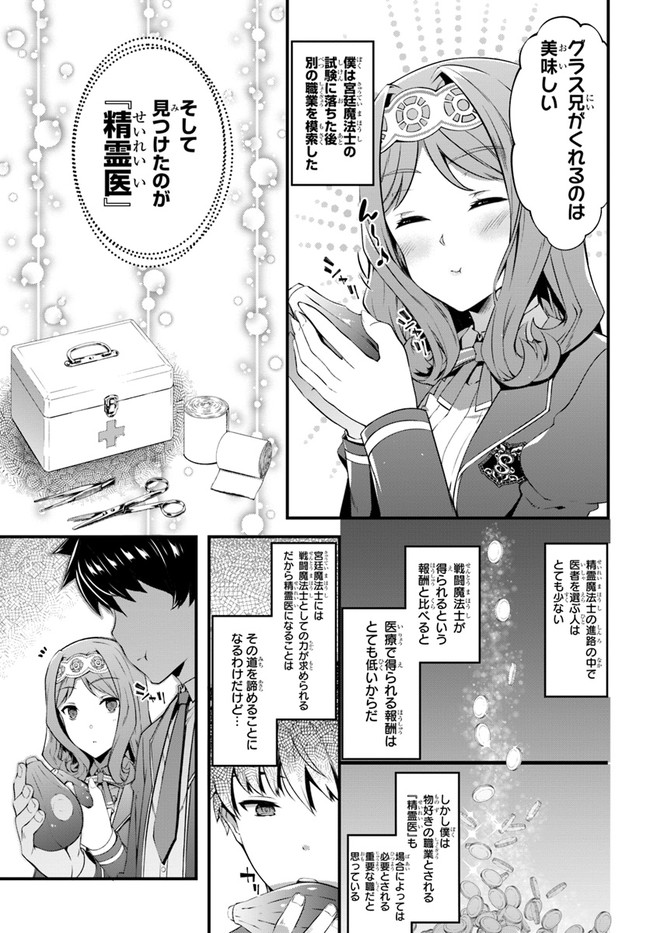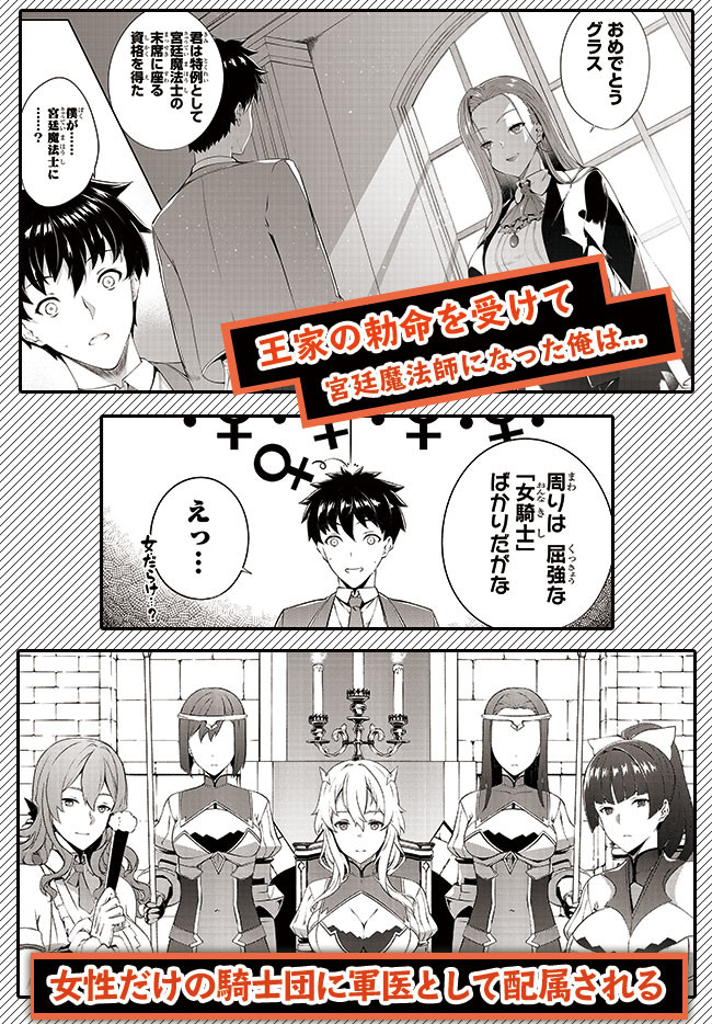 魔法士として将来を嘱望されていたグラス。しかし、選霊 の儀で「はずれ」とされる草の精霊を引いたことで、夢であ った宮廷魔法士への道を閉ざされてしまう。  めげずに適正を活かし、「精霊医」の資格を取得したグラ スに、ある日王家から宮廷魔法士に任命するという勅命が届 く。ただし条件として、王女が率いる女性だけの騎士団の軍 医として、最前線の戦場に赴かねばならず――!?  全てを癒やす精霊医の、戦記ファンタジー! コミカライズでも開幕!