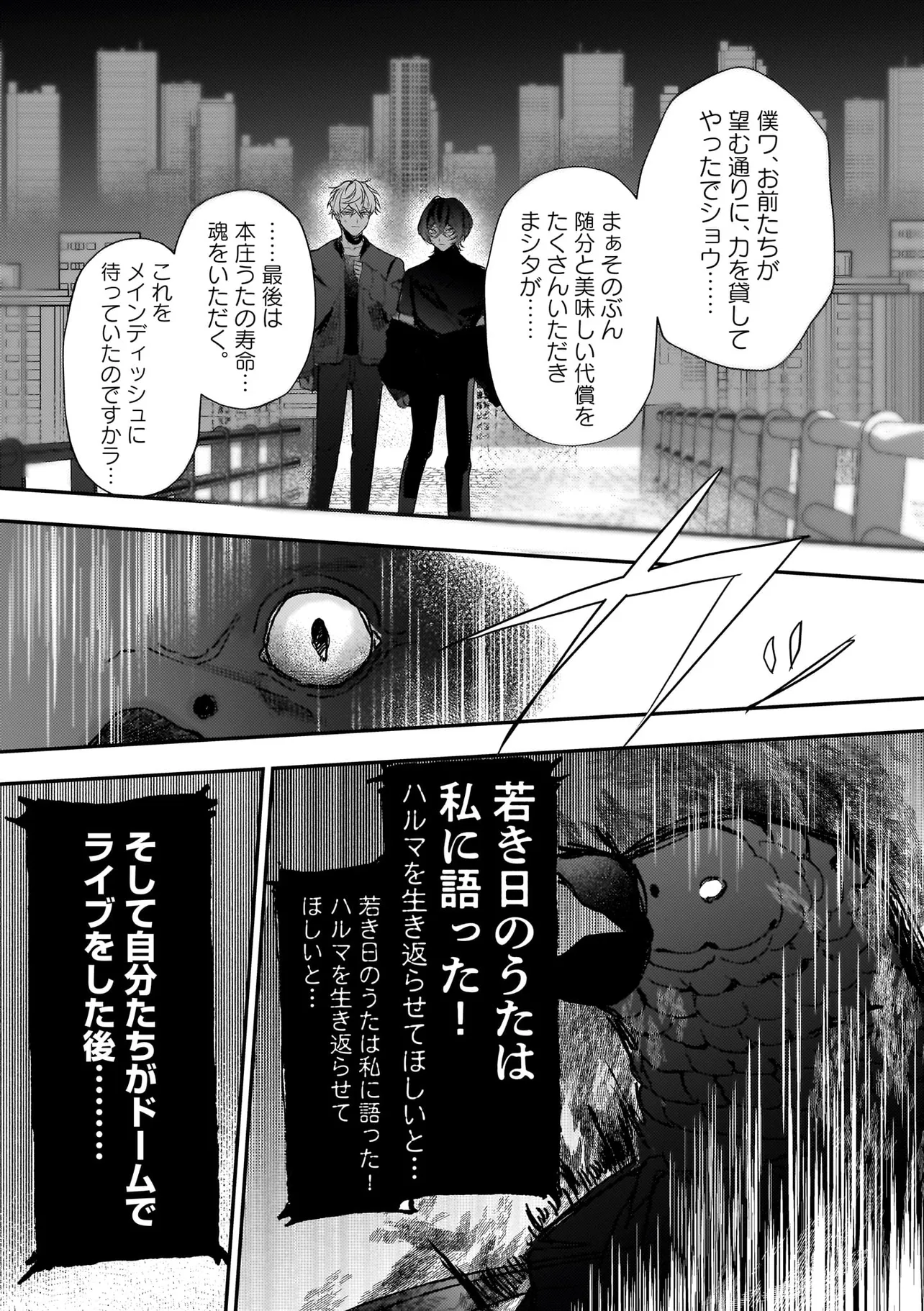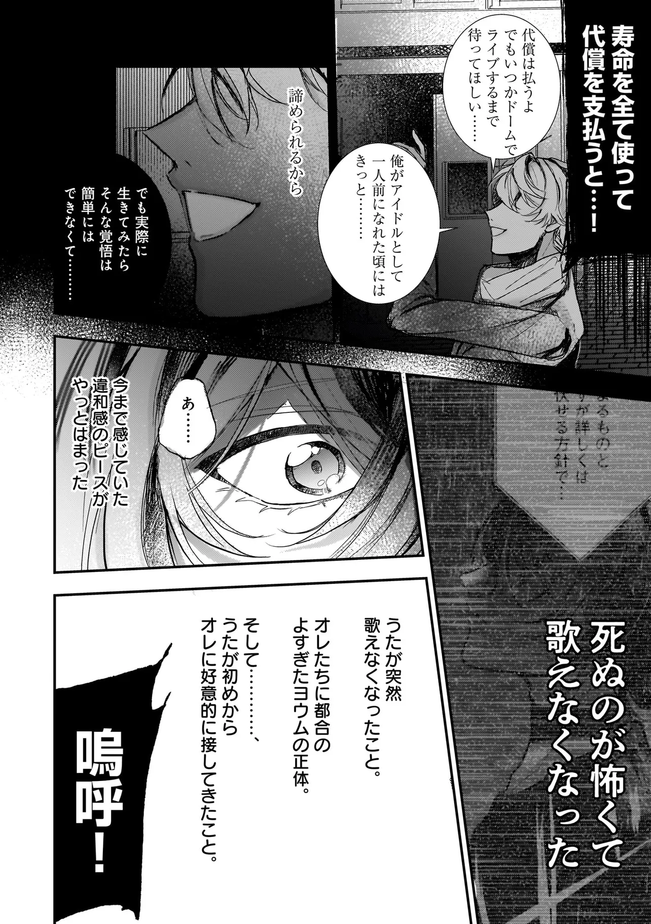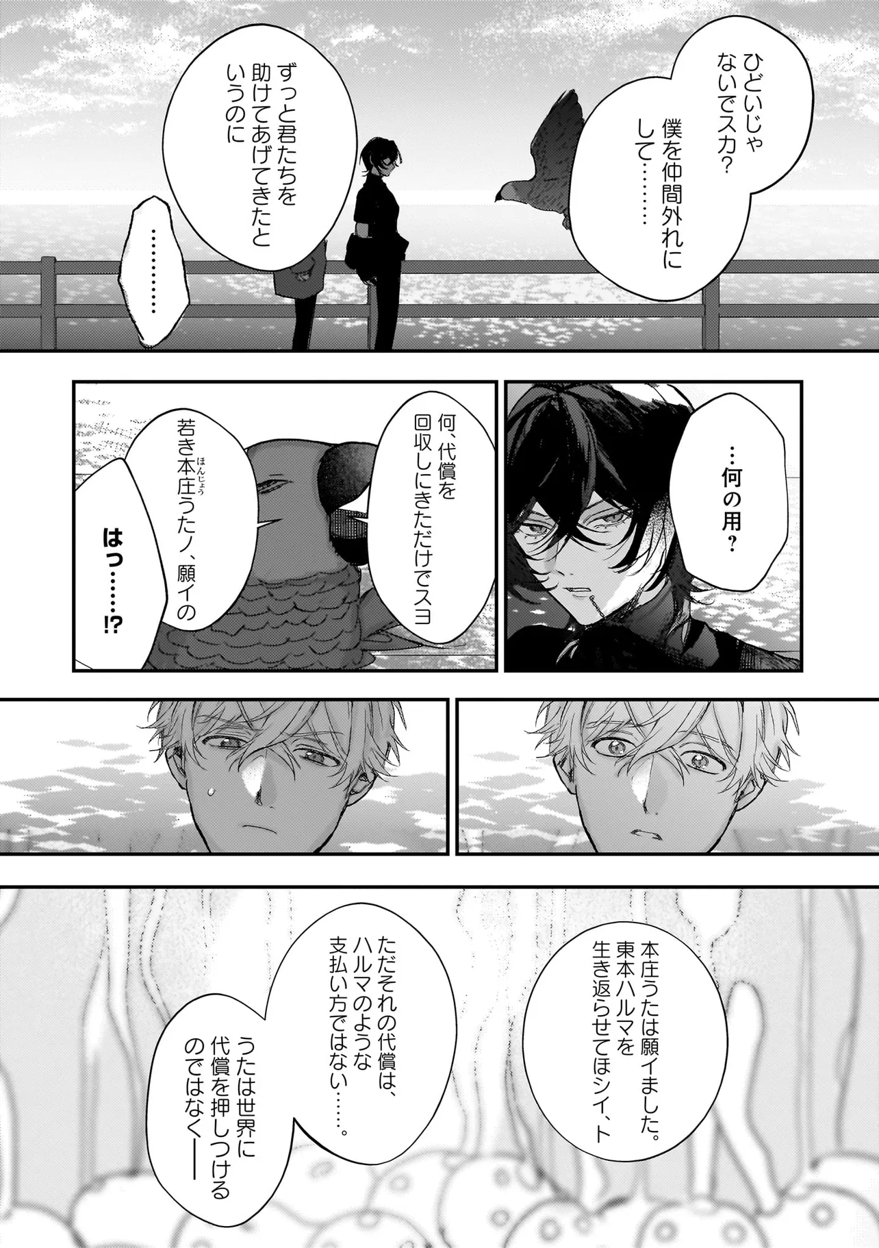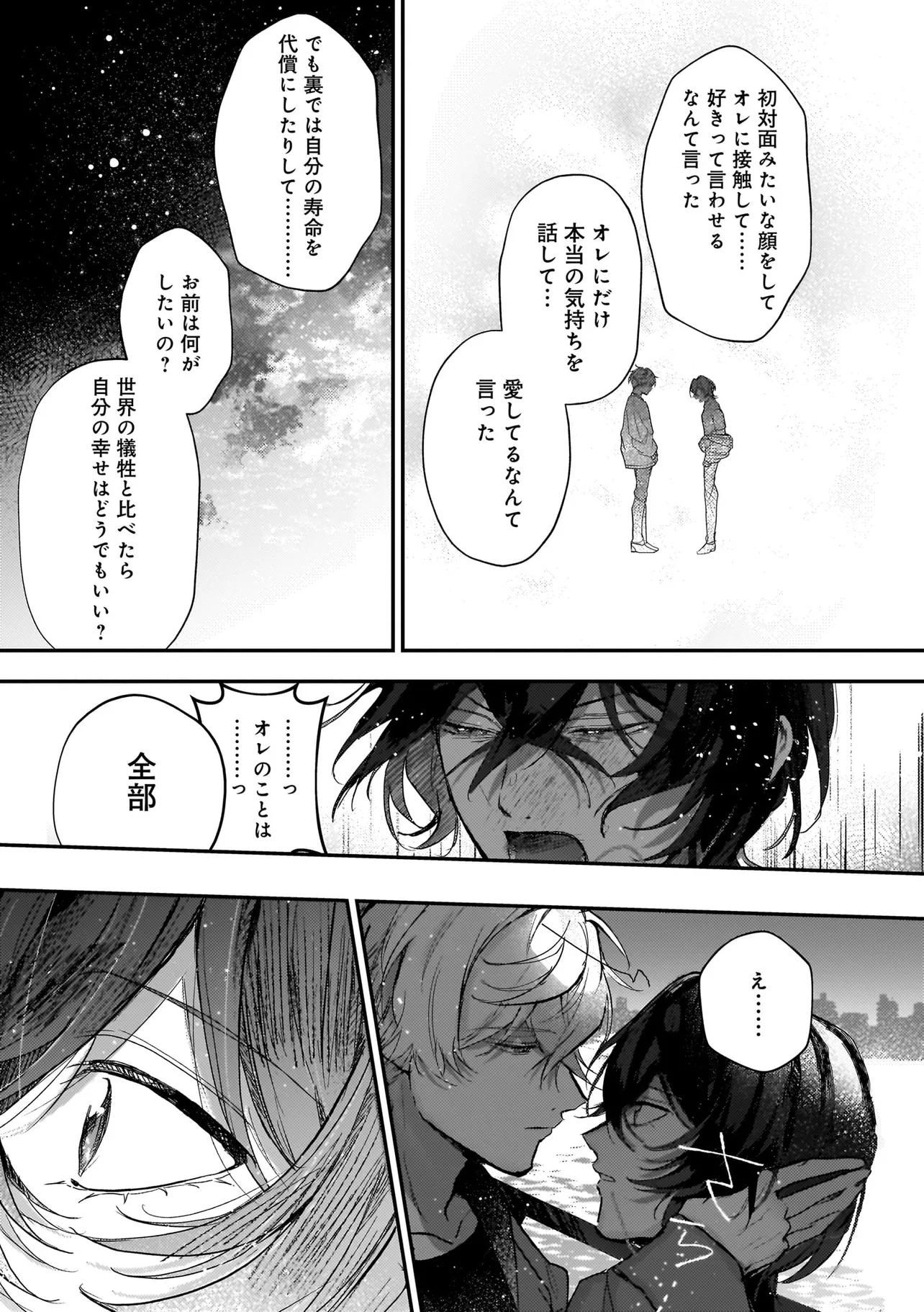 アイドルのコンサート中、ステージの上に突然降ってきた青年・ハルマ。 彼は肩に人語を話すオウムを乗せて「世界を書き換えて歌声を救った」と宣言。 そんな危険人物に怯えるどころか笑顔を向ける人気アイドル・うた。 「俺のこと好きって言わせてあげる」と何故かハルマに迫ってきて──!? 最低最悪の“推し”ラブに身を捧げる身勝手な男たちが、 最高のハッピーエンドへと疾走し、世界を破壊していく! 訳アリ人気アイドル×病み系元バンドマンのハチャメチャBLを召し上がれ。