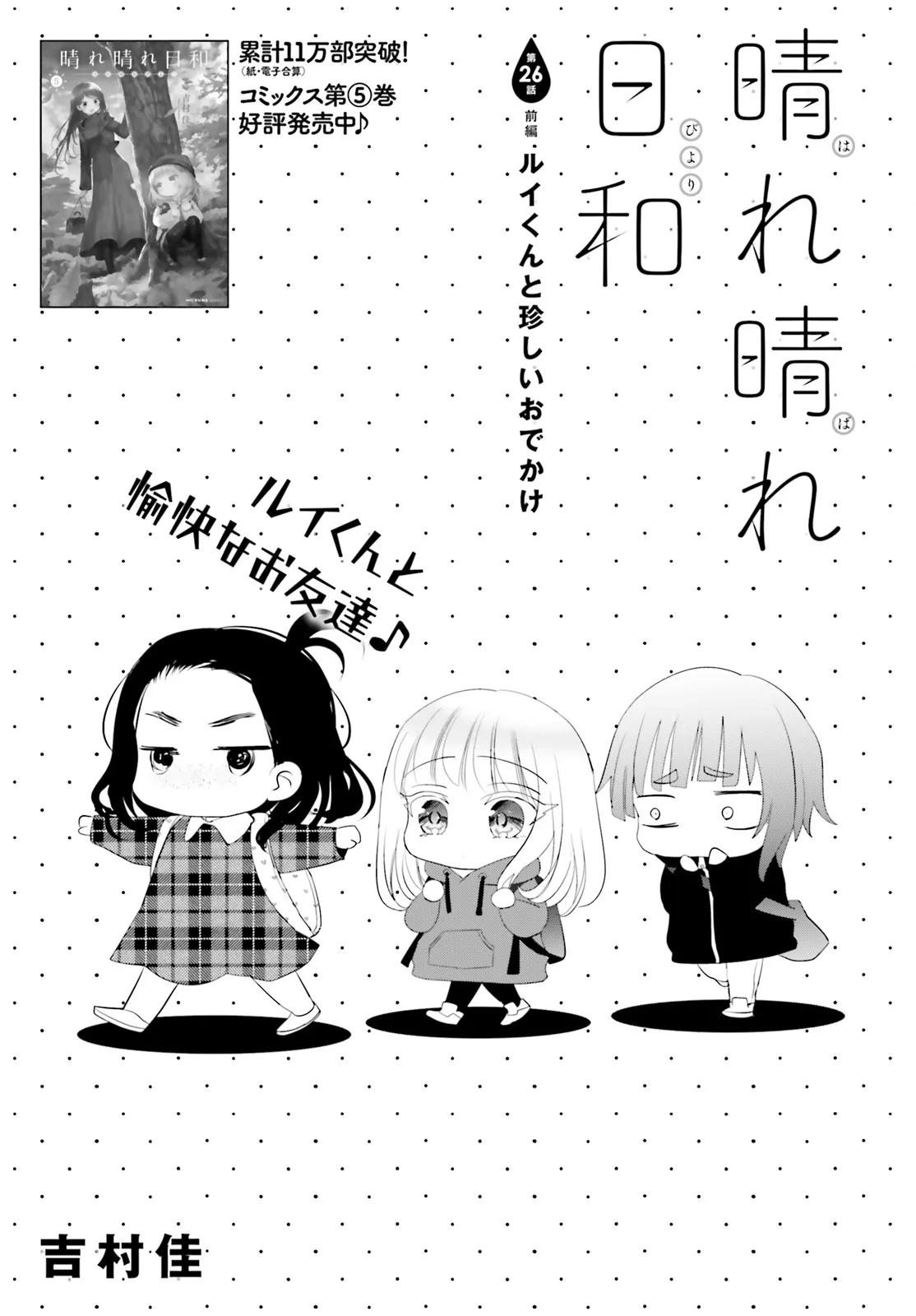 晴れ晴れ日和 第26話前編 ルイくんと珍しいおでかけ 晴れ晴れ日和 投稿者 admin - 1年 前に 幸せな読書漫画 晴れ晴れ日和 第26話前編 ルイくんと珍しいおでかけ , いいねと共有ボタンをクリックすることを忘れないでください. Manga 晴れ晴れ日和 常に更新されます 無料コミック Comic Top. 他のマンガの更新を読むことを忘れないでください。 マンガコレクションのリスト 無料コミック Comic Top マンガリストメニューにあります. お友達と共有しましょう! Facebook Twitter Pinterest Whatsapp 前のエピソード すべての章 次のエピソード リスト ページング Loading.. 前のエピソード すべての章 次のエピソード リスト ページング お友達と共有しましょう! Facebook Twitter Pinterest Whatsapp お気に入りに追加に続く 6 人 晴れ晴れ日和 ある日母親から再婚を告げられた千晴は相手の連れ子のルイと葬式で出会う。 育ての親の祖父を亡くしてひとりで生きると決めたルイと、そんなルイと一緒に暮らすことを決めた千晴。 義理の姉妹、ふたりぽっちの物語。 吉村佳(著者) OLコメディハートフル小学生