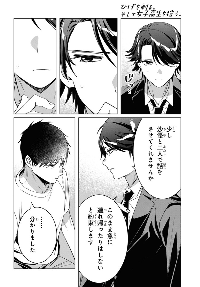 スピンオフコミック「ひげを剃る。そして女子高生を拾う。Each Stories」も連載中! https://seiga.nicovideo.jp/comic/52254 家出JK×26歳サラリーマン WEBで話題の大人気小説が満を持してコミカライズ! 5年間片想いした相手にバッサリ振られたサラリーマンの吉田。ヤケ酒した帰り道、路上に座り込む女子高生を見つけて……。「ヤラせてあげるから泊めて」「そういうことを冗談でも言うんじゃねえ」なし崩し的に始まった、JK・沙優との同居生活。家出JKと26歳サラリーマン、微妙な距離の二人が紡ぐ日常ラブコメディが開幕!!