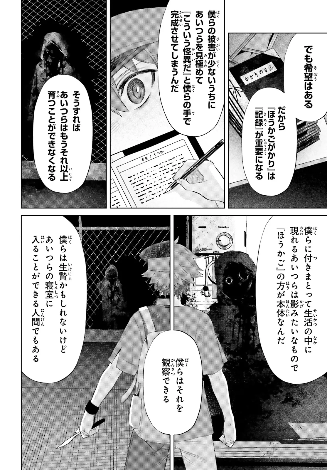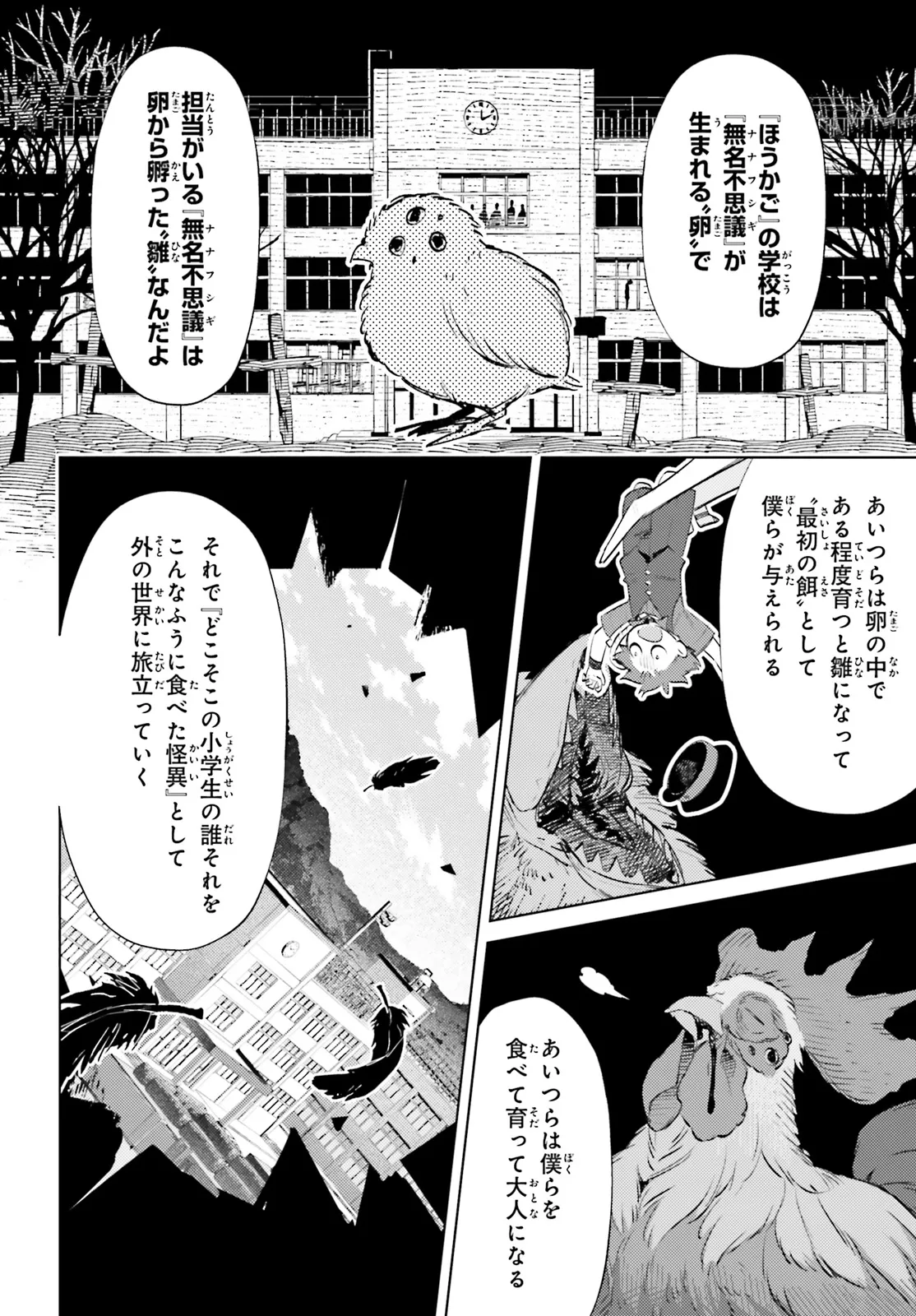 小学六年生の二森啓はある日、教室の黒板に突如として自分の名前が謎の係名と共に書き込まれているのを目撃する。 その日の深夜十二時、自室。学校のチャイムが鳴り響き、開いた襖の向こうには暗闇に囲まれた異次元の学校――「ほうかご」が広がっていた。 教室にはおぞましい怪異が跋扈し、校庭には無数の墓標が立ち並ぶ尋常ならざる空間に 啓は怪異の管理者にして観察者、「ほうかごがかり」の一人として招かれたという。 命がけの“観察”。6人の少年少女の恐怖と懊悩が「ほうかご」にこだまする。 鬼才・甲田学人が放つ“真夜中のメルヘン”、コミカライズ堂々開幕――
