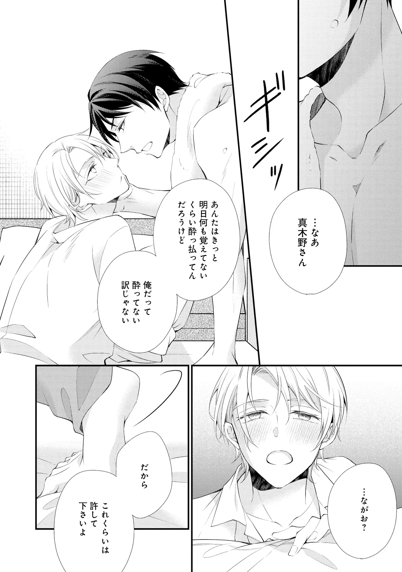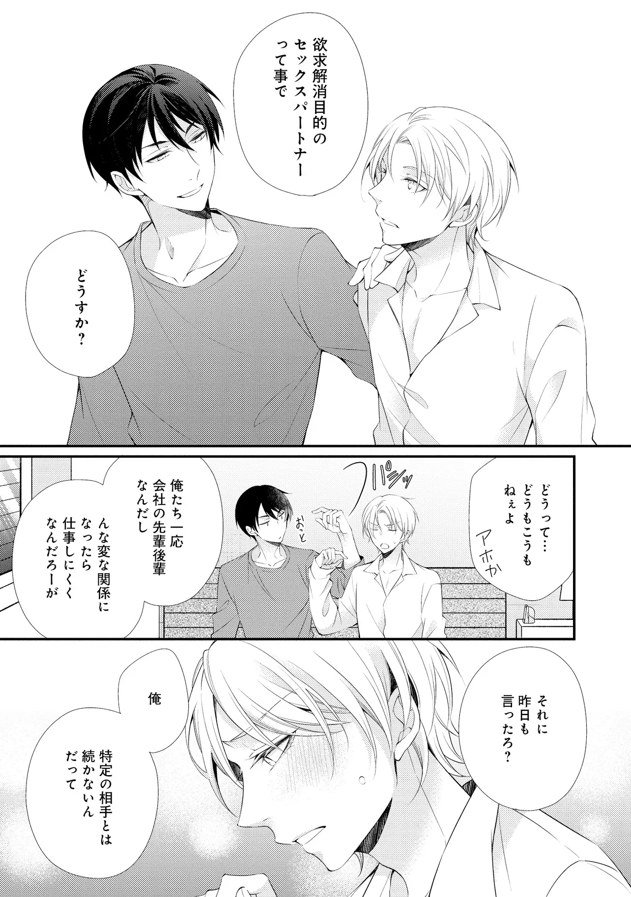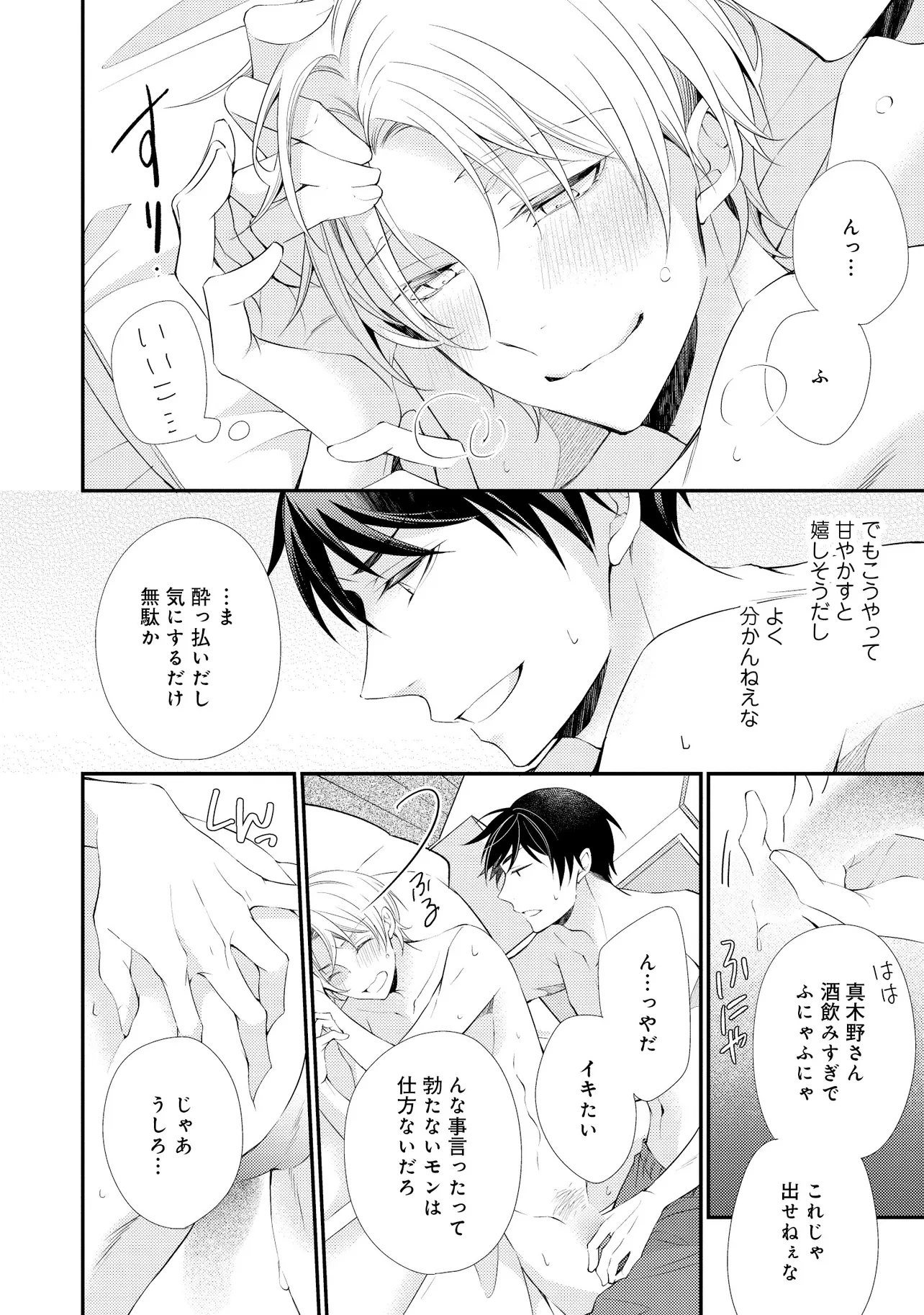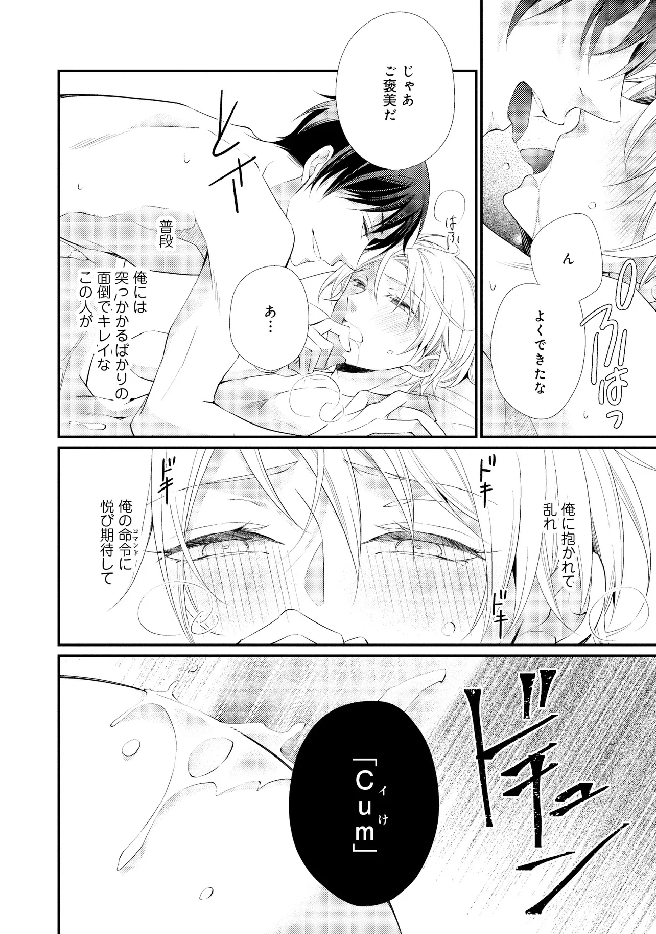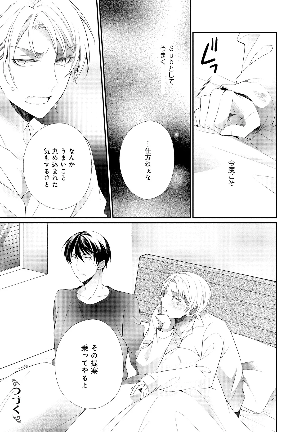 通勤中、電車内の中吊り広告をぼんやり眺めていた真木野。 それは『Sub用抑制剤』の新商品を宣伝するもので、パートナーのいないSubの欲求を手軽に解消するというもの。真木野自身もSubでしばらくパートナーがいない。そろそろ溜まってきたので試してみようかな…と考えていたところ突然、お尻に妙な違和感が…!!見知らぬDomからの痴漢だと気づいたがどうすることもできず、無理やりコマンドを使われてしまう。気持ち悪さを感じながらも逆らえず、このまま襲われてしまう――と思った寸でのところに別のDom男性が異変に気付き、助けてくれた。その後なんとか出社した真木野のもとに、部長が新しく赴任してきた人を紹介すると連れてきた。その人物はなんと、先程自分を救ってくれた男性で――…!?