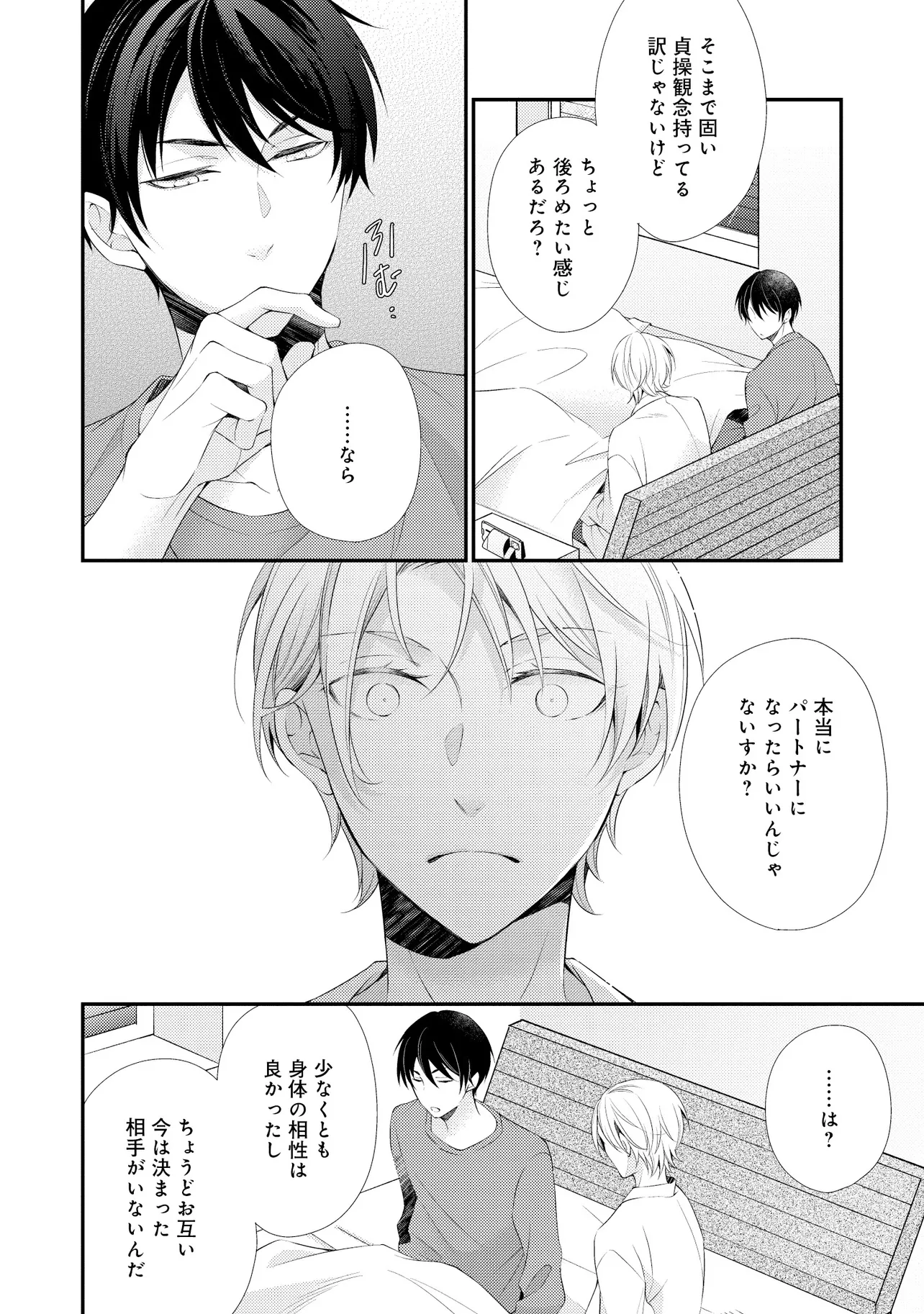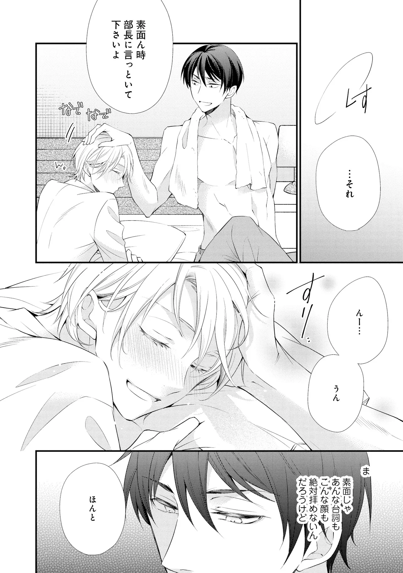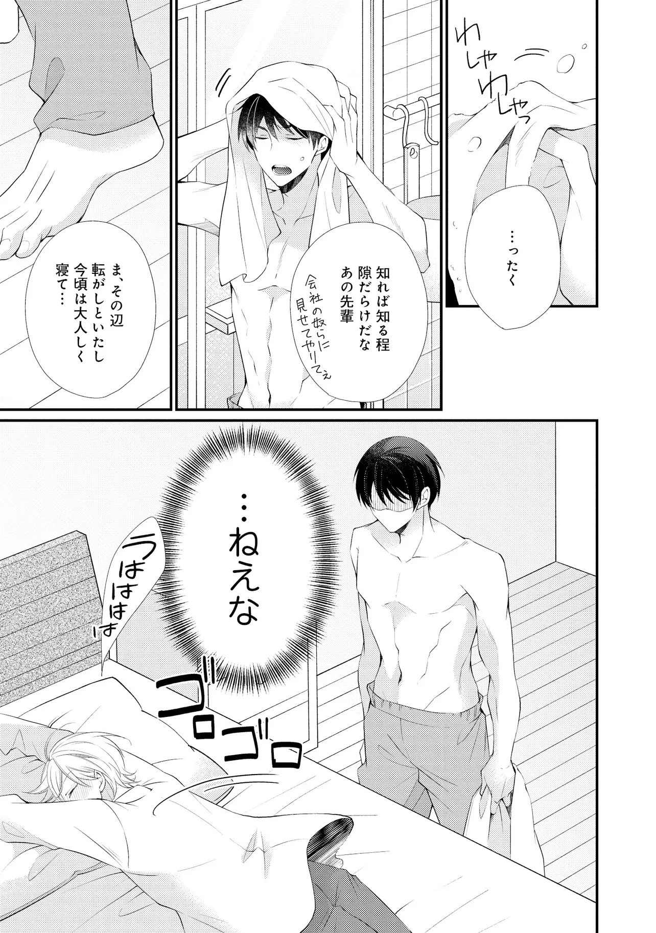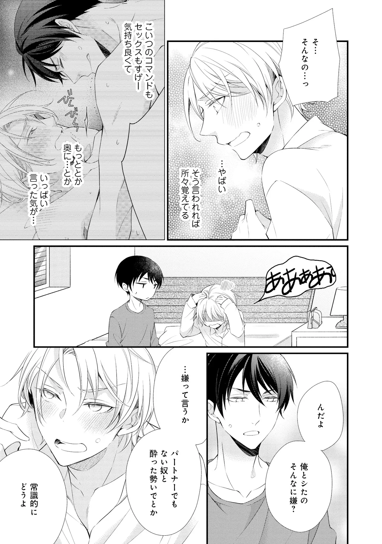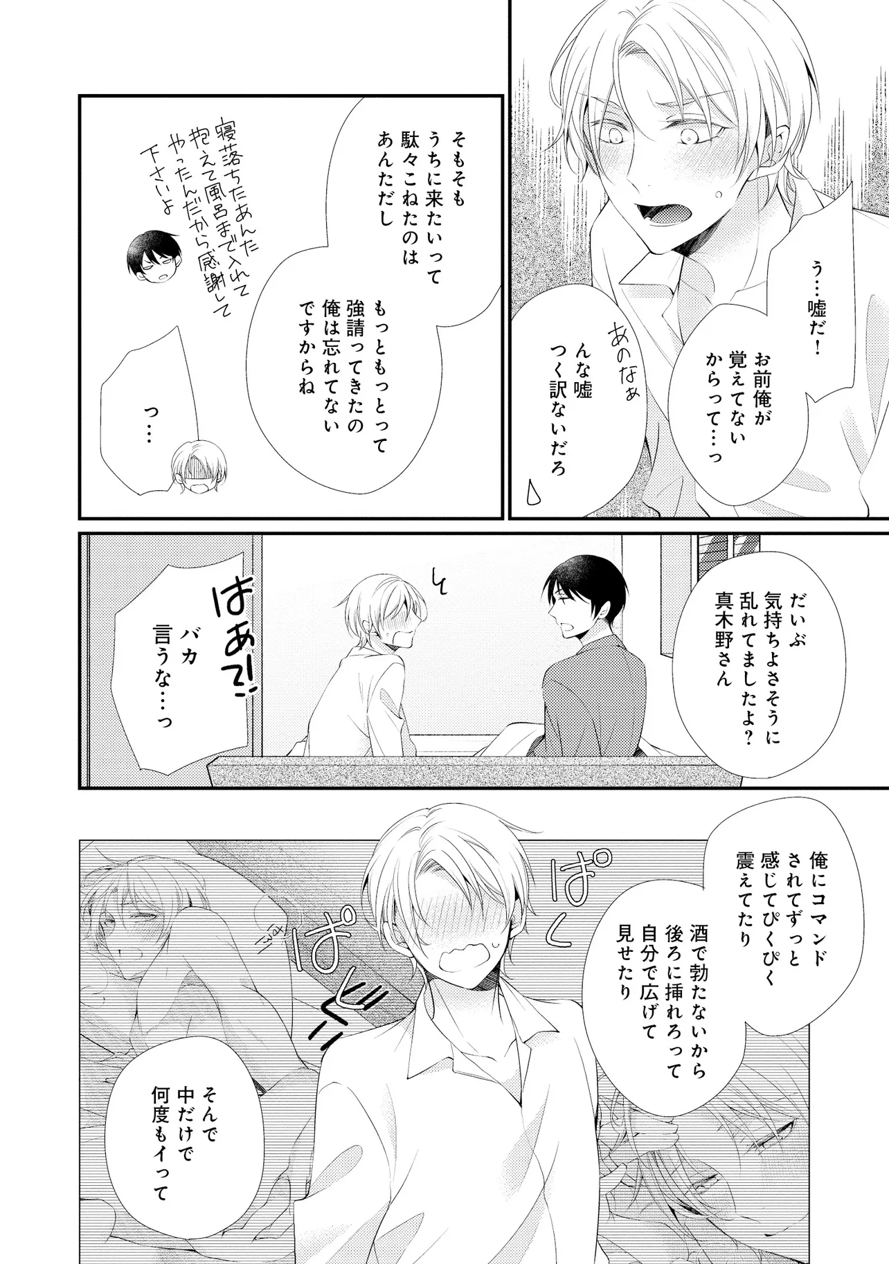 通勤中、電車内の中吊り広告をぼんやり眺めていた真木野。 それは『Sub用抑制剤』の新商品を宣伝するもので、パートナーのいないSubの欲求を手軽に解消するというもの。真木野自身もSubでしばらくパートナーがいない。そろそろ溜まってきたので試してみようかな…と考えていたところ突然、お尻に妙な違和感が…!!見知らぬDomからの痴漢だと気づいたがどうすることもできず、無理やりコマンドを使われてしまう。気持ち悪さを感じながらも逆らえず、このまま襲われてしまう――と思った寸でのところに別のDom男性が異変に気付き、助けてくれた。その後なんとか出社した真木野のもとに、部長が新しく赴任してきた人を紹介すると連れてきた。その人物はなんと、先程自分を救ってくれた男性で――…!?