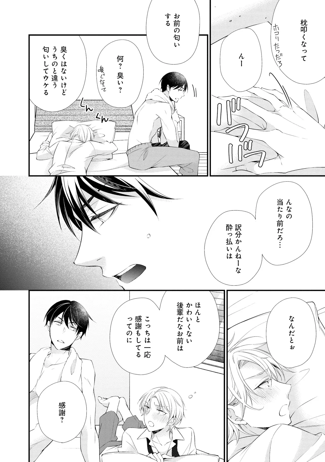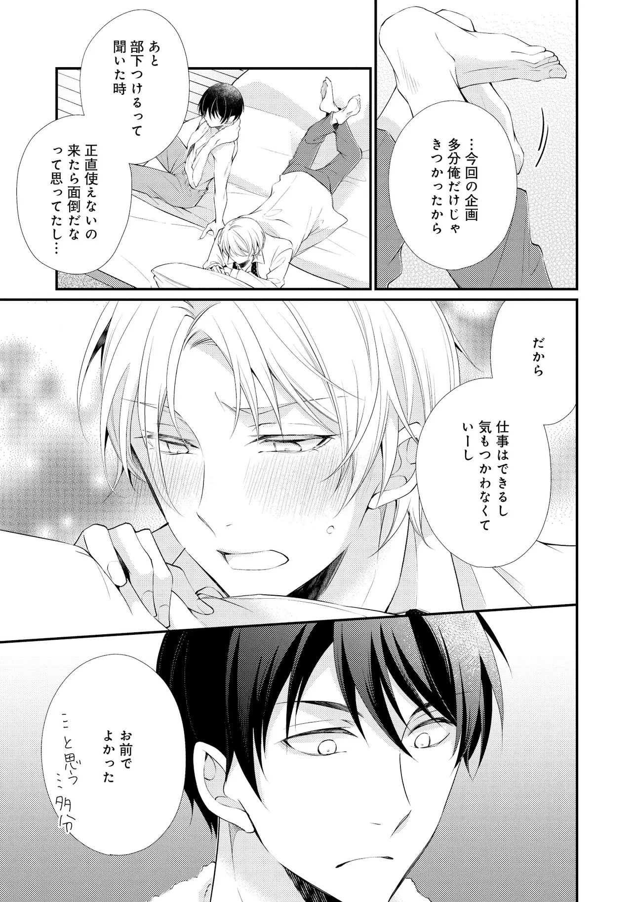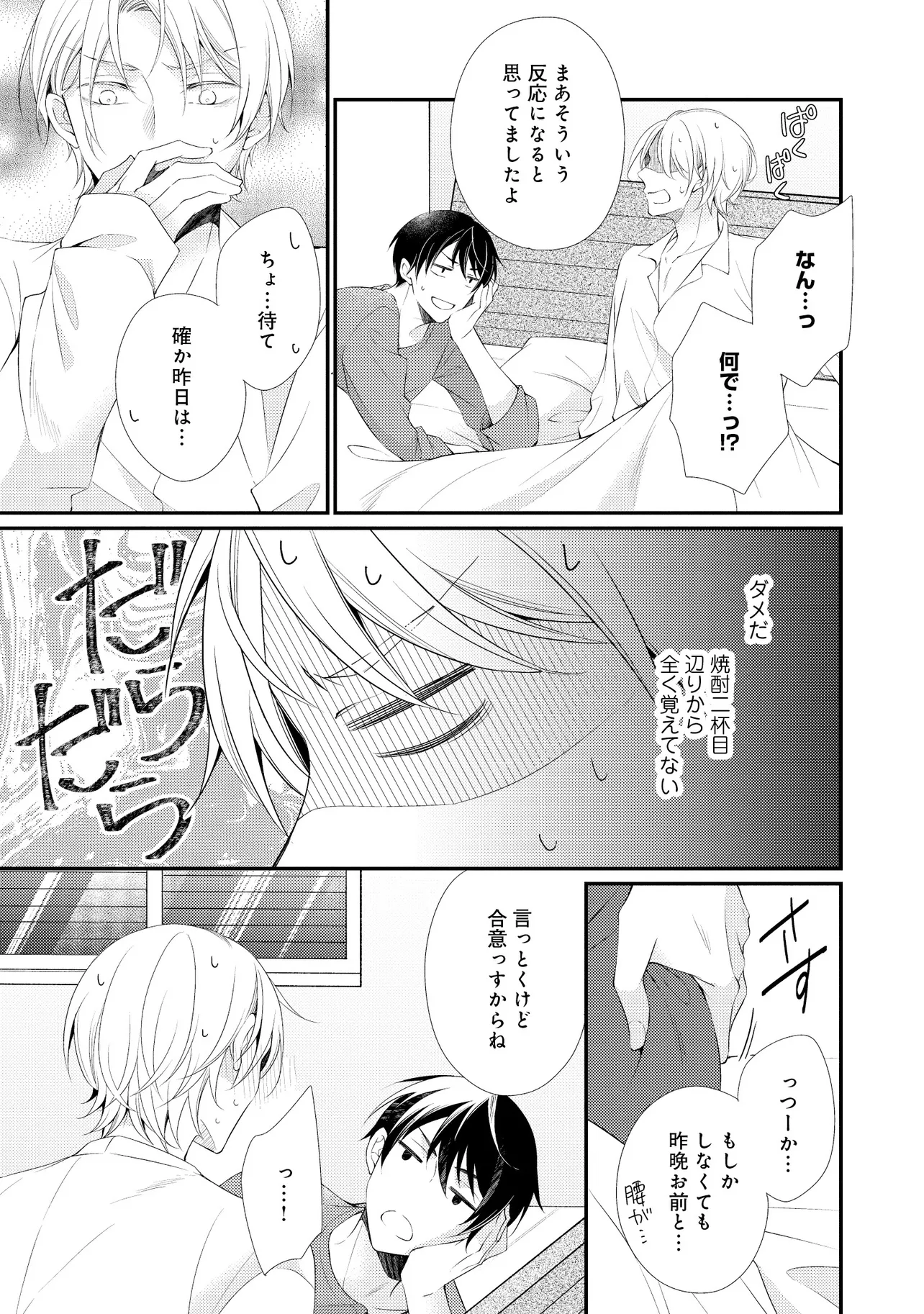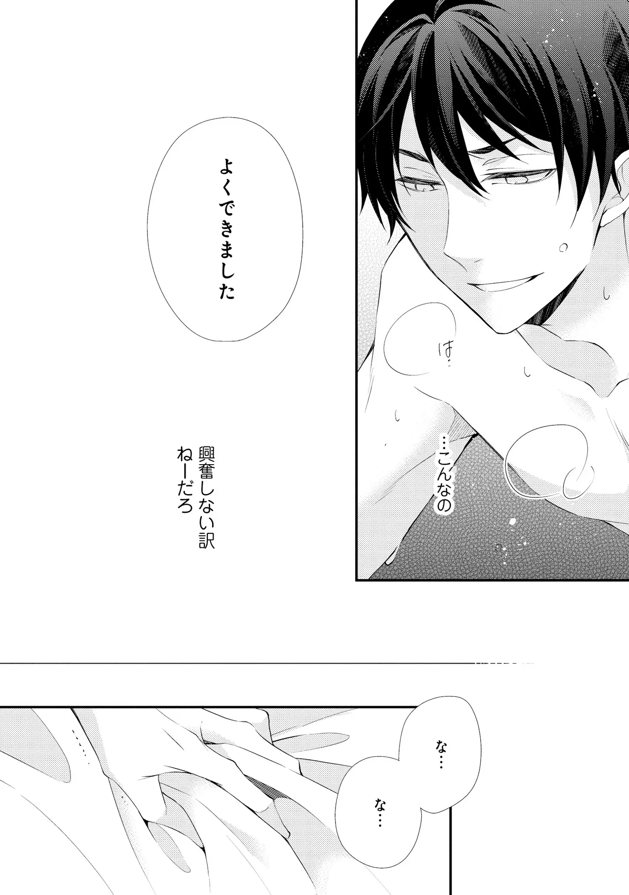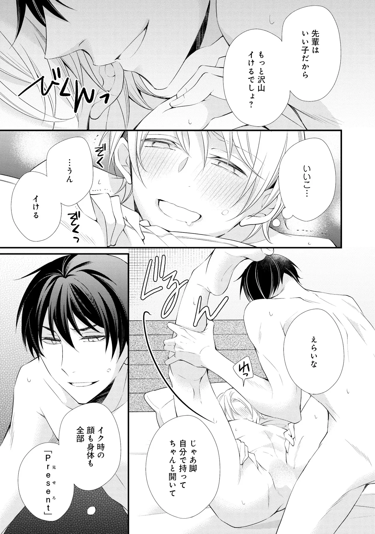 通勤中、電車内の中吊り広告をぼんやり眺めていた真木野。 それは『Sub用抑制剤』の新商品を宣伝するもので、パートナーのいないSubの欲求を手軽に解消するというもの。真木野自身もSubでしばらくパートナーがいない。そろそろ溜まってきたので試してみようかな…と考えていたところ突然、お尻に妙な違和感が…!!見知らぬDomからの痴漢だと気づいたがどうすることもできず、無理やりコマンドを使われてしまう。気持ち悪さを感じながらも逆らえず、このまま襲われてしまう――と思った寸でのところに別のDom男性が異変に気付き、助けてくれた。その後なんとか出社した真木野のもとに、部長が新しく赴任してきた人を紹介すると連れてきた。その人物はなんと、先程自分を救ってくれた男性で――…!?