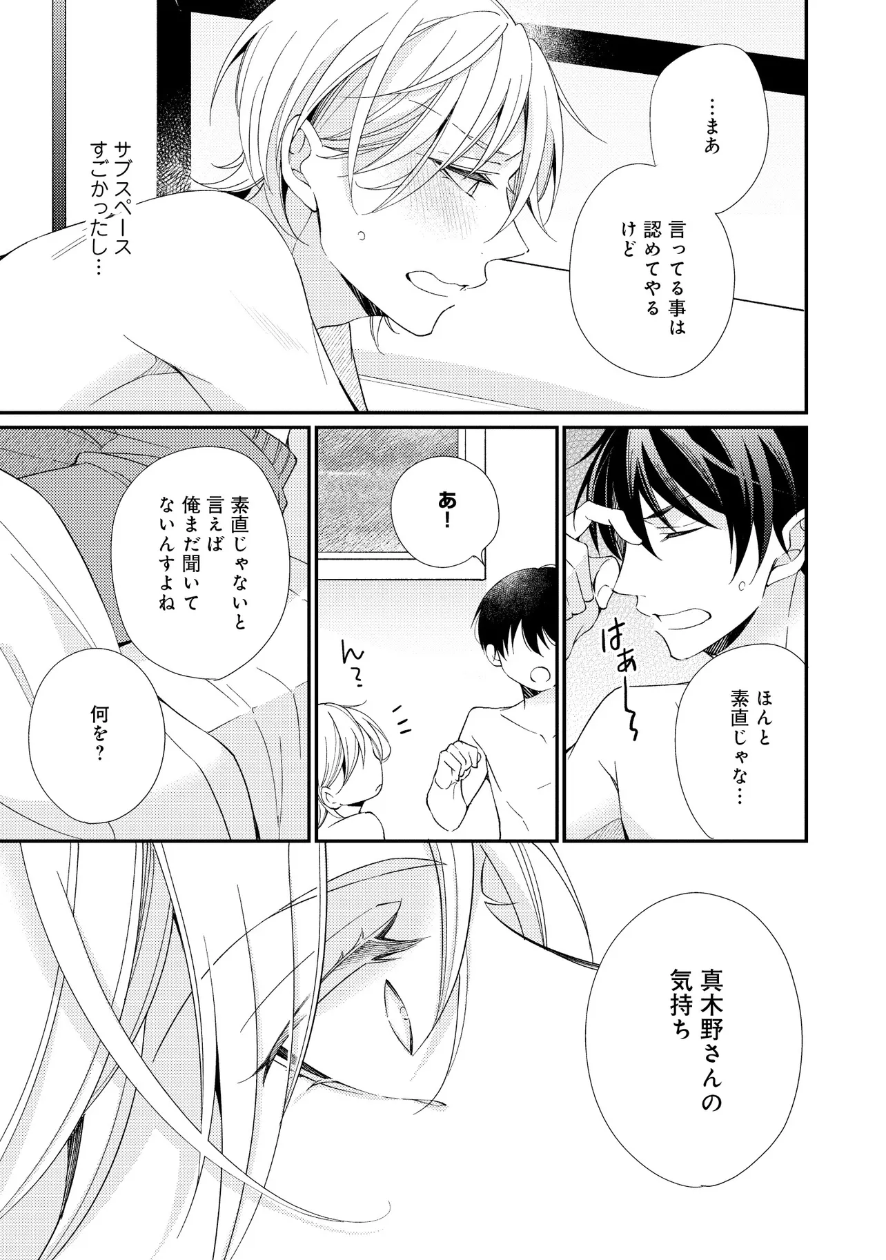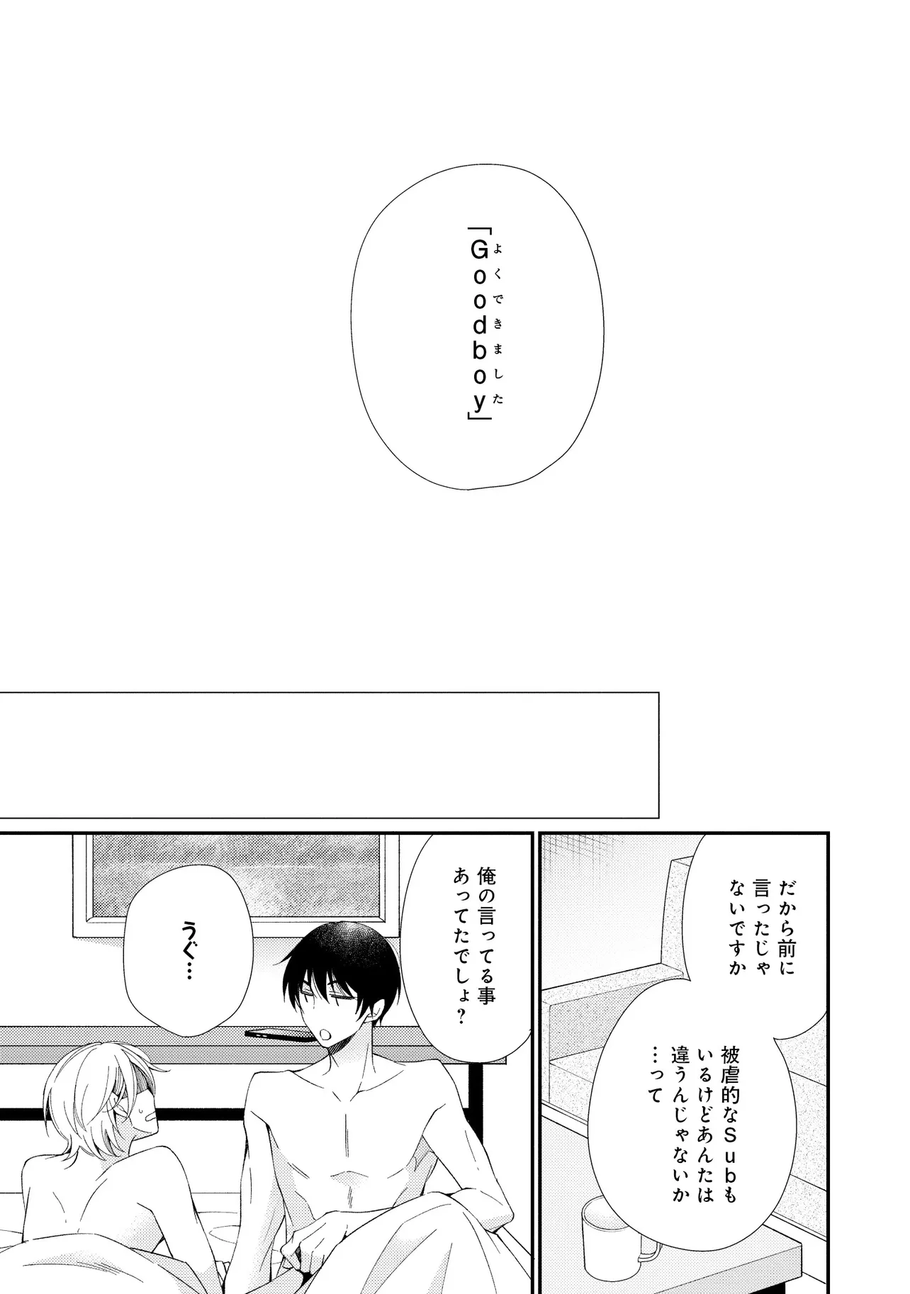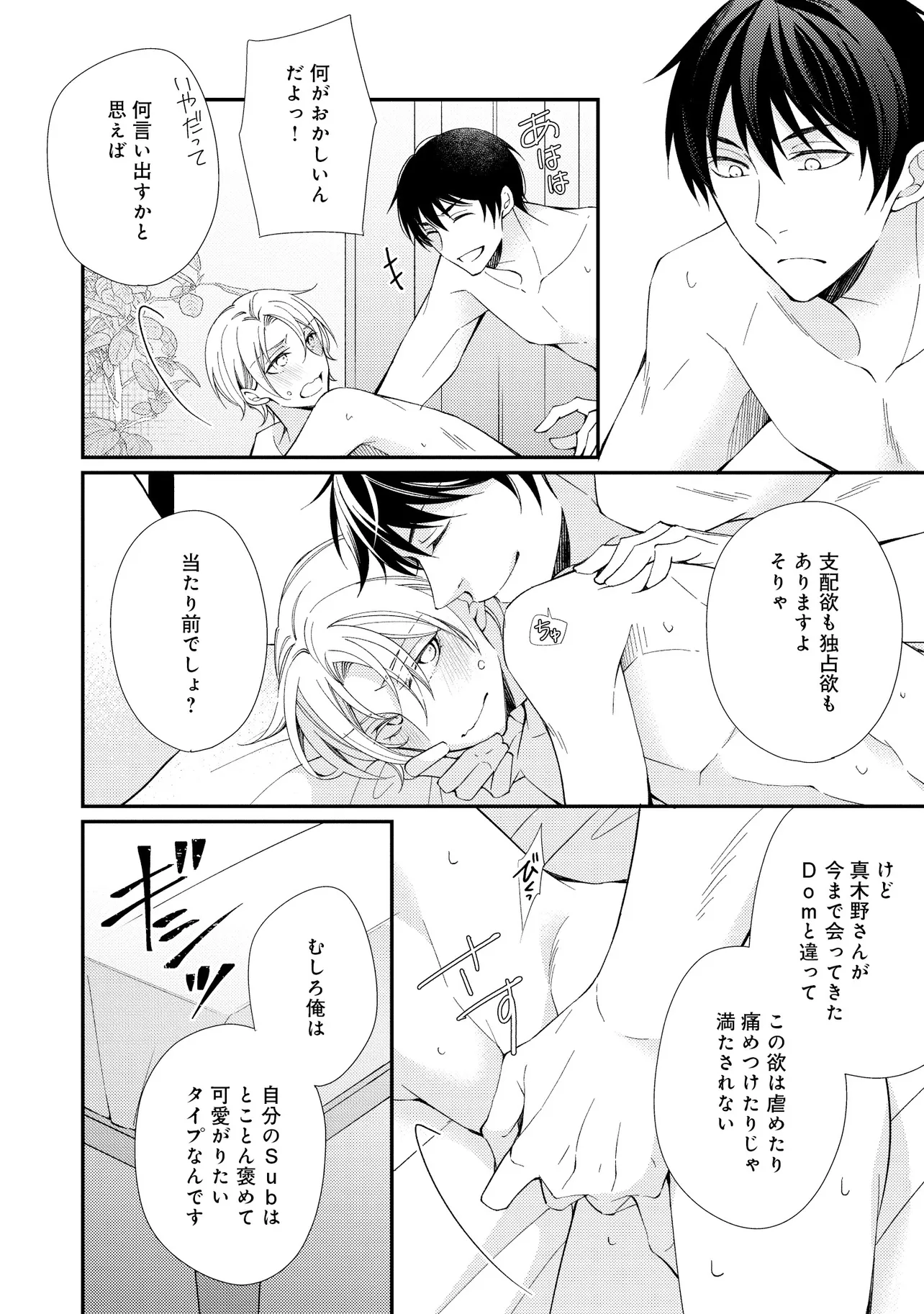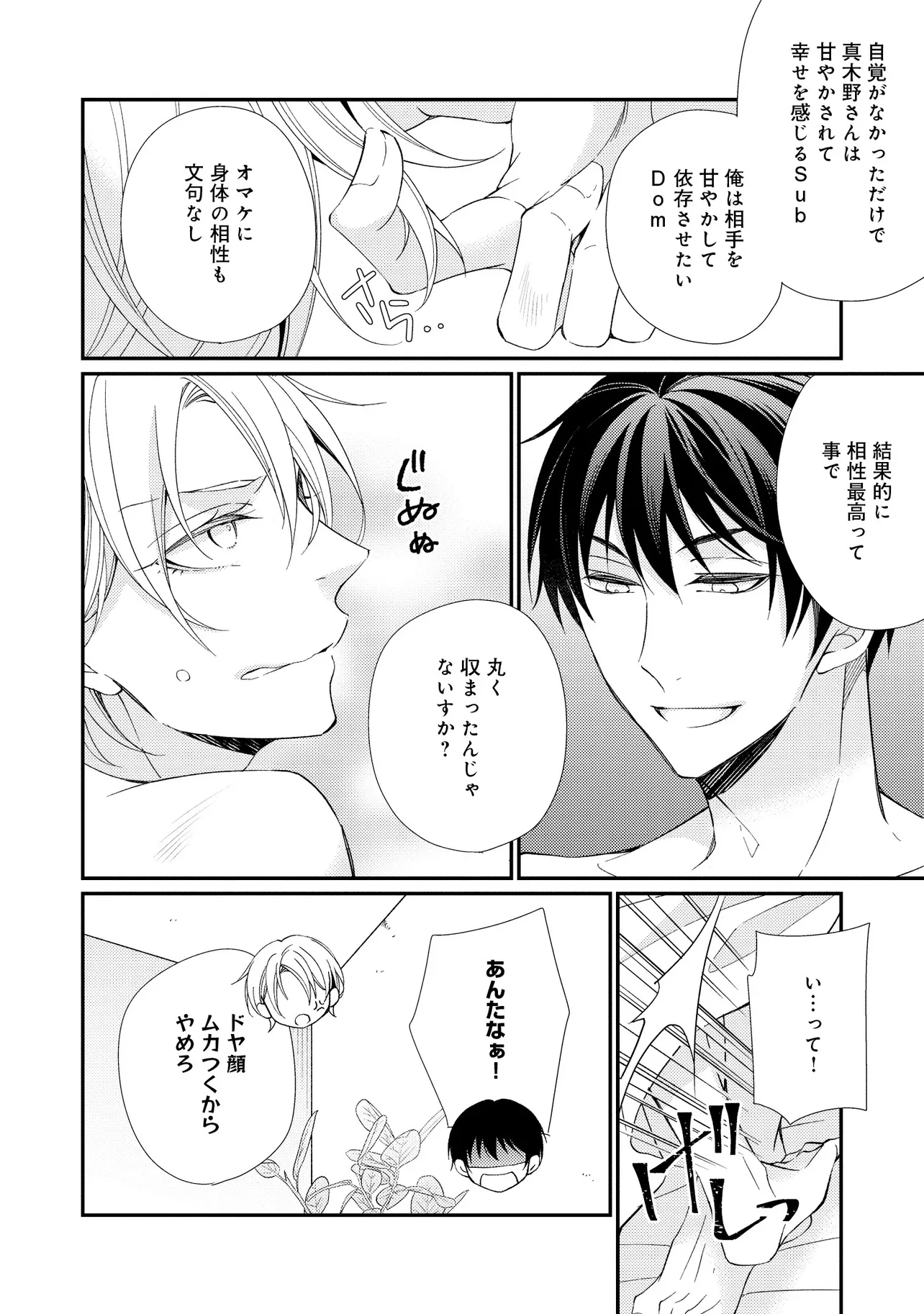 通勤中、電車内の中吊り広告をぼんやり眺めていた真木野。 それは『Sub用抑制剤』の新商品を宣伝するもので、パートナーのいないSubの欲求を手軽に解消するというもの。真木野自身もSubでしばらくパートナーがいない。そろそろ溜まってきたので試してみようかな…と考えていたところ突然、お尻に妙な違和感が…!!見知らぬDomからの痴漢だと気づいたがどうすることもできず、無理やりコマンドを使われてしまう。気持ち悪さを感じながらも逆らえず、このまま襲われてしまう――と思った寸でのところに別のDom男性が異変に気付き、助けてくれた。その後なんとか出社した真木野のもとに、部長が新しく赴任してきた人を紹介すると連れてきた。その人物はなんと、先程自分を救ってくれた男性で――…!?