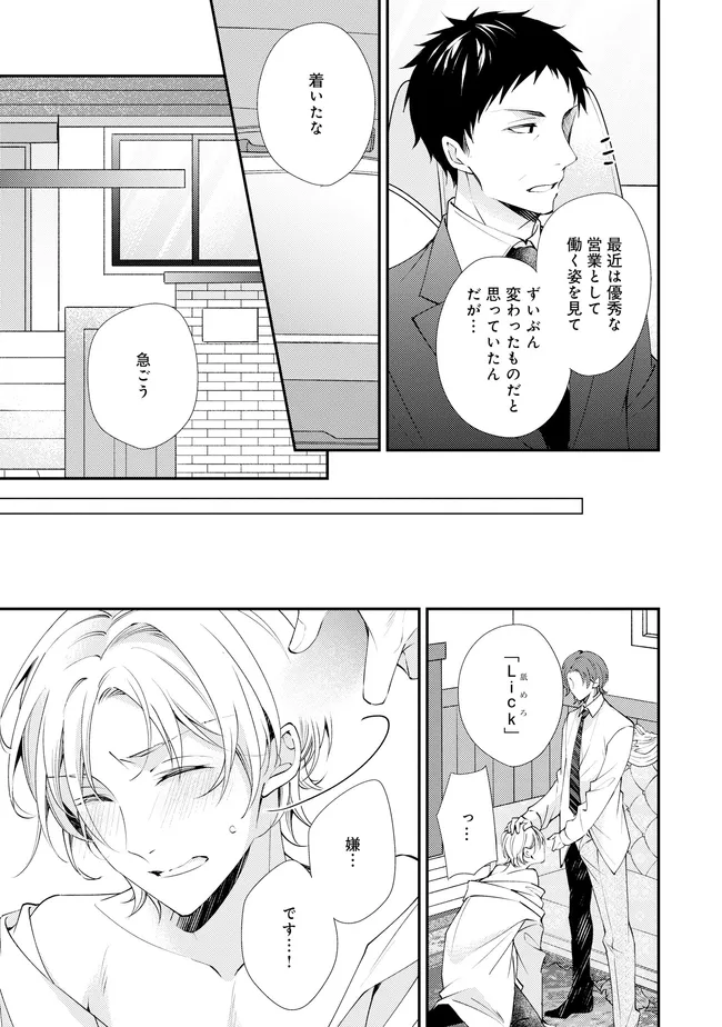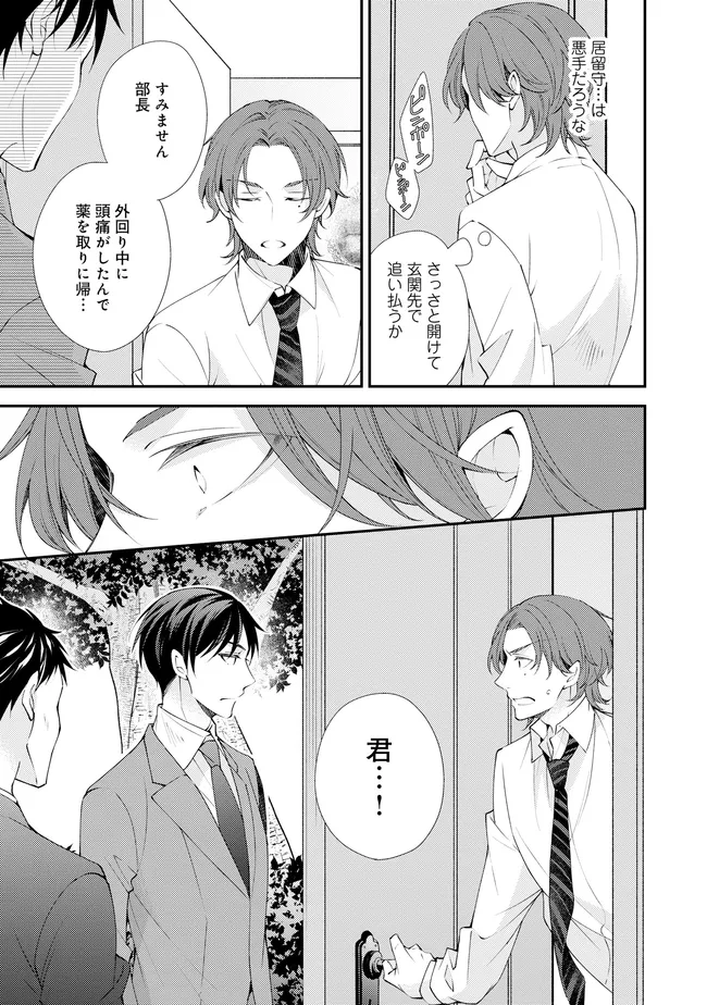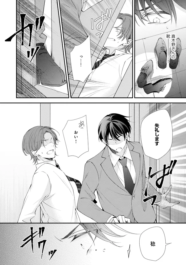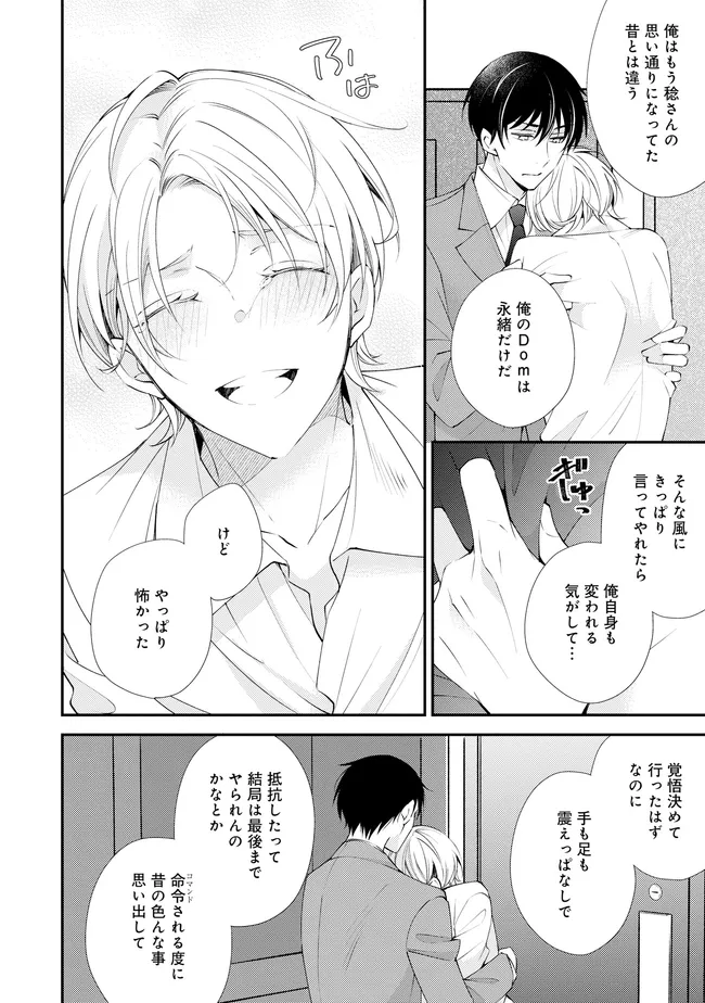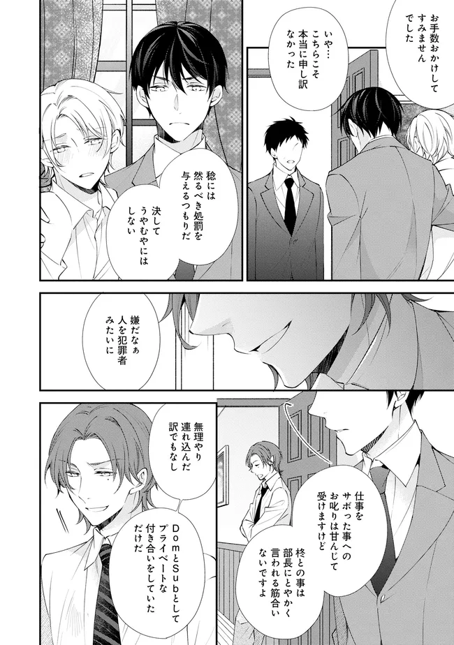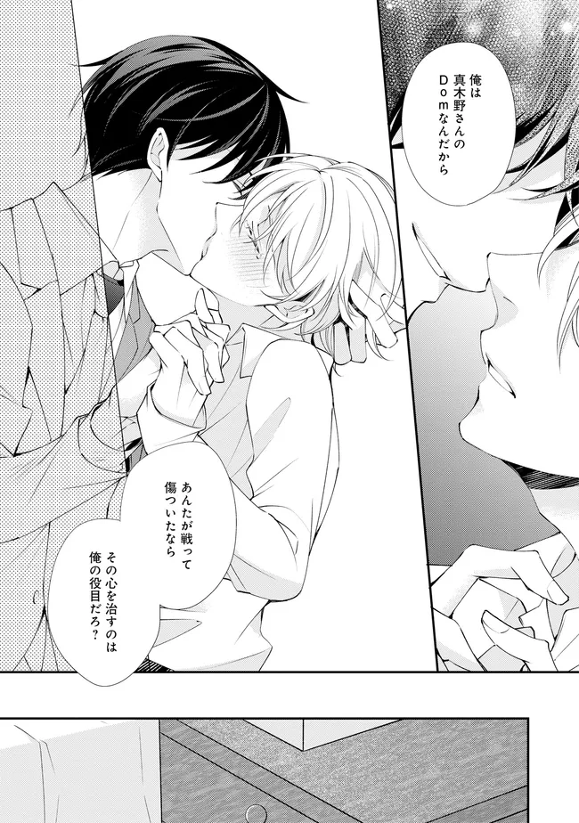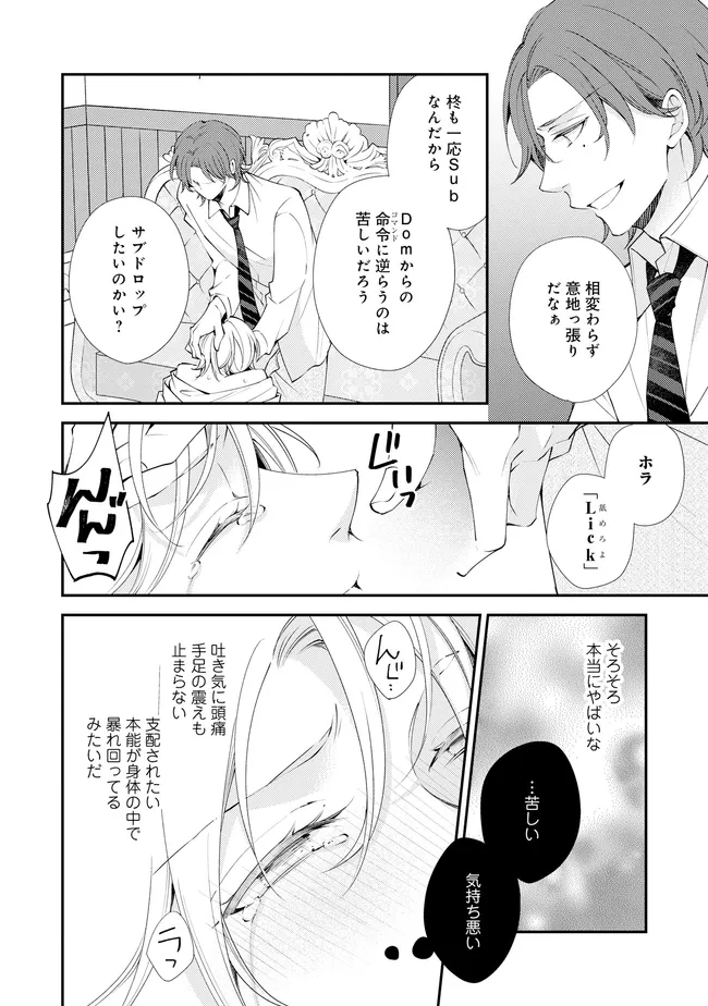 通勤中、電車内の中吊り広告をぼんやり眺めていた真木野。 それは『Sub用抑制剤』の新商品を宣伝するもので、パートナーのいないSubの欲求を手軽に解消するというもの。真木野自身もSubでしばらくパートナーがいない。そろそろ溜まってきたので試してみようかな…と考えていたところ突然、お尻に妙な違和感が…!!見知らぬDomからの痴漢だと気づいたがどうすることもできず、無理やりコマンドを使われてしまう。気持ち悪さを感じながらも逆らえず、このまま襲われてしまう――と思った寸でのところに別のDom男性が異変に気付き、助けてくれた。その後なんとか出社した真木野のもとに、部長が新しく赴任してきた人を紹介すると連れてきた。その人物はなんと、先程自分を救ってくれた男性で――…!?