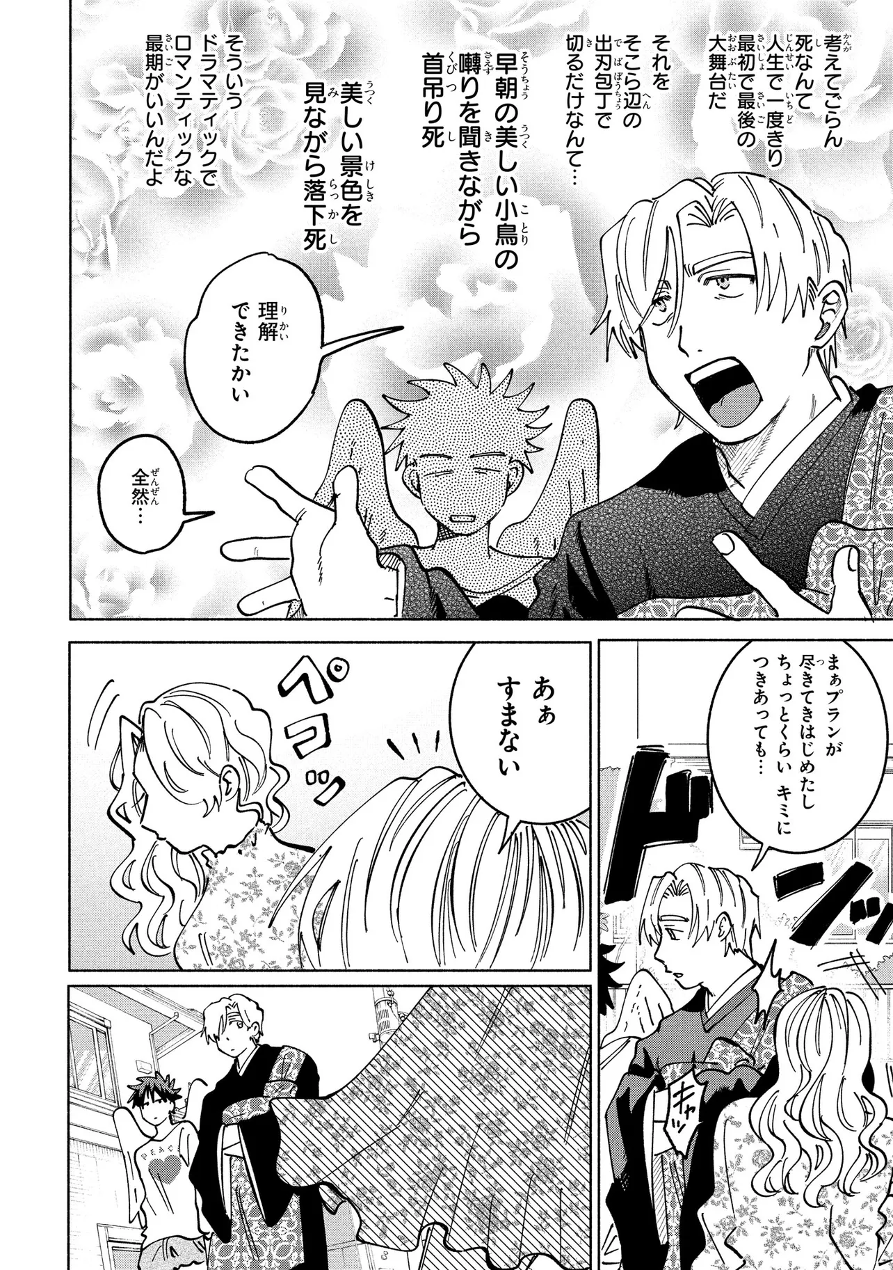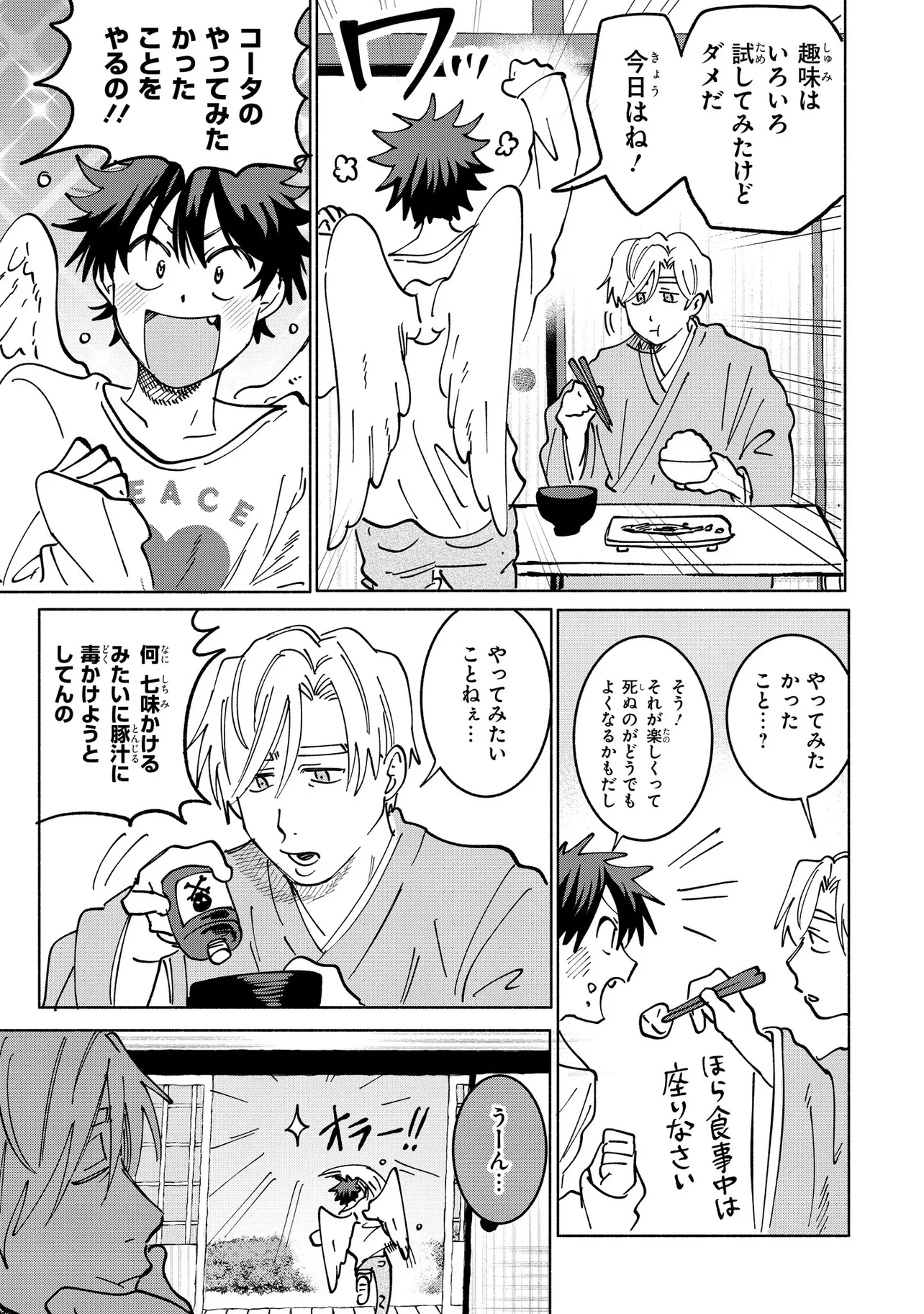 死にたがりの不良坊主×あほ天使 僕の最期は僕が決める!! 死に様模索コメディBL☆ 坊主コータは死のうとしていた。 コータは寺に生まれ、イケメンであり家も裕福という、何も不満のないイージーな人生を送ってきたが、先日余命わずかと言われ、世を儚んで死のうと決意したのだ。しかしそこに天使ピンちゃんが突如現れ、「コータを生かしに来たんだよ!」と宣言する。コータは死に方を、天使はコータの生き方を模索することに。攻防を繰り広げているふたりが家に帰ってきたところ、強盗事件の埋蔵金小判が庭から発見され――!?
